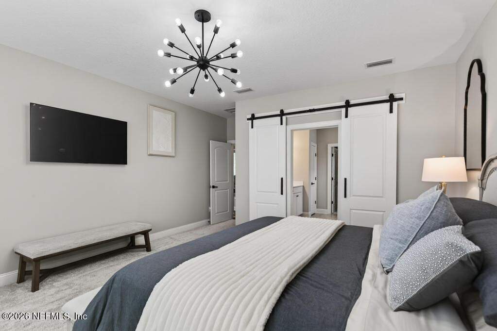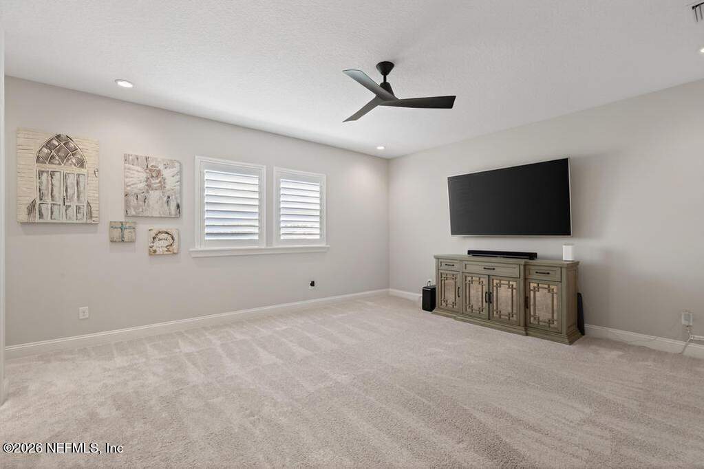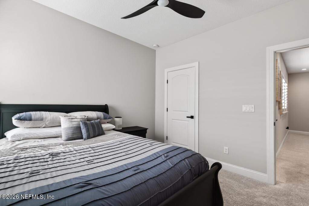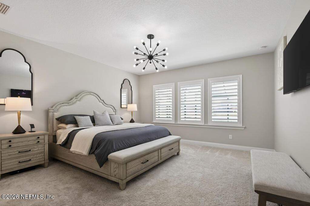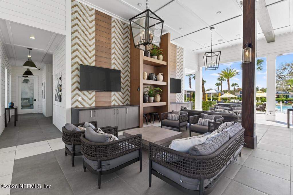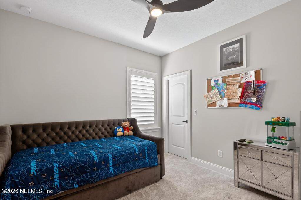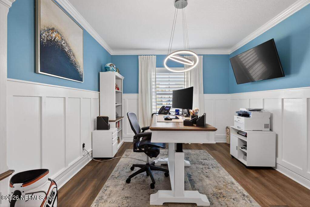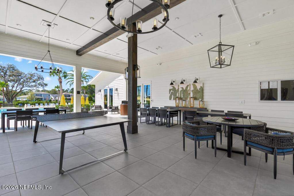 Built in 2023 by Toll Brothers in Bartram Ranch, this upgraded 2,893 sq ft home offers 4 bedrooms and 3.5 baths with refined design and luxury touches. The backyard is a showpiece with water views, custom saltwater pool and spa, built-in firepit, and expansive screened enclosure with 1,026 sq ft of sealed pavers for entertaining. Interior upgrades include LVP flooring, plantation shutters, designer lighting, wood feature walls, wainscoting, private office with frameless glass doors, and built-in closet systems. Kitchen features Whirlpool stainless appliances, gas cooktop, pull-out cabinetry, backsplash, and under/over cabinet lighting. Patio is gas-plumbed for a future outdoor kitchen. Amenities include pool, fitness center, dog park and recreation center.