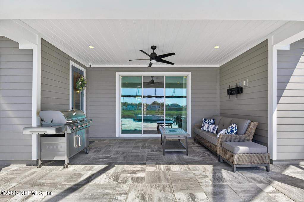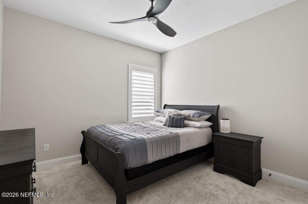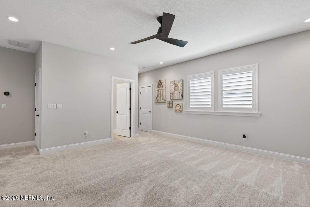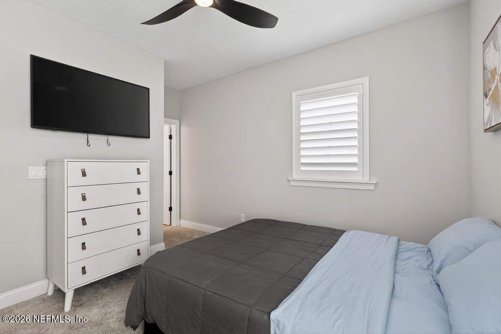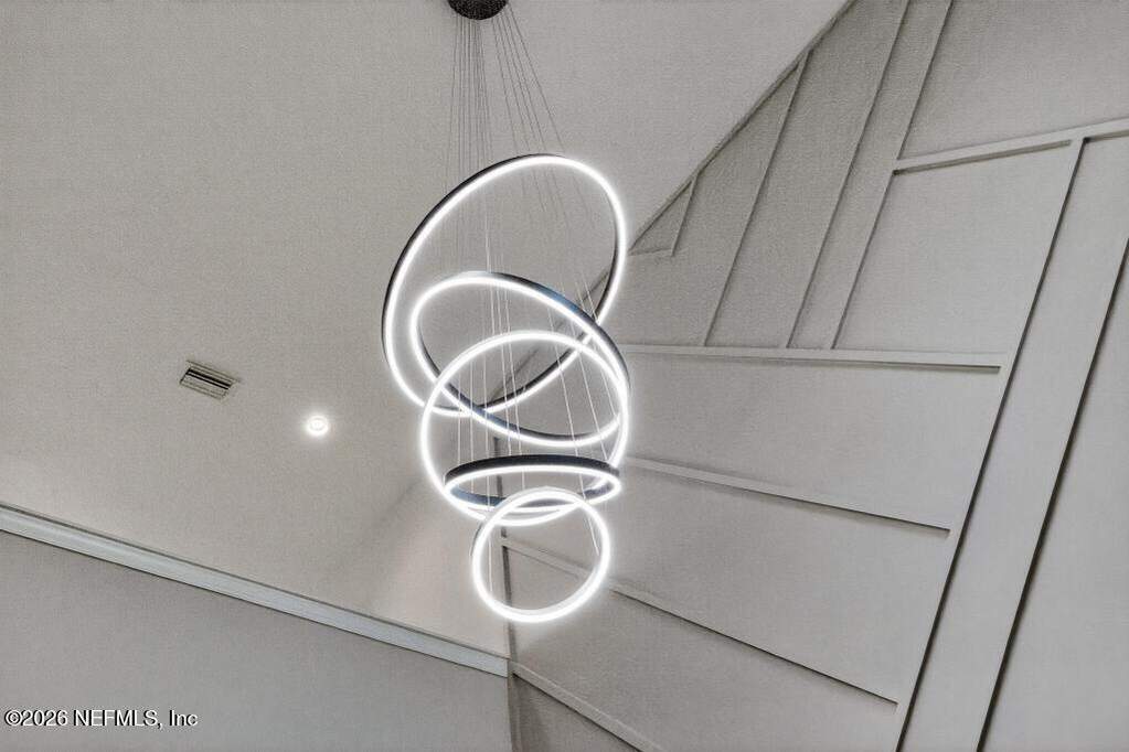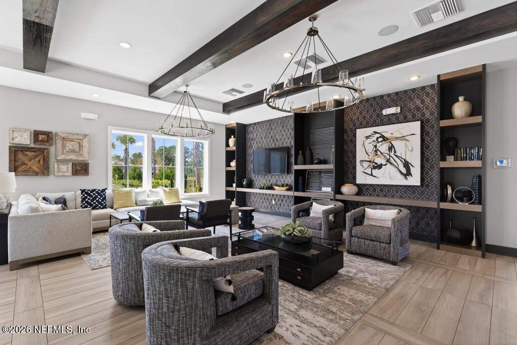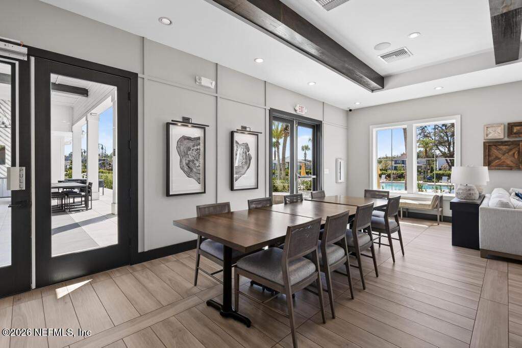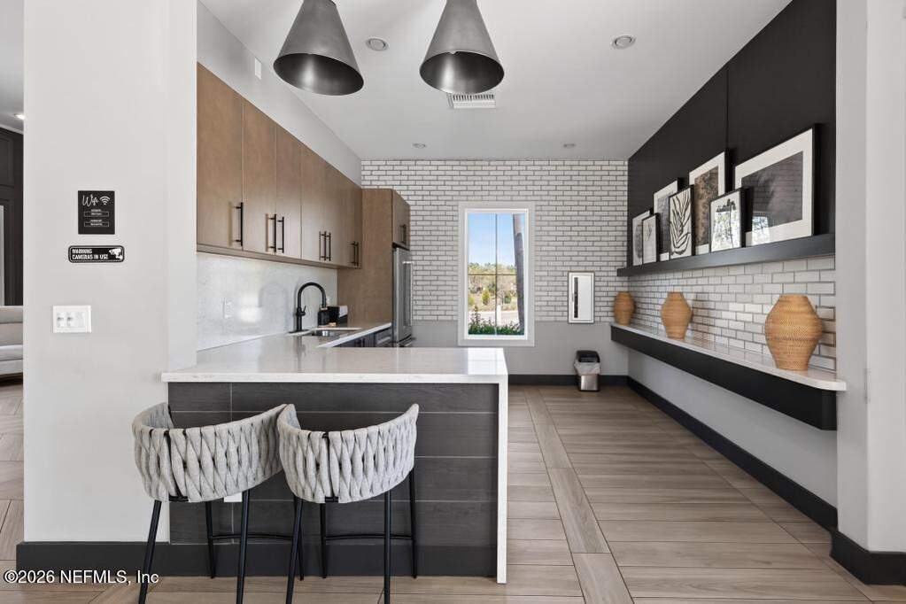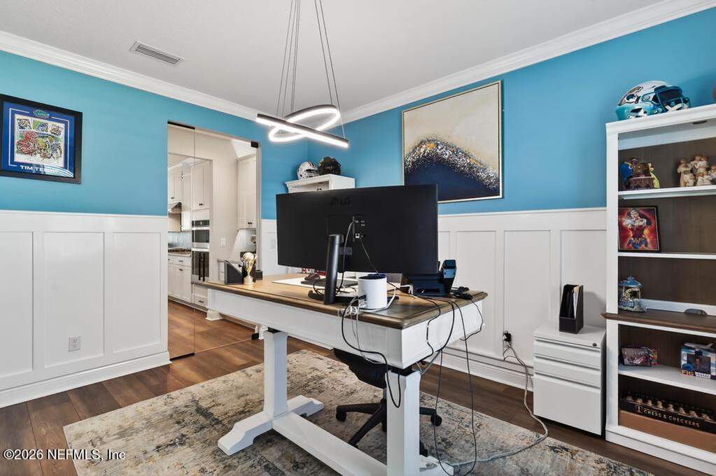 Built in 2023 by Toll Brothers in Bartram Ranch, this upgraded 2,893 sq ft home offers 4 bedrooms and 3.5 baths with refined design and luxury touches. The backyard is a showpiece with water views, custom saltwater pool and spa, built-in firepit, and expansive screened enclosure with 1,026 sq ft of sealed pavers for entertaining. Interior upgrades include LVP flooring, plantation shutters, designer lighting, wood feature walls, wainscoting, private office with frameless glass doors, and built-in closet systems. Kitchen features Whirlpool stainless appliances, gas cooktop, pull-out cabinetry, backsplash, and under/over cabinet lighting. Patio is gas-plumbed for a future outdoor kitchen. Amenities include pool, fitness center, dog park and recreation center.
