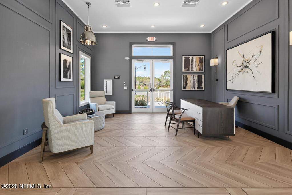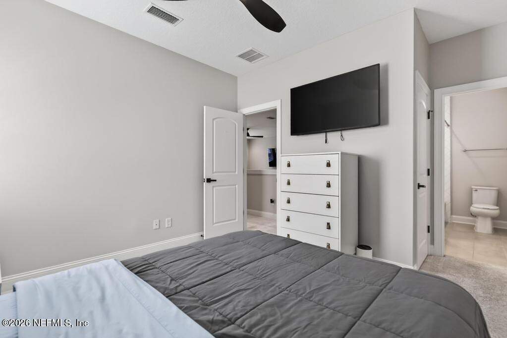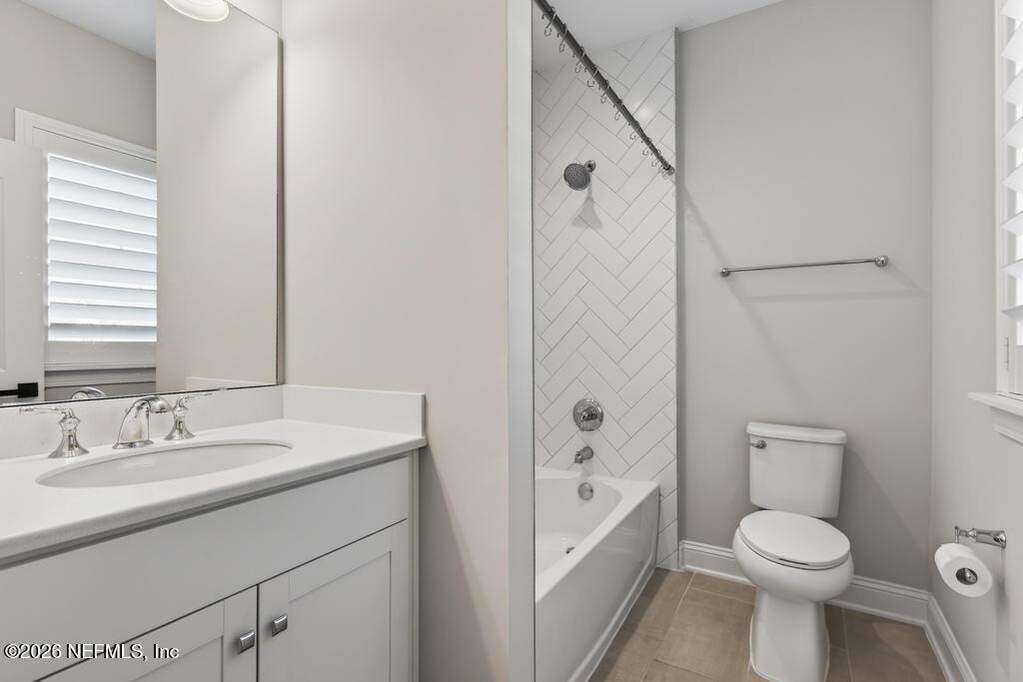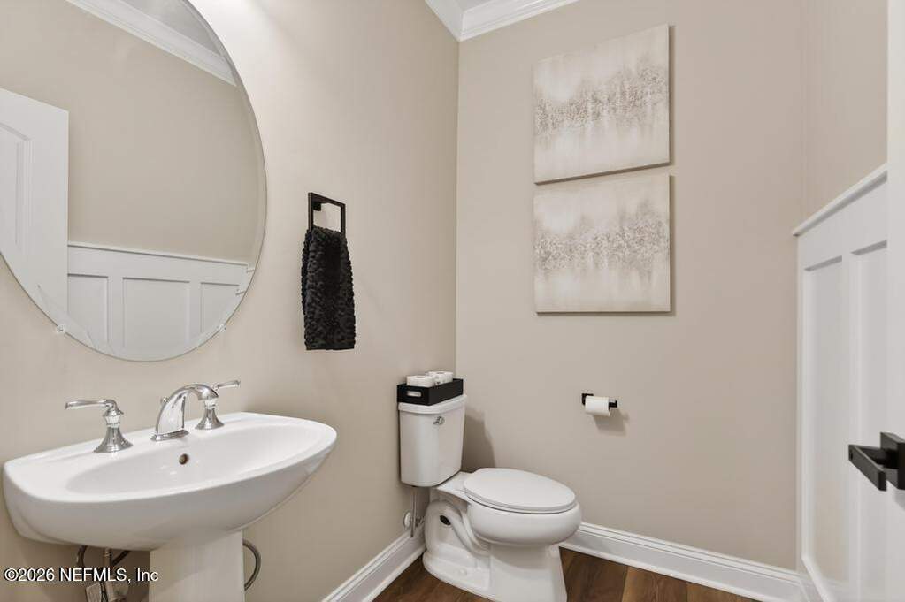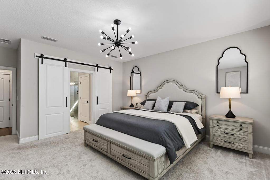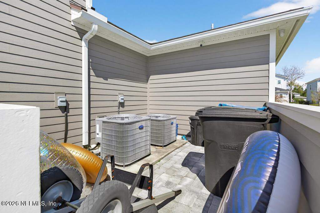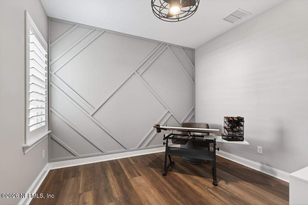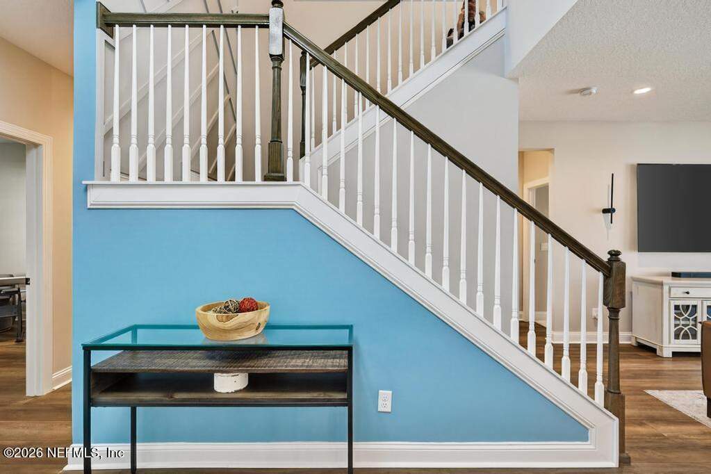 Built in 2023 by Toll Brothers in Bartram Ranch, this upgraded 2,893 sq ft home offers 4 bedrooms and 3.5 baths with refined design and luxury touches. The backyard is a showpiece with water views, custom saltwater pool and spa, built-in firepit, and expansive screened enclosure with 1,026 sq ft of sealed pavers for entertaining. Interior upgrades include LVP flooring, plantation shutters, designer lighting, wood feature walls, wainscoting, private office with frameless glass doors, and built-in closet systems. Kitchen features Whirlpool stainless appliances, gas cooktop, pull-out cabinetry, backsplash, and under/over cabinet lighting. Patio is gas-plumbed for a future outdoor kitchen. Amenities include pool, fitness center, dog park and recreation center.