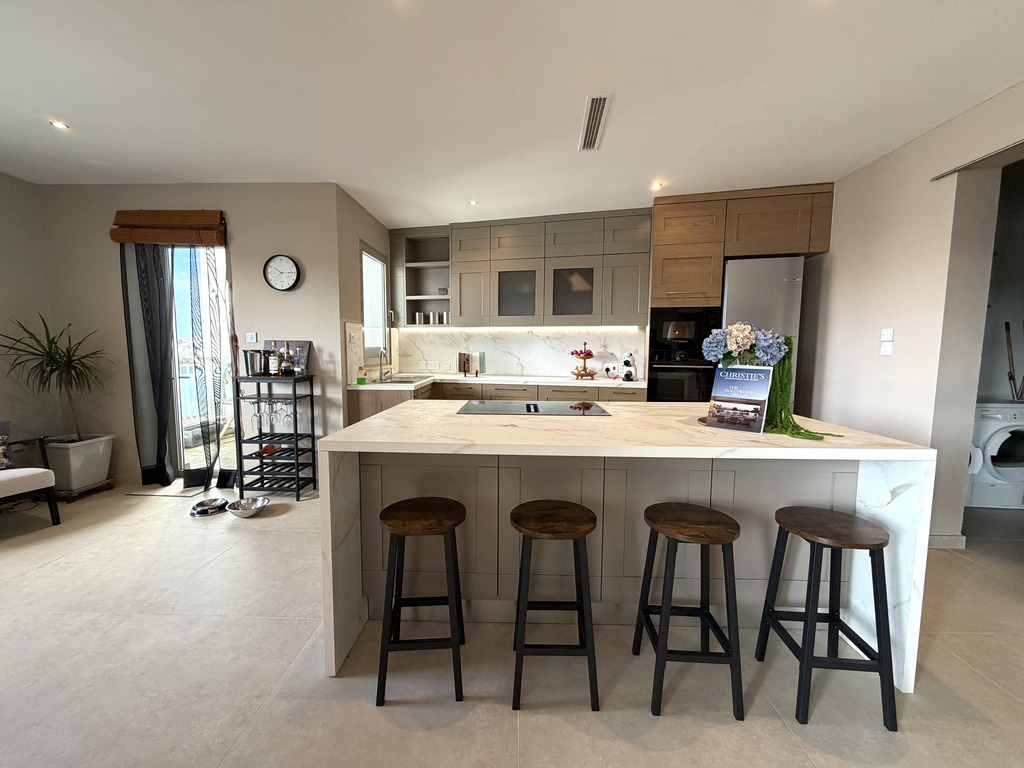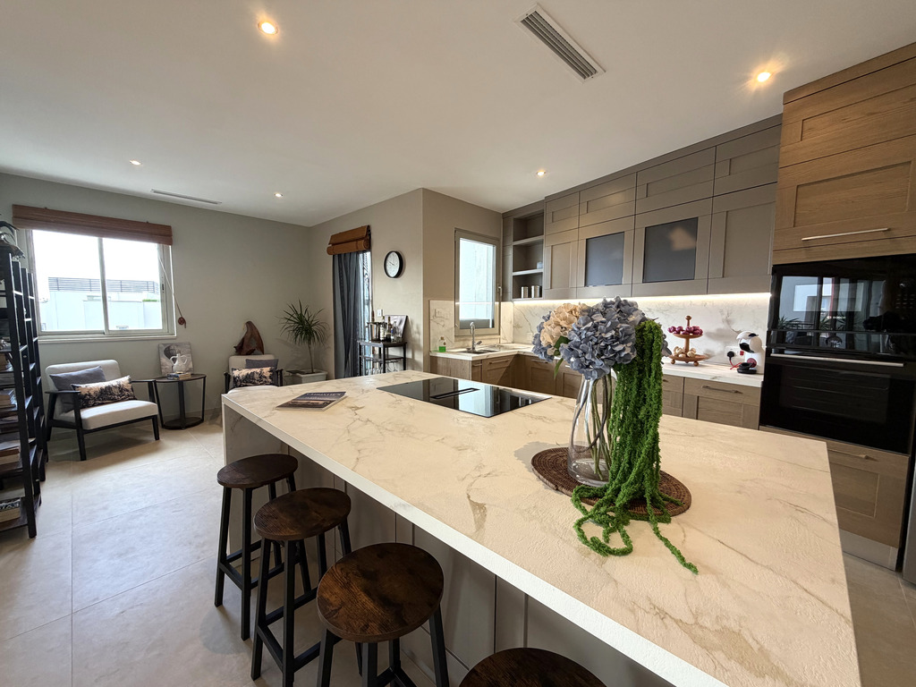 The accommodation is introduced through a welcoming entrance hall that provides a clear sense of separation between the private quarters and the main living areas. This thoughtful planning immediately establishes a calm, residential atmosphere. The heart of the apartment is the open-plan kitchen, breakfast, sitting and dining area, designed for modern living and day-to-day practicality. The kitchen sits comfortably within the space rather than dominating it, allowing the living and dining zones to flow naturally towards the terrace. Large apertures encourage natural light to filter throughout the room, enhancing the sense of openness and creating a pleasant connection between indoor and outdoor living.