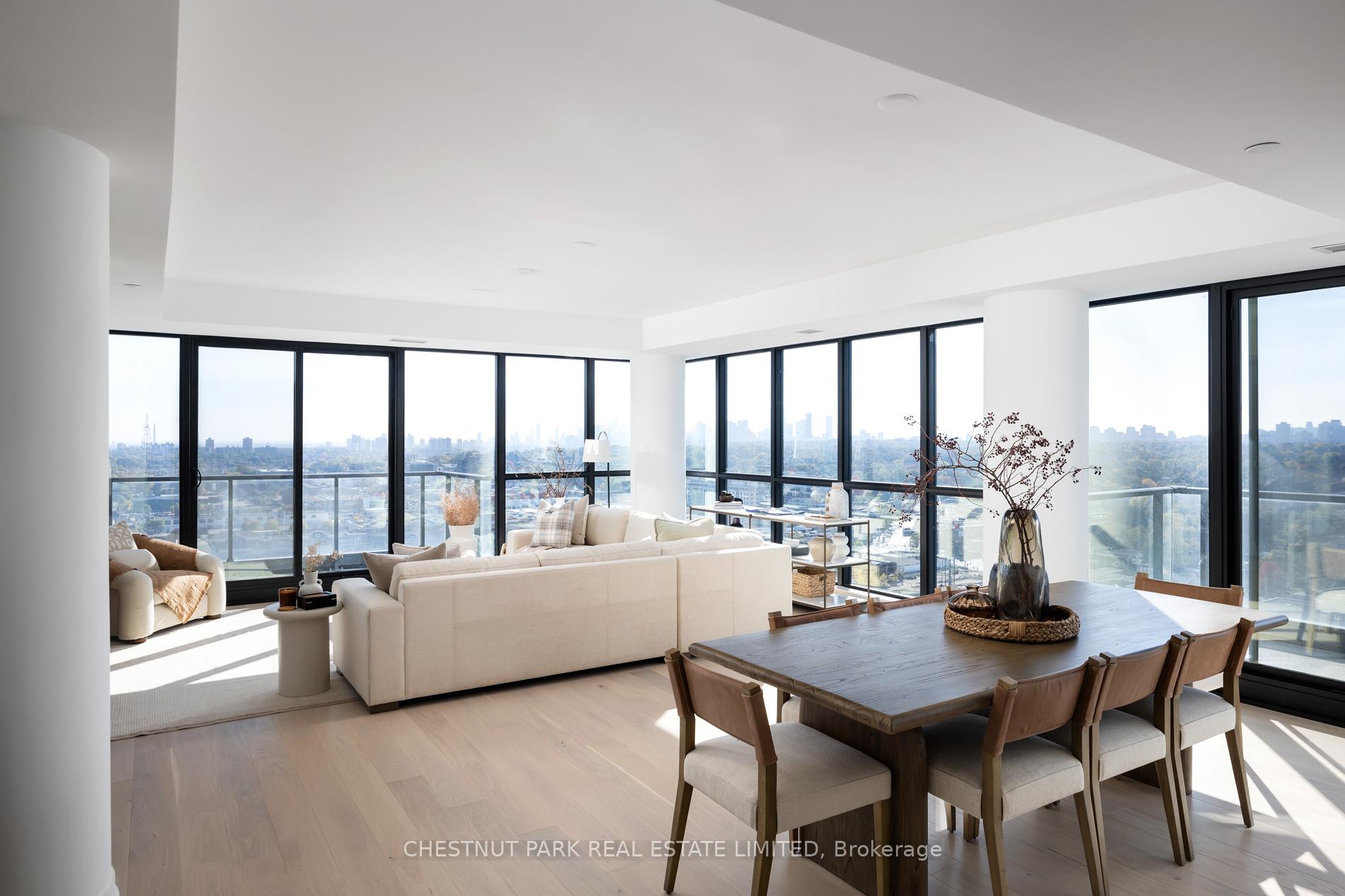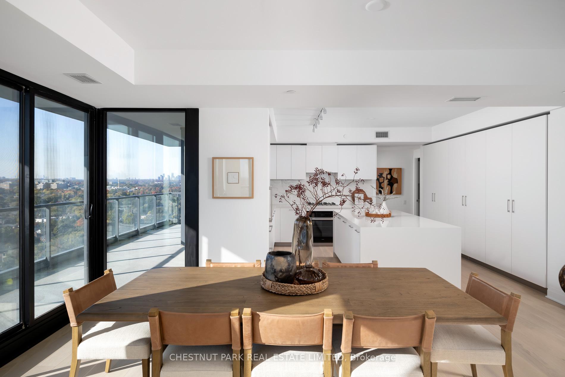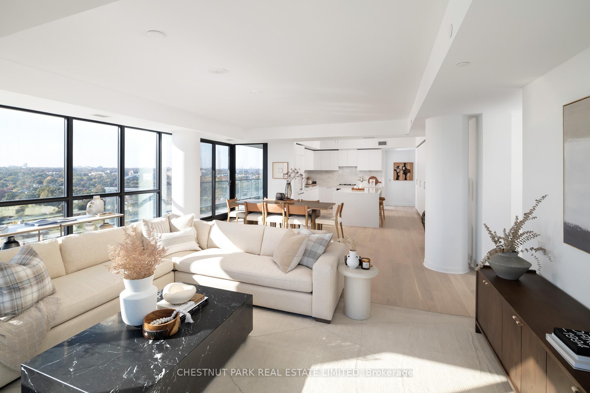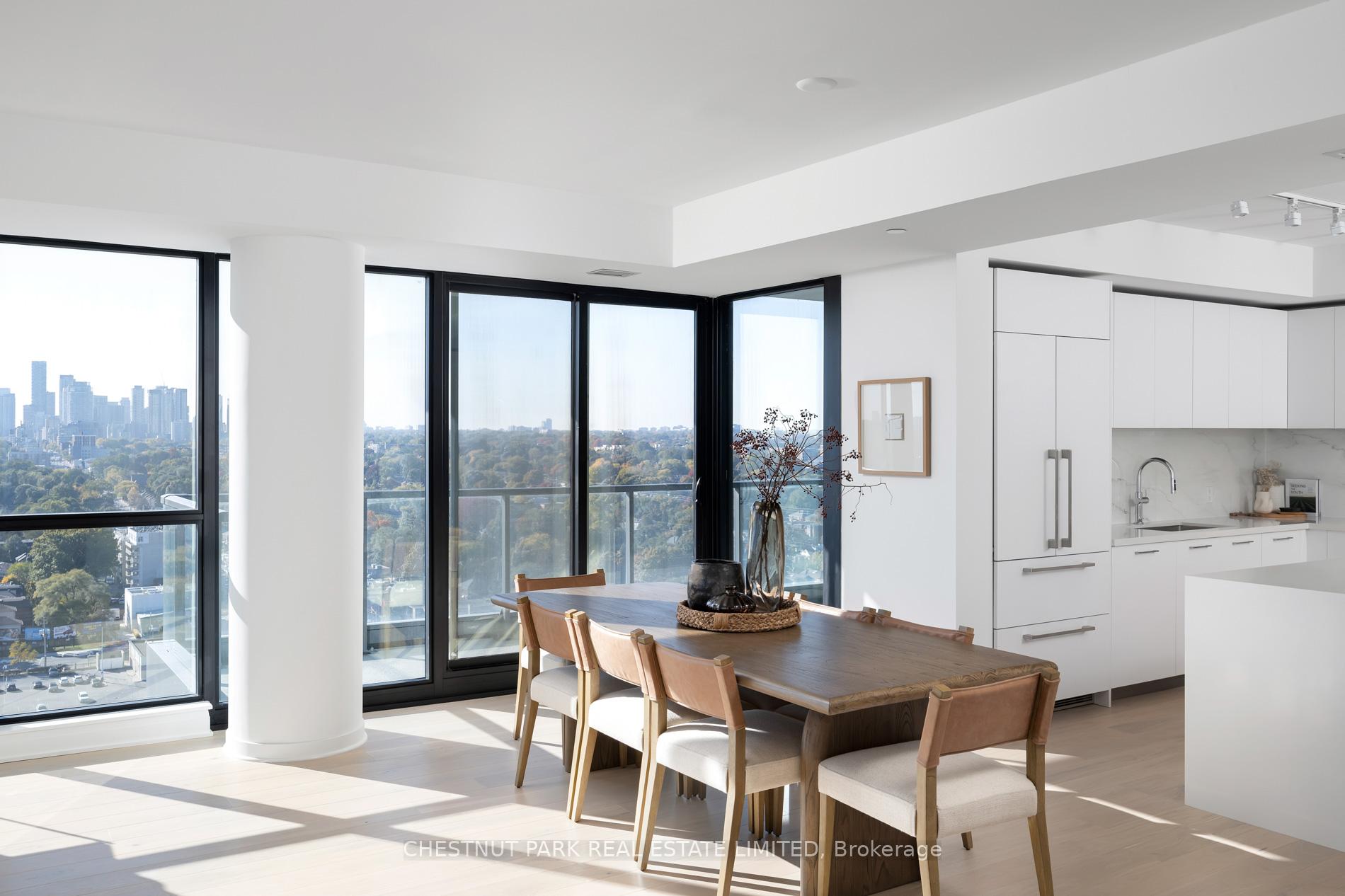 Welcome to this exquisite 2-bedroom, 3-bathroom southwest corner suite in Leaside's Upper East Village. The inviting foyer features a powder room and two coat closets, leading to an expansive open-concept living and dining area with floor-to-ceiling windows, two walkouts to generous balconies, and unobstructed southwest city views. The gourmet kitchen boasts abundant counterspace, a full wall of pantry storage, and a large island with a breakfast bar. A split-bedroom layout ensures privacy: the serene primary suite offers a walk-in closet, 5-piece ensuite, and balcony access, while the guest bedroom includes a 3-piece ensuite, double closet, and balcony walkout. Neutral tones, natural light, and thoughtful design create a warm, elevated living experience ideal for any lifestyle. Stainless steel Miele appliances: 5 burner gas stovetop, oven, dishwasher, fridge, Whirlpool washing machine, Whirlpool dryer.