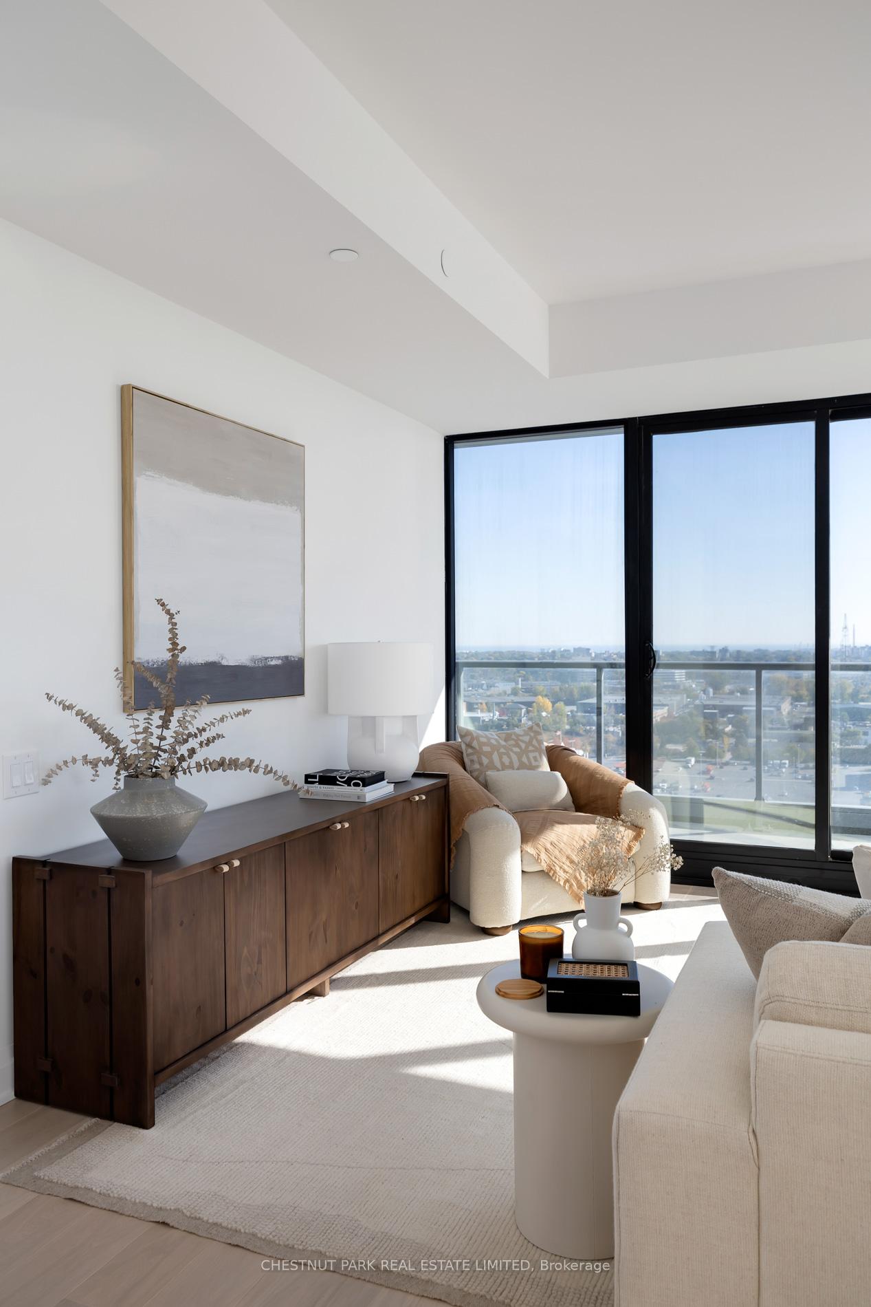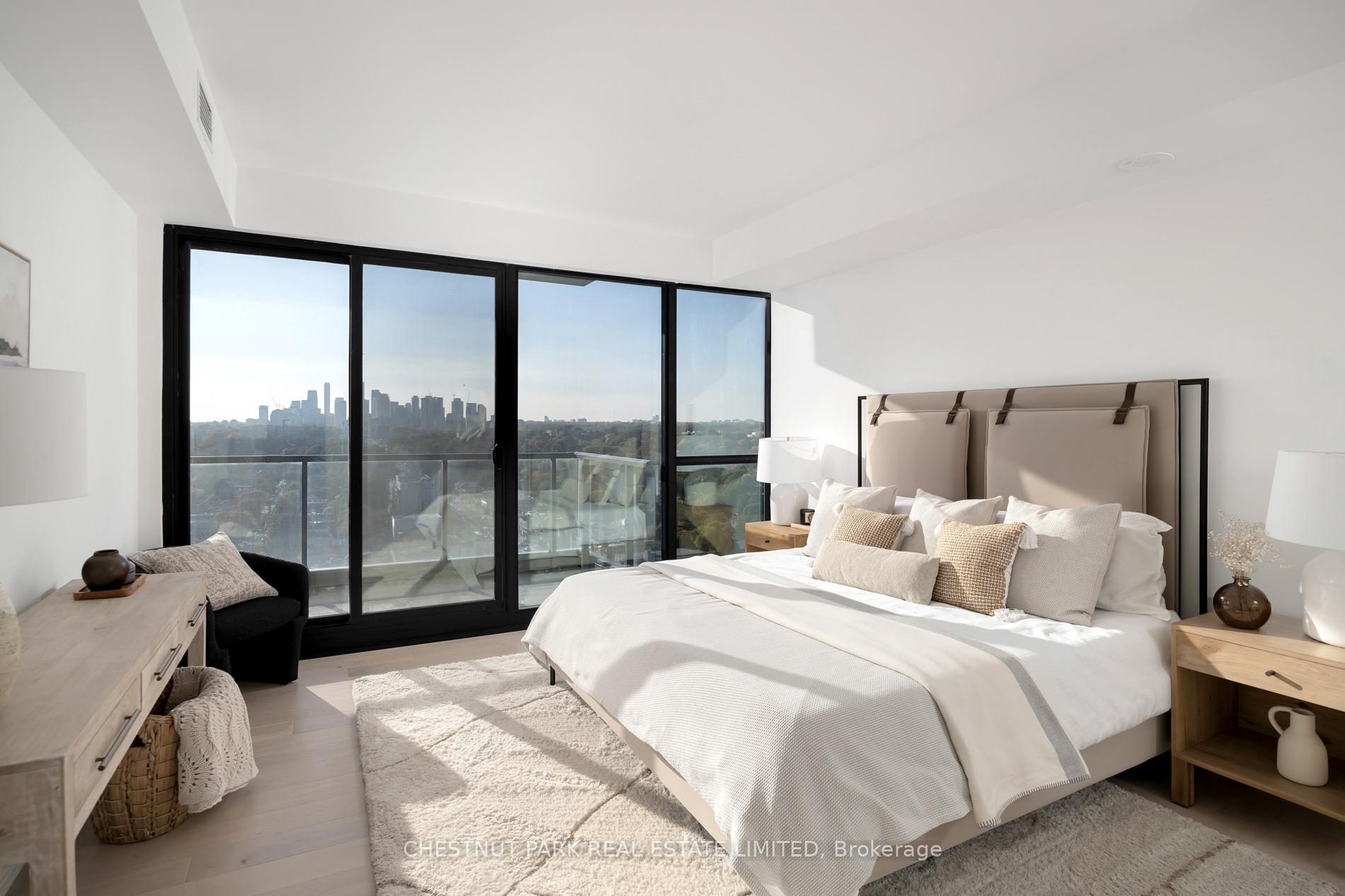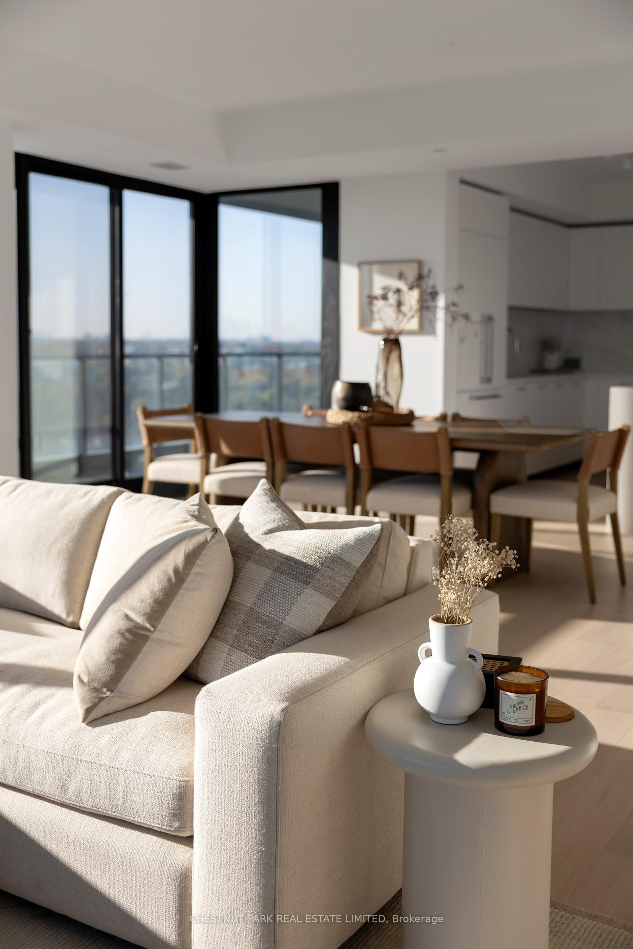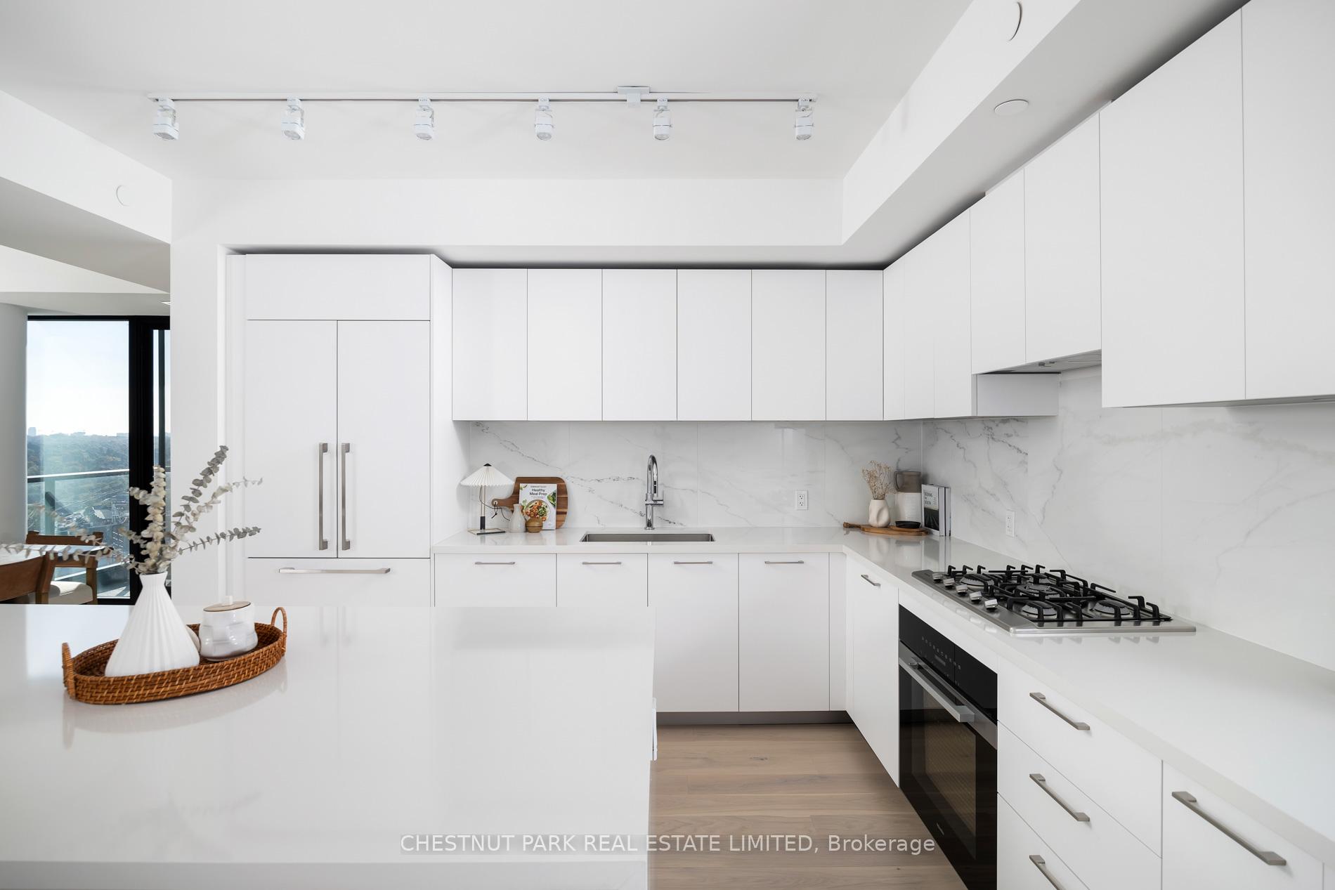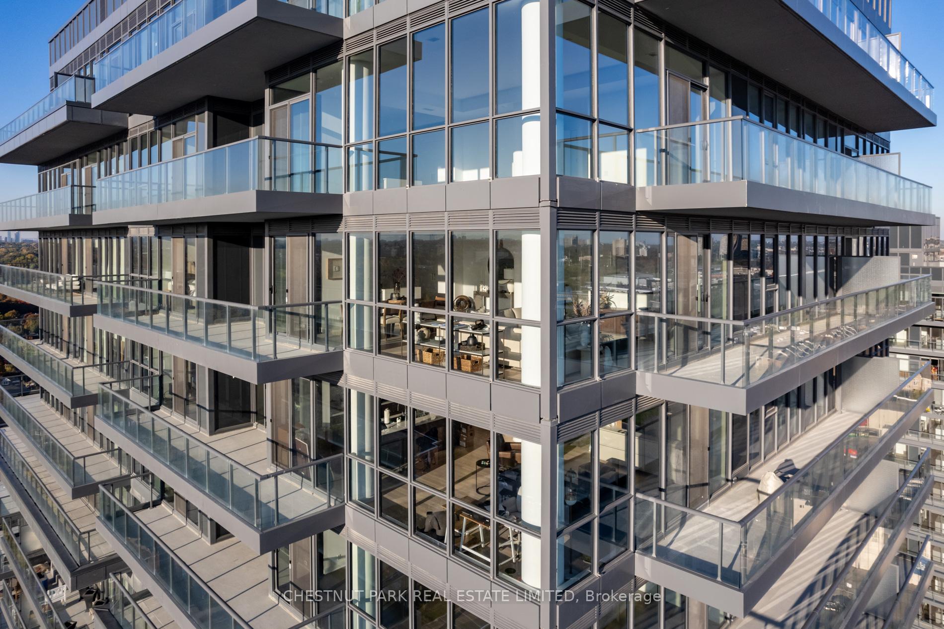 Welcome to this exquisite 2-bedroom, 3-bathroom southwest corner suite in Leaside's Upper East Village. The inviting foyer features a powder room and two coat closets, leading to an expansive open-concept living and dining area with floor-to-ceiling windows, two walkouts to generous balconies, and unobstructed southwest city views. The gourmet kitchen boasts abundant counterspace, a full wall of pantry storage, and a large island with a breakfast bar. A split-bedroom layout ensures privacy: the serene primary suite offers a walk-in closet, 5-piece ensuite, and balcony access, while the guest bedroom includes a 3-piece ensuite, double closet, and balcony walkout. Neutral tones, natural light, and thoughtful design create a warm, elevated living experience ideal for any lifestyle. Stainless steel Miele appliances: 5 burner gas stovetop, oven, dishwasher, fridge, Whirlpool washing machine, Whirlpool dryer.