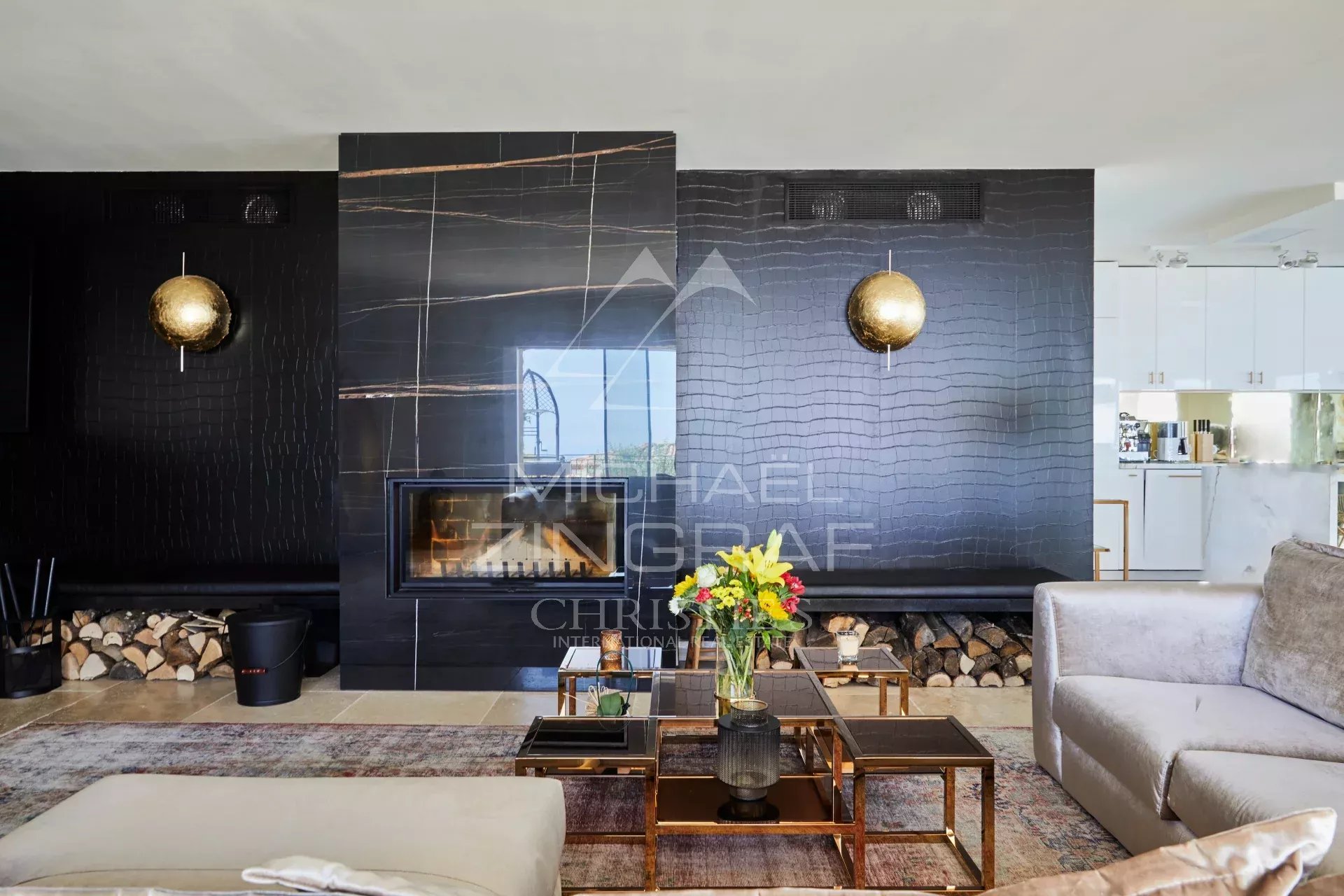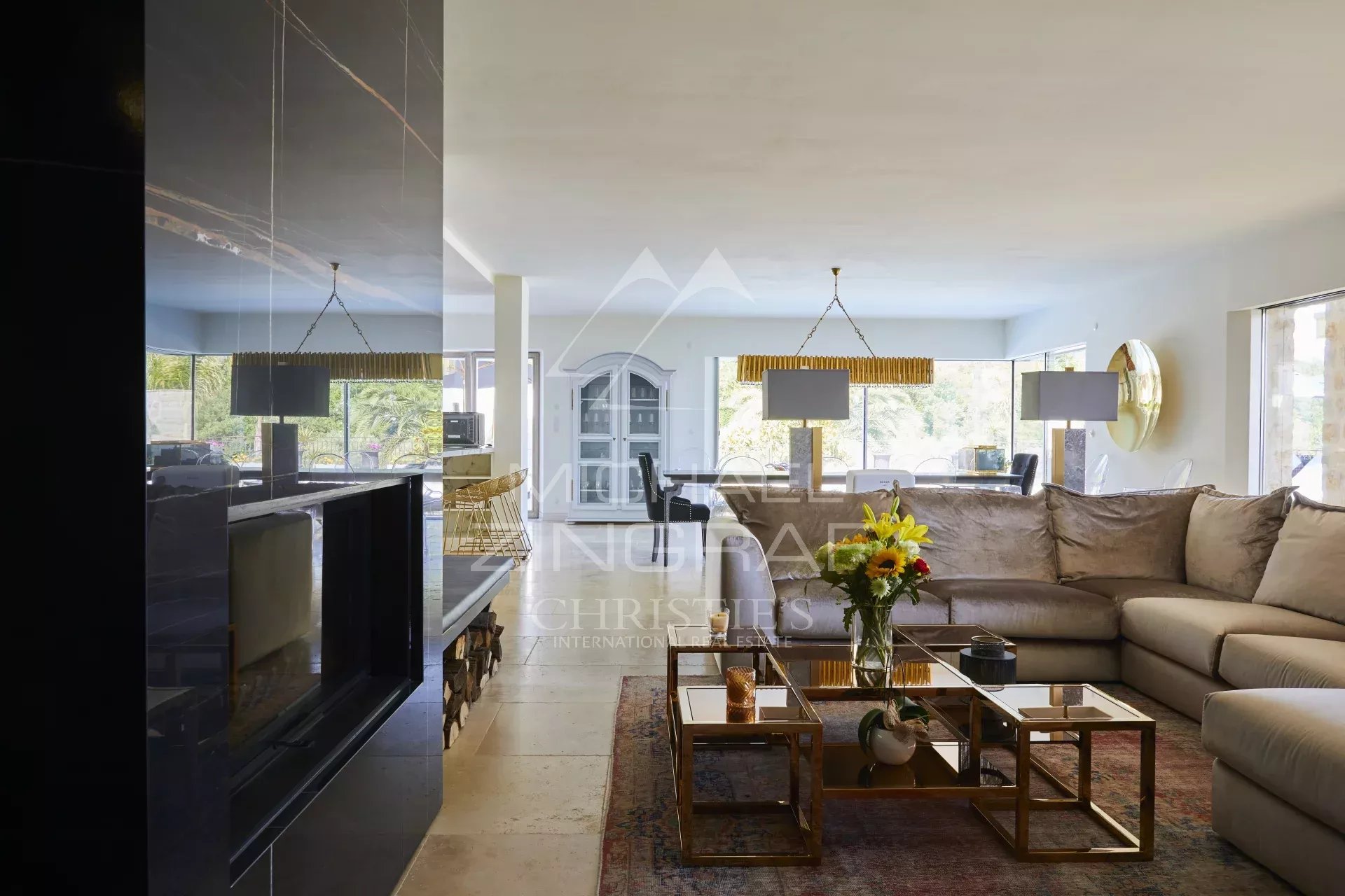 Inside, the villa offers spacious reception areas: a TV lounge with fireplace, a dining room, and a fully equipped kitchen.