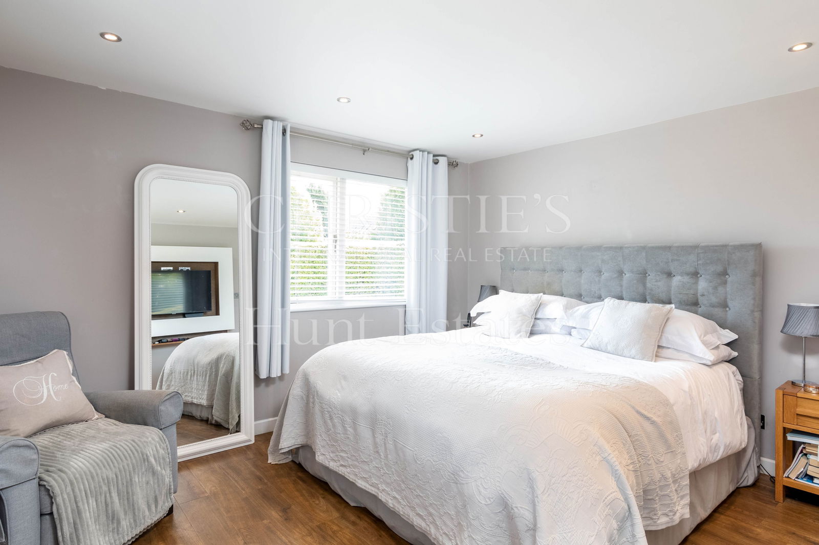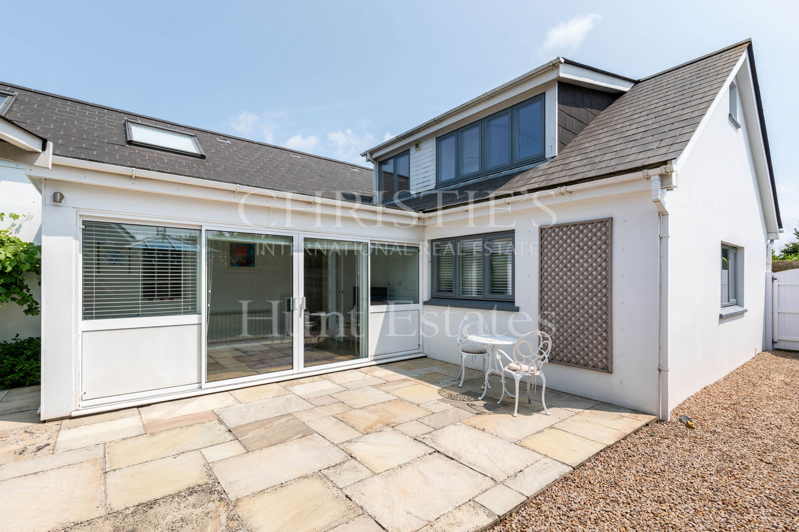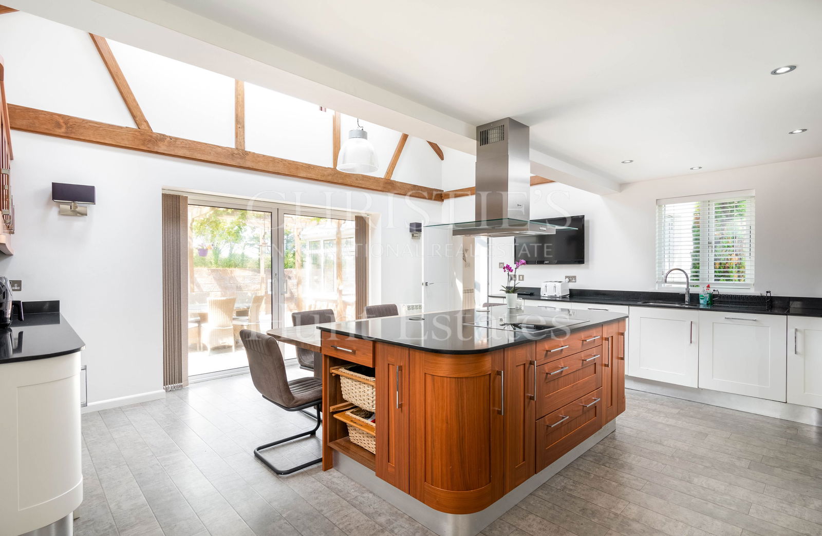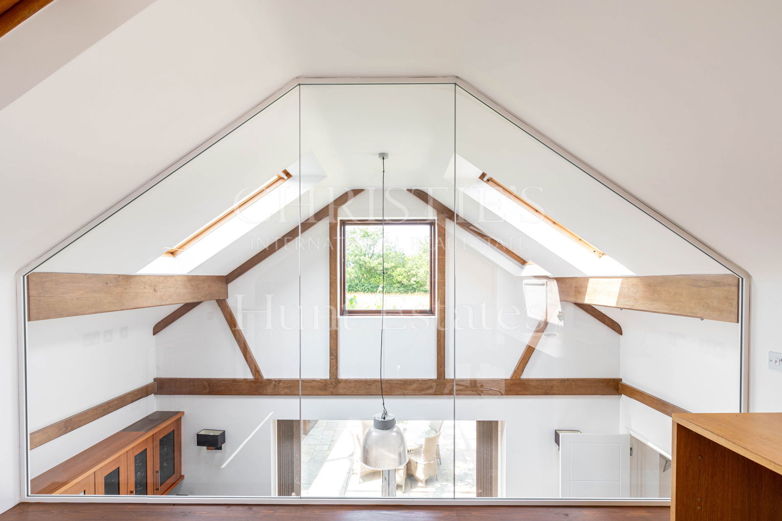 A formal dining/sitting room, also with French doors leading to the patio, offers an elegant setting for entertaining. A snug/playroom provides a cozy, flexible space for family living, while a stylish mezzanine overlooking the kitchen creates the ideal home office or creative retreat.