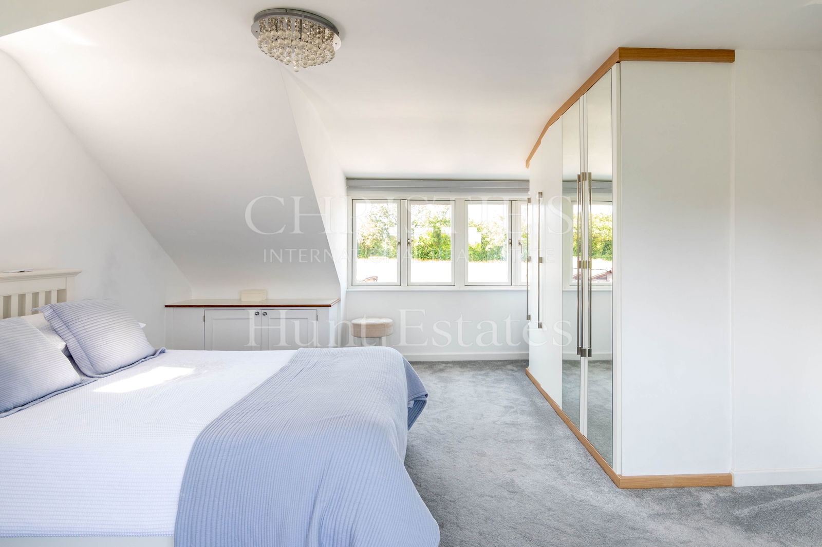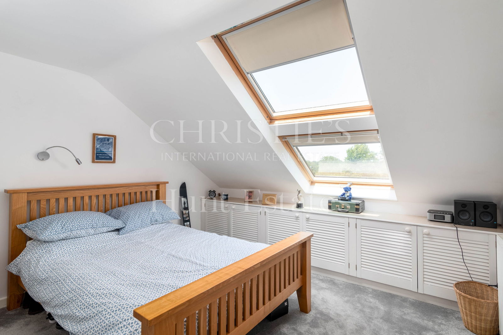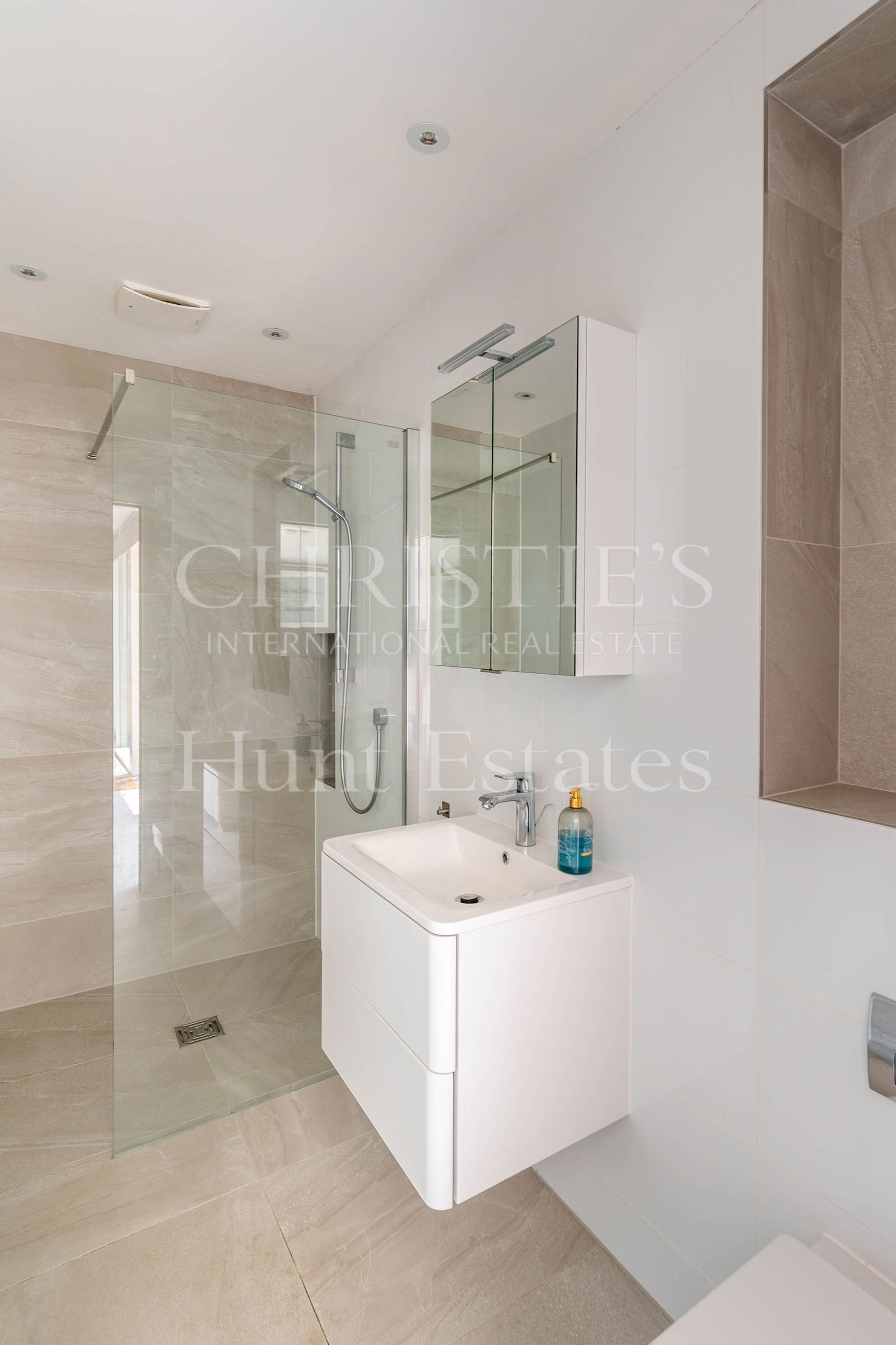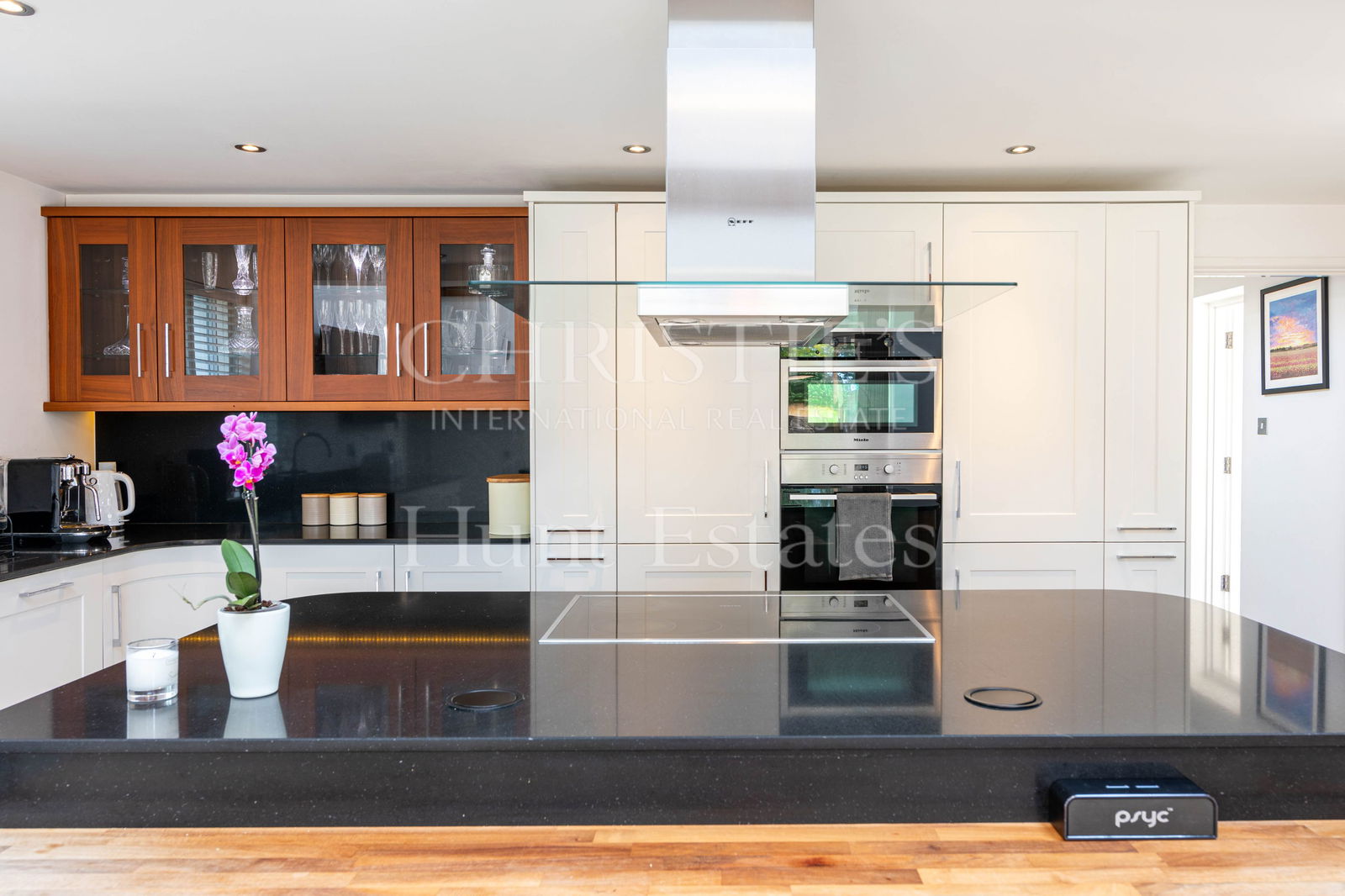 A formal dining/sitting room, also with French doors leading to the patio, offers an elegant setting for entertaining. A snug/playroom provides a cozy, flexible space for family living, while a stylish mezzanine overlooking the kitchen creates the ideal home office or creative retreat.