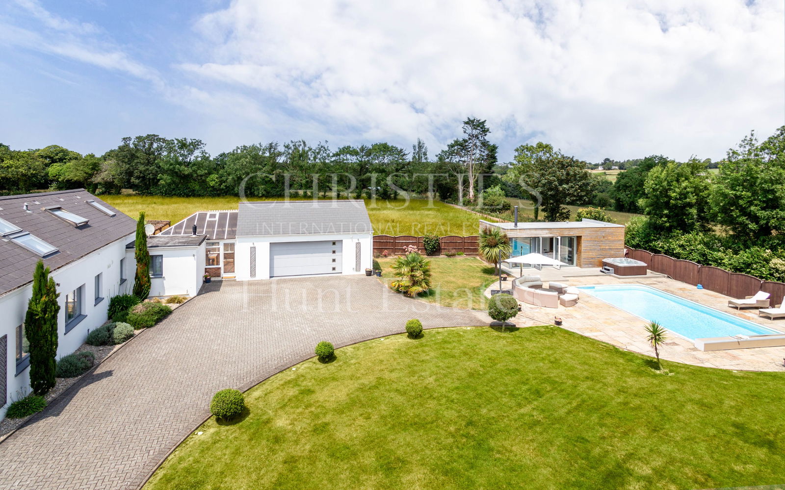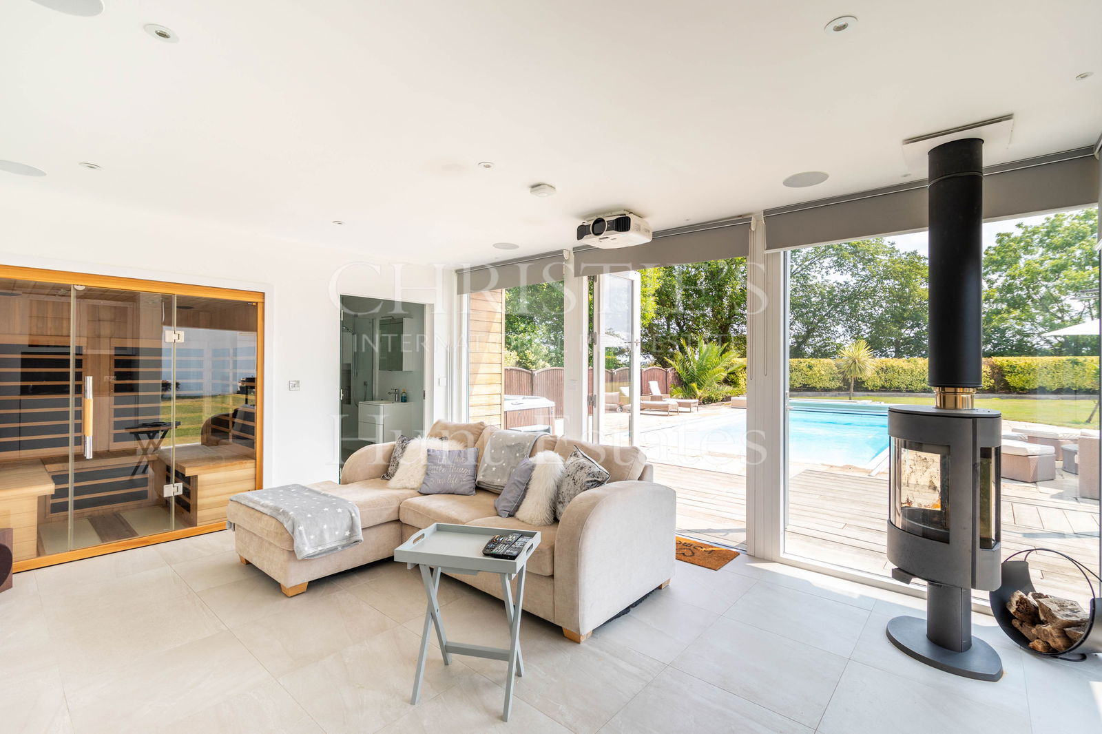 Externally, the property truly excels. Multiple outdoor spaces have been designed for entertaining at different times of day, with carefully landscaped areas that follow the sun. The centrepiece is a heated swimming pool, accompanied by a versatile pool house that could function as a separate guest unit. It features a projector screen, wood-burning stove, a sauna, and a separate shower room.