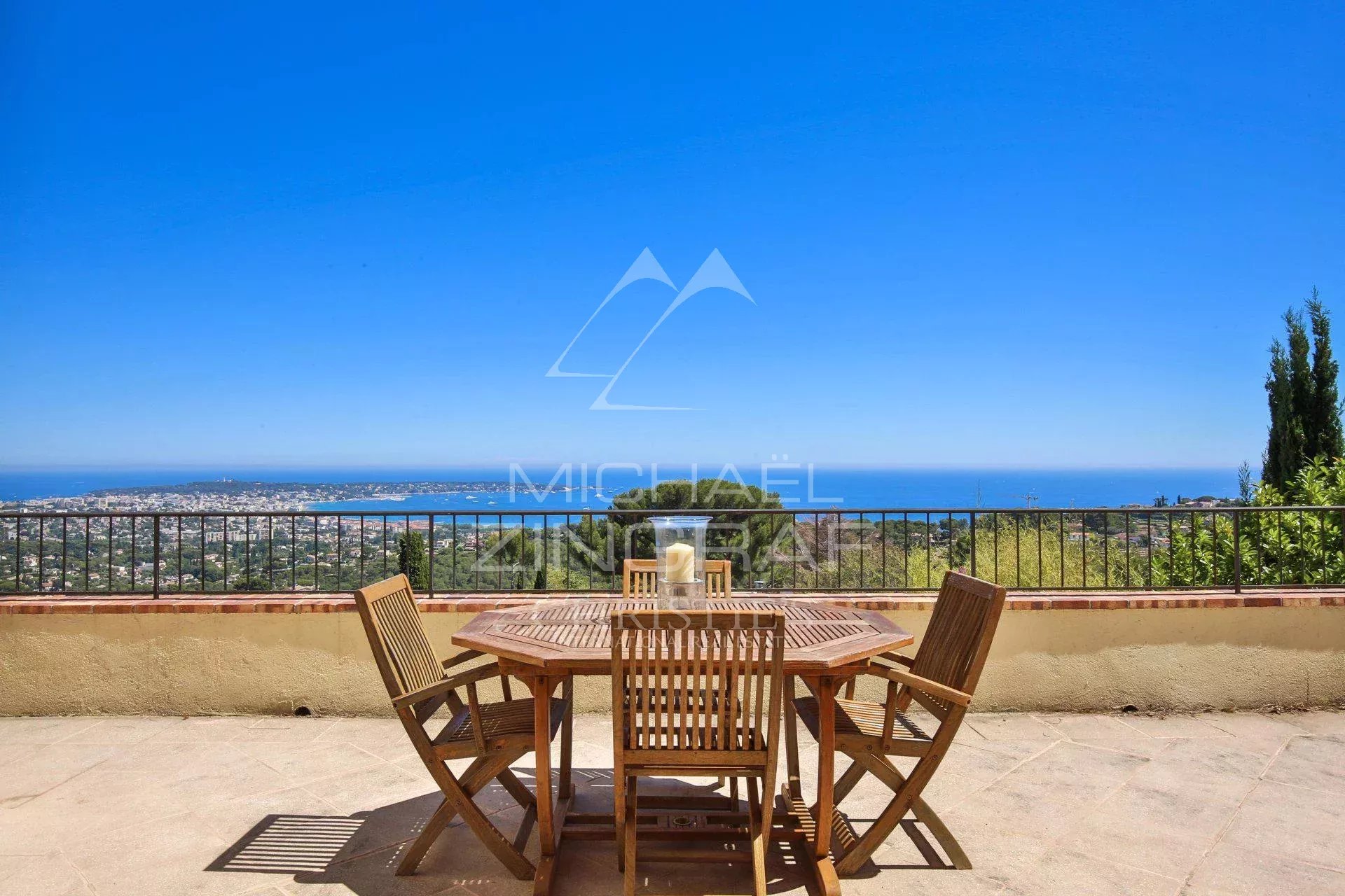 Nestled in a sought-after and perfectly quiet residential area, this elegant Provençal stone villa from the 1950s enjoys a privileged location close to main roads while offering an exceptional panoramic view of the sea, the Cap d'Antibes, and the mountains.