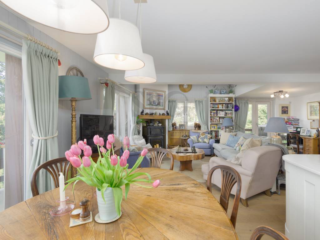 The main floor features two spacious double bedrooms, one of which benefits from its own private shower. Upstairs, a third bedroom with a bathroom offers a cozy space under the eaves. The bright and welcoming living area includes an open-plan kitchen with a central island, as well as a spacious lounge opening onto a sunny balcony—perfect for enjoying the panorama to the fullest.