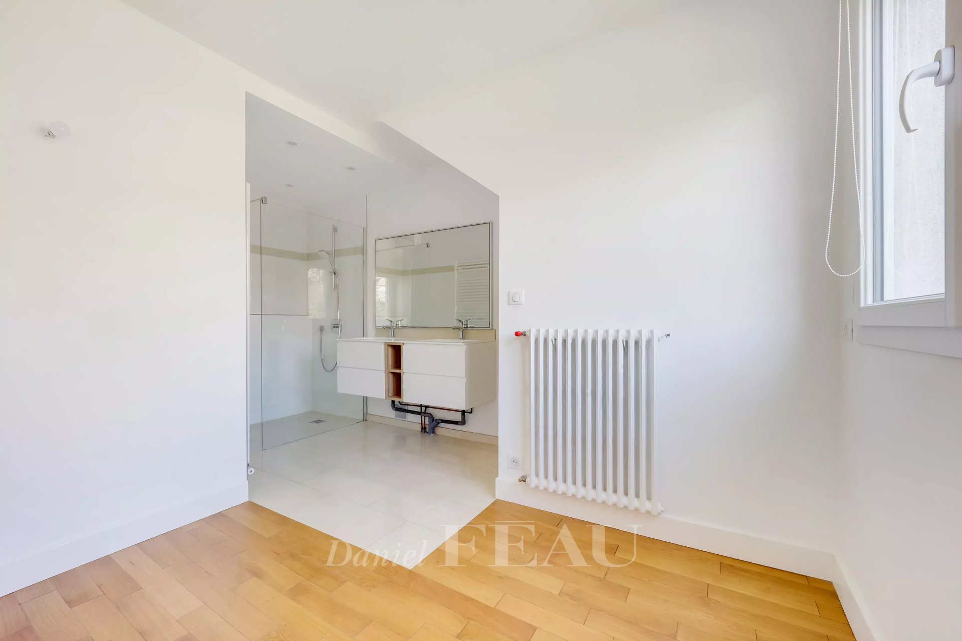 Set in a leafy 750 sqm garden, it includes a 50 sqm living/reception room with a fireplace, a 16 sqm equipped kitchen, and a master bedroom with a study and bathroom. Upstairs are three spacious bedrooms (one with an adjacent shower room), and a second shower room with a dressing room.