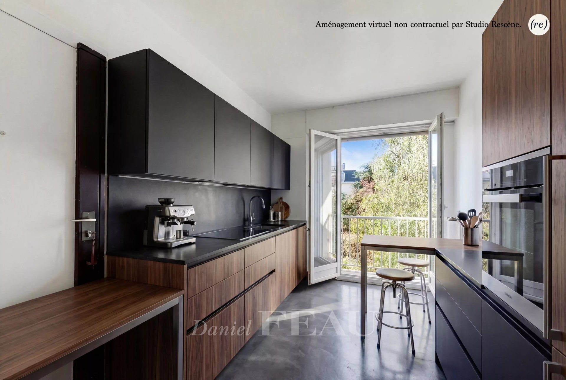 This dual-aspect apartment is on the 2nd floor of a relatively recent and very well-maintained residence with a caretaker. Overlooking avenue de Versailles to one side and gardens to the rear, it offers 155 sqm of living space including a 52 sqm living/reception room with a working fireplace and a balcony, a kitchen benefiting from access from the service staircase, four bedrooms (5 would be possible), two shower rooms, a washroom and a dressing room. Fitted closets and cupboards.