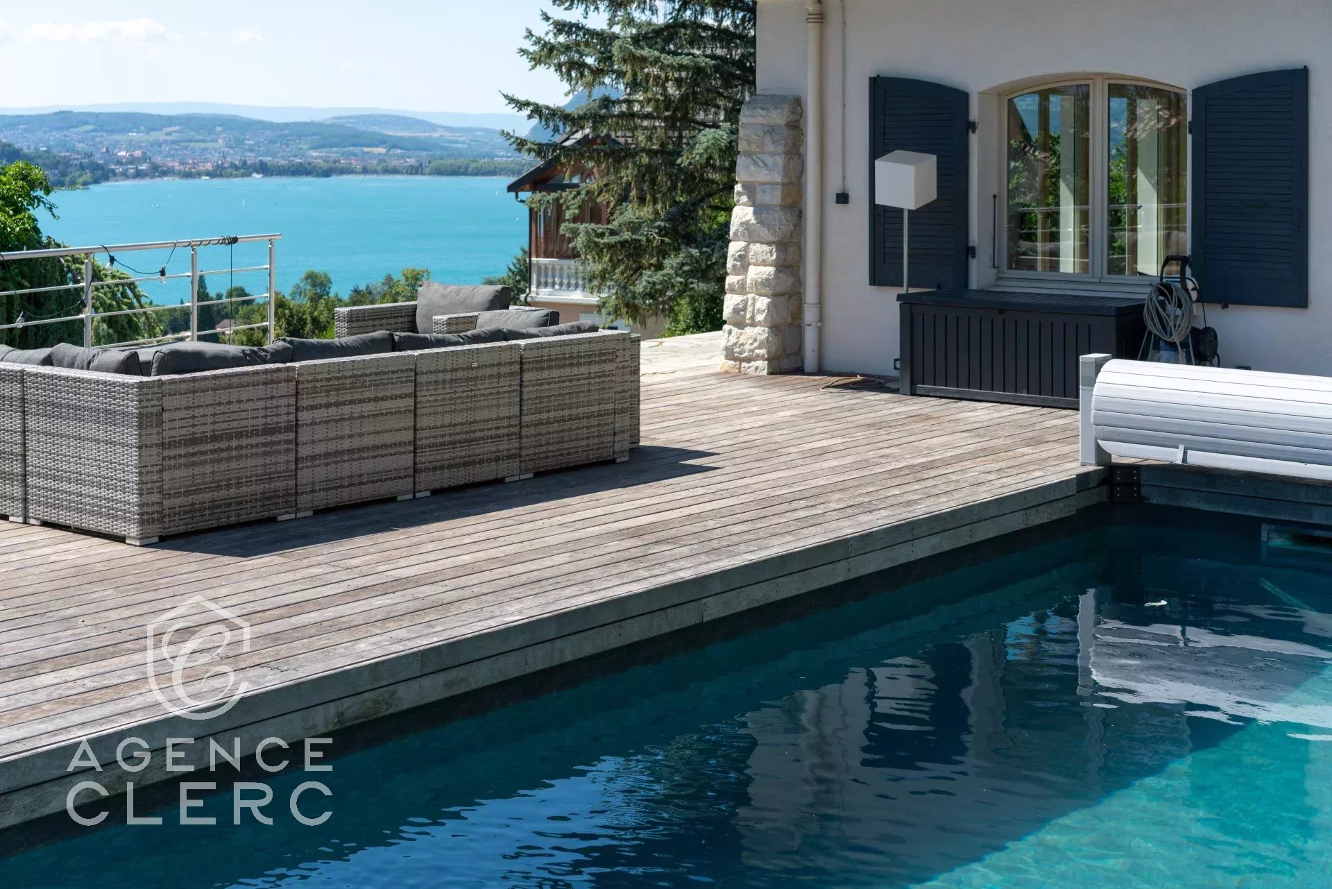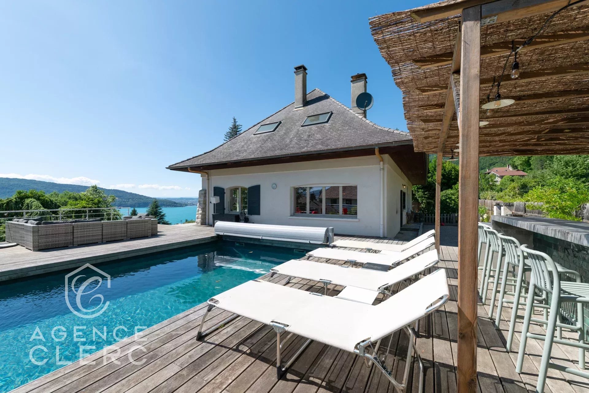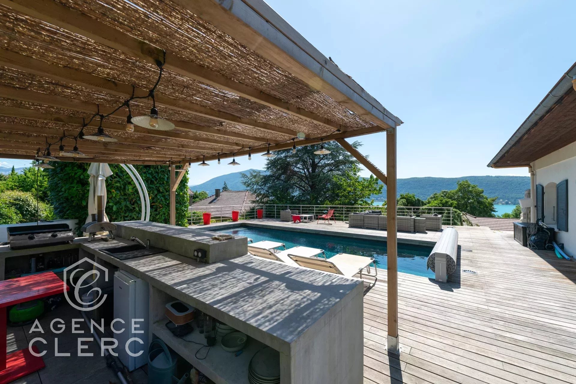 Veyrier-du-Lac, Lovely house with superb lake views on 1,383 m² of land, 242 m² of living space + 149 m² basement, 4 bedrooms, 4 bathrooms, office. The house combines elegance and functionality, heated swimming pool, beautiful terrace with summer kitchen, pétanque court, close to the village and school.