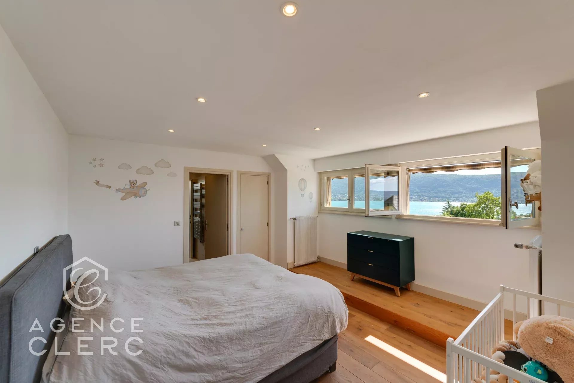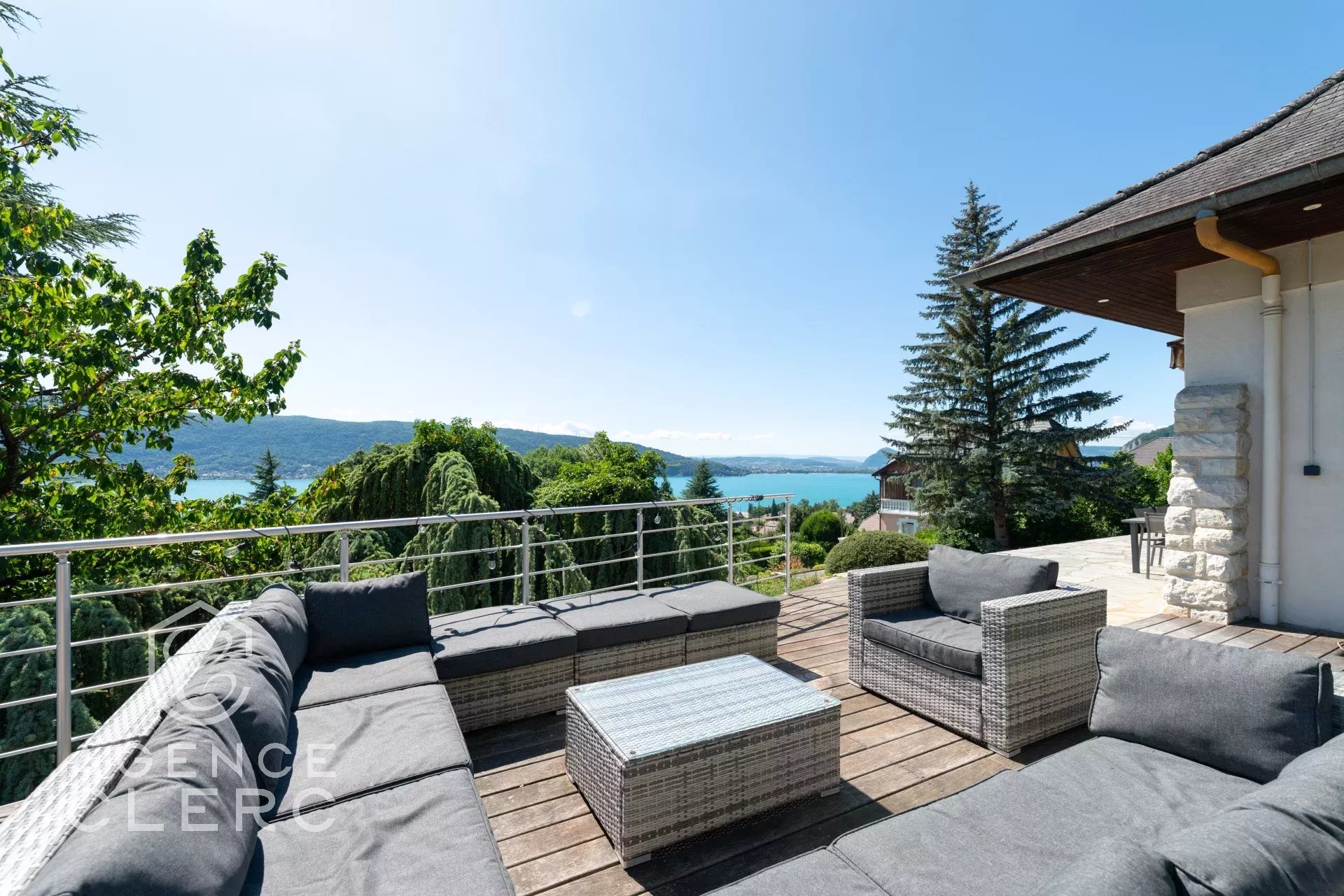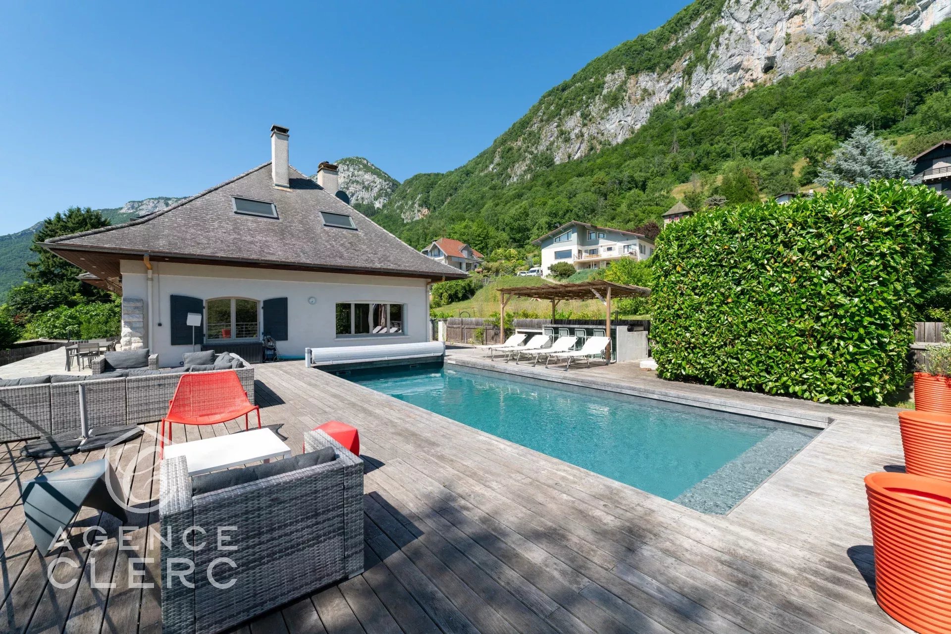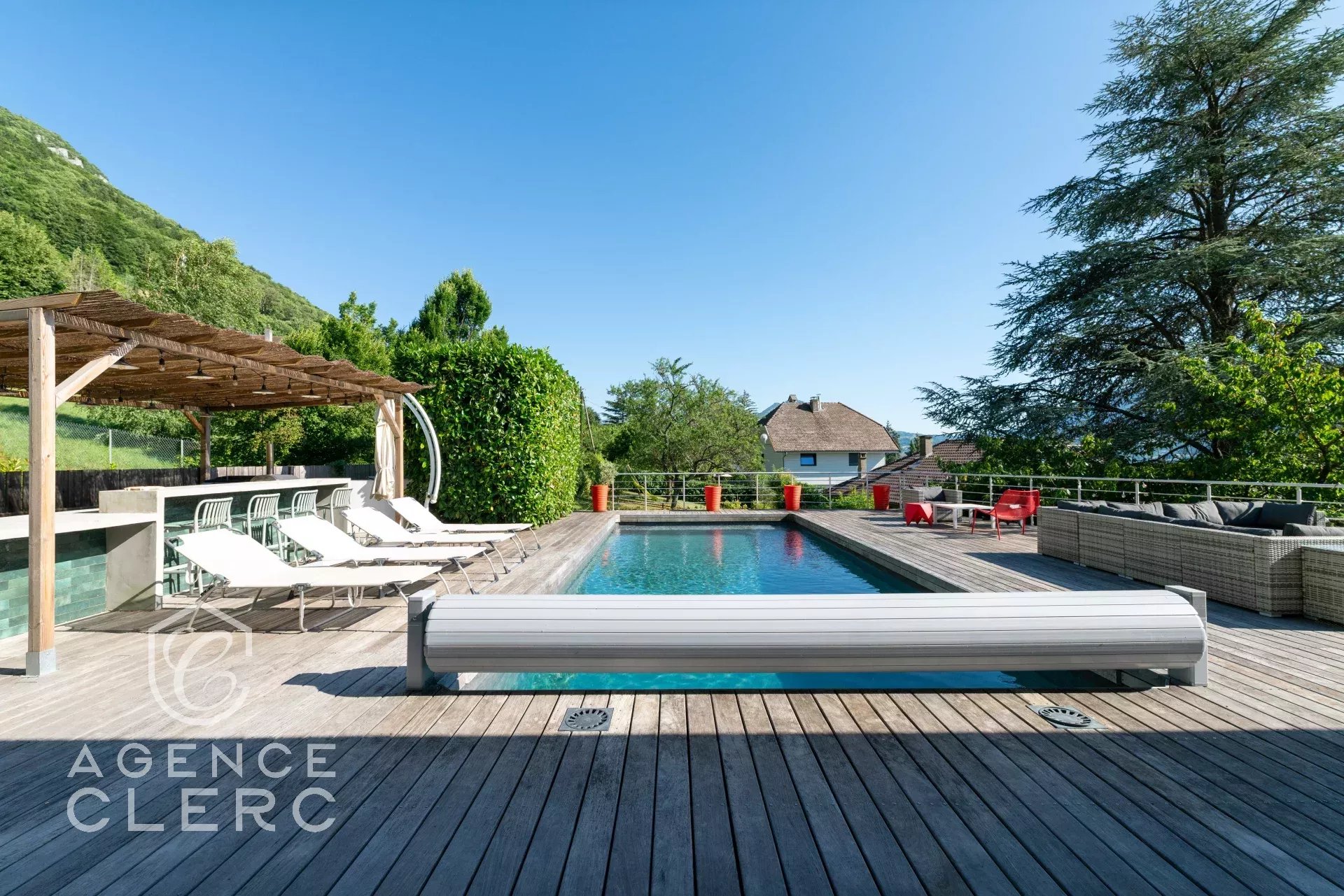 Veyrier-du-Lac, Lovely house with superb lake views on 1,383 m² of land, 242 m² of living space + 149 m² basement, 4 bedrooms, 4 bathrooms, office. The house combines elegance and functionality, heated swimming pool, beautiful terrace with summer kitchen, pétanque court, close to the village and school.