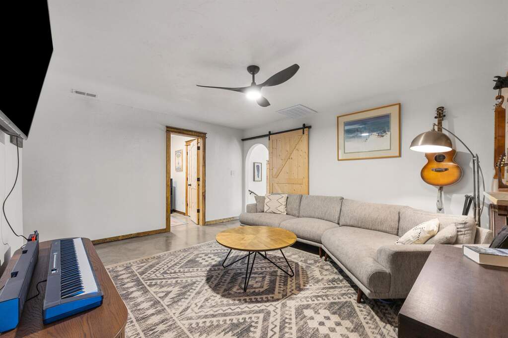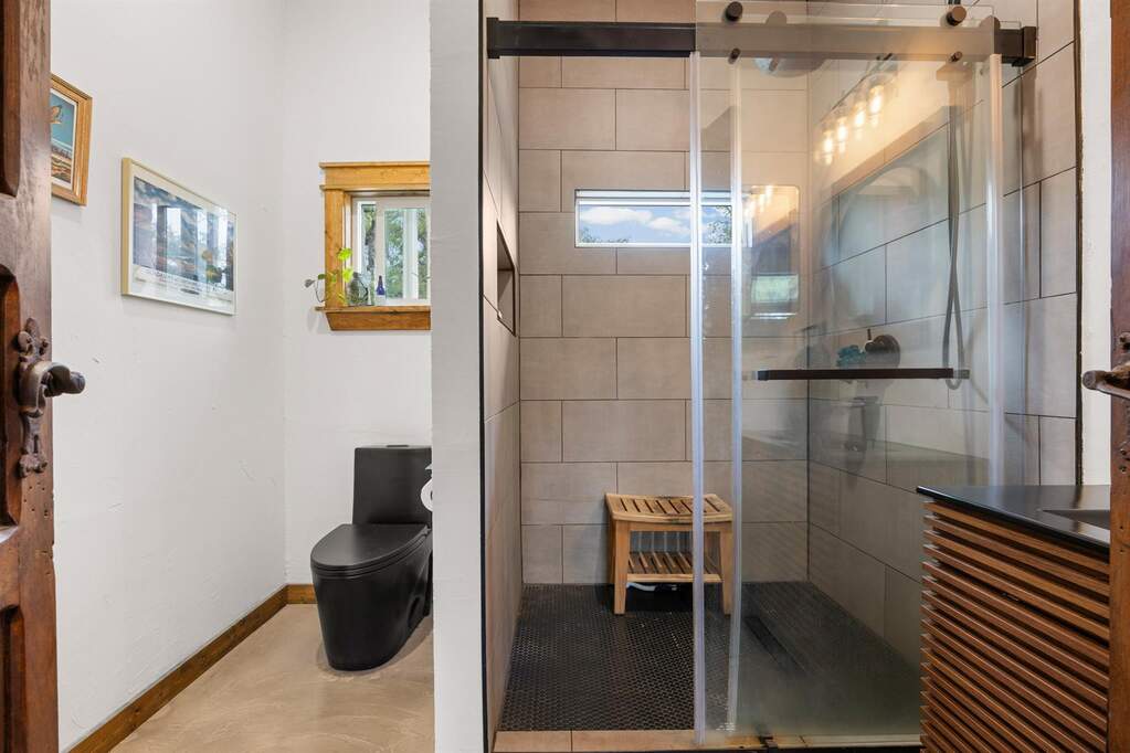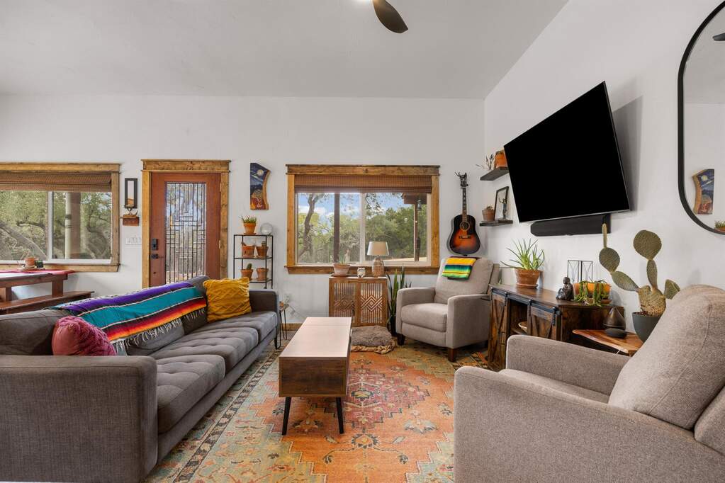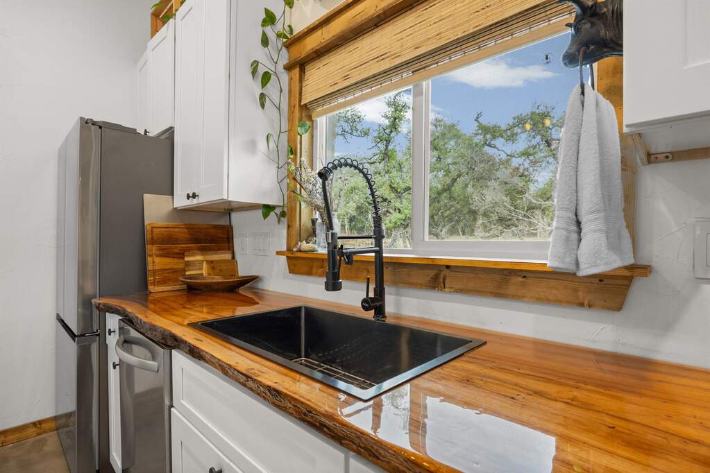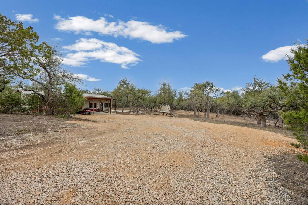Hill Country privacy, curated design, and wide-open possibility - all on 7.5+/- breathtaking acres perfectly positioned between Wimberley and Dripping Springs. 107 Rainbow Ranch feels like a slice of your own private paradise, where mature oaks frame the landscape and thoughtfully cleared acreage opens to endless sky and multiple level building sites for whatever vision you hold next. Inside, the home has been completely reimagined with craftsmanship and intention, offering two spacious living areas that provide flexibility for gathering, relaxing, or hosting with ease, along with a large laundry room that adds everyday functionality and convenience. The kitchen is a true centerpiece, featuring custom live-edge countertops, new cabinetry, gas cooking, and curated finishes that bring warmth and organic texture to the space. The fully renovated bathroom showcases custom tile work in the expansive walk-in shower and a sleek vanity that feels refined yet grounded in Hill Country charm. All windows have been replaced, while handcrafted stairs, doors, and architectural accents add character you simply can't replicate. The home is serviced by a 7,500-gallon rainwater collection system with water purification, and over two acres of cedar have been selectively cleared to preserve privacy while enhancing usability and showcasing the natural beauty of the land. Whether you envision expanding, building a secondary residence, or simply enjoying it as your peaceful retreat, the opportunity here is rare. Spend evenings watching stunning Texas sunsets from the back porch, gather around the firepit under a canopy of stars, and wake up to quiet mornings that feel miles away from it all - yet remain just minutes from Wimberley's restaurants and nightlife, close to Dripping Springs and Driftwood, and within easy reach of Austin, Buda, and New Braunfels. This isn't just acreage. It's space to breathe, space to build, and space to truly live.