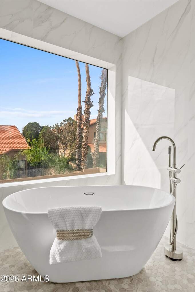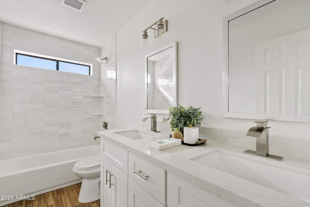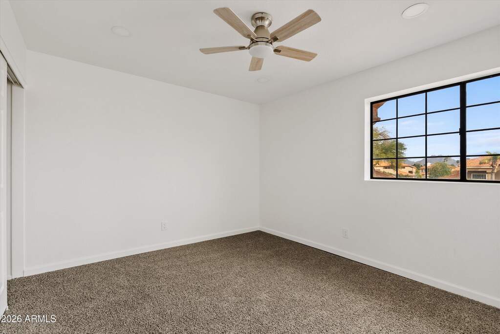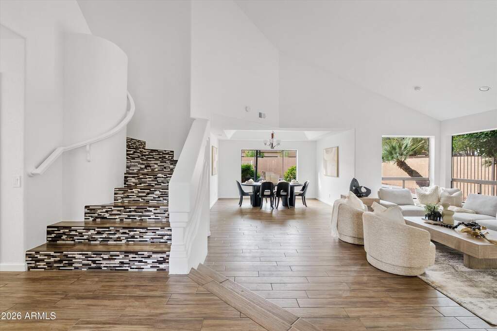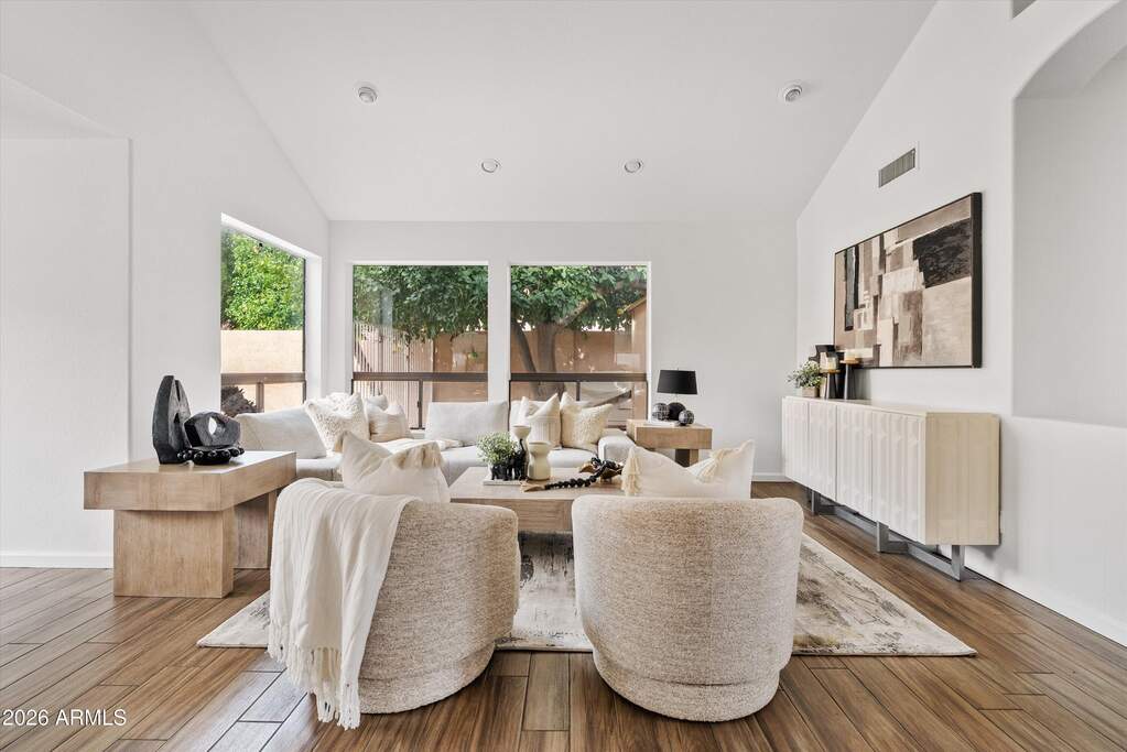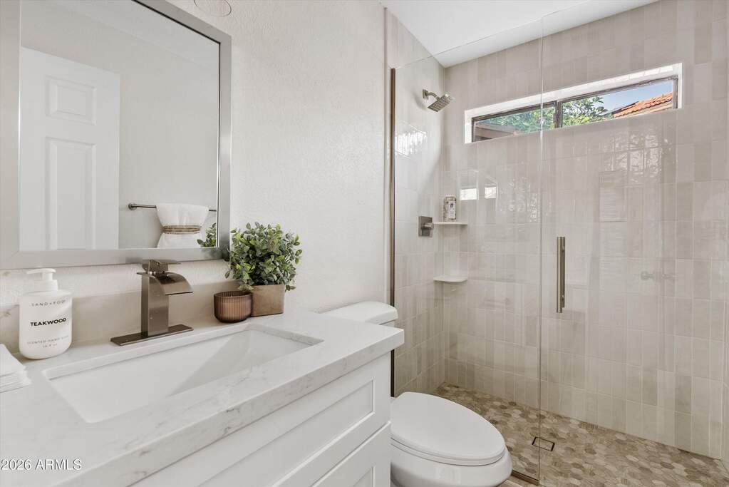 Tucked away on a quiet cul-de-sac in the highly sought-after ''Magic Zip'' 85254 (Paradise Valley Schools, Scottsdale mailing address, Phoenix services) and NO HOA, this impressive 5-bedroom residence offers the perfect blend of modern design and everyday functionality. Light-filled living and dining spaces feature soaring vaulted ceilings, creating an open and inviting atmosphere. The chef's kitchen showcases white shaker cabinetry, quartz countertops, an appliance nook, double in-wall oven/microwave, Samsung induction cooktop, and a stunning waterfall island ideal for both meal prep and entertaining. A spacious bonus room downstairs with a projector TV creates the ultimate setting for movie nights, game days, and entertaining. The luxurious upstairs primary suite boasts an oversized.. double-plumbed dual shower with four shower heads, along with a separate soaking tub for spa-like relaxation. Step outside to a resort-style backyard with a Pebble Tec waterfall pool, covered patio, and misting system, perfect for enjoying Arizona living year-round. A downstairs bedroom and full bath provide ideal space for guests or a home office. Conveniently located just minutes from Kierland Commons and Scottsdale Quarter. Seller financing available, ask for details.