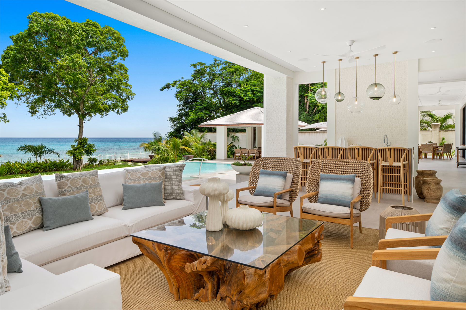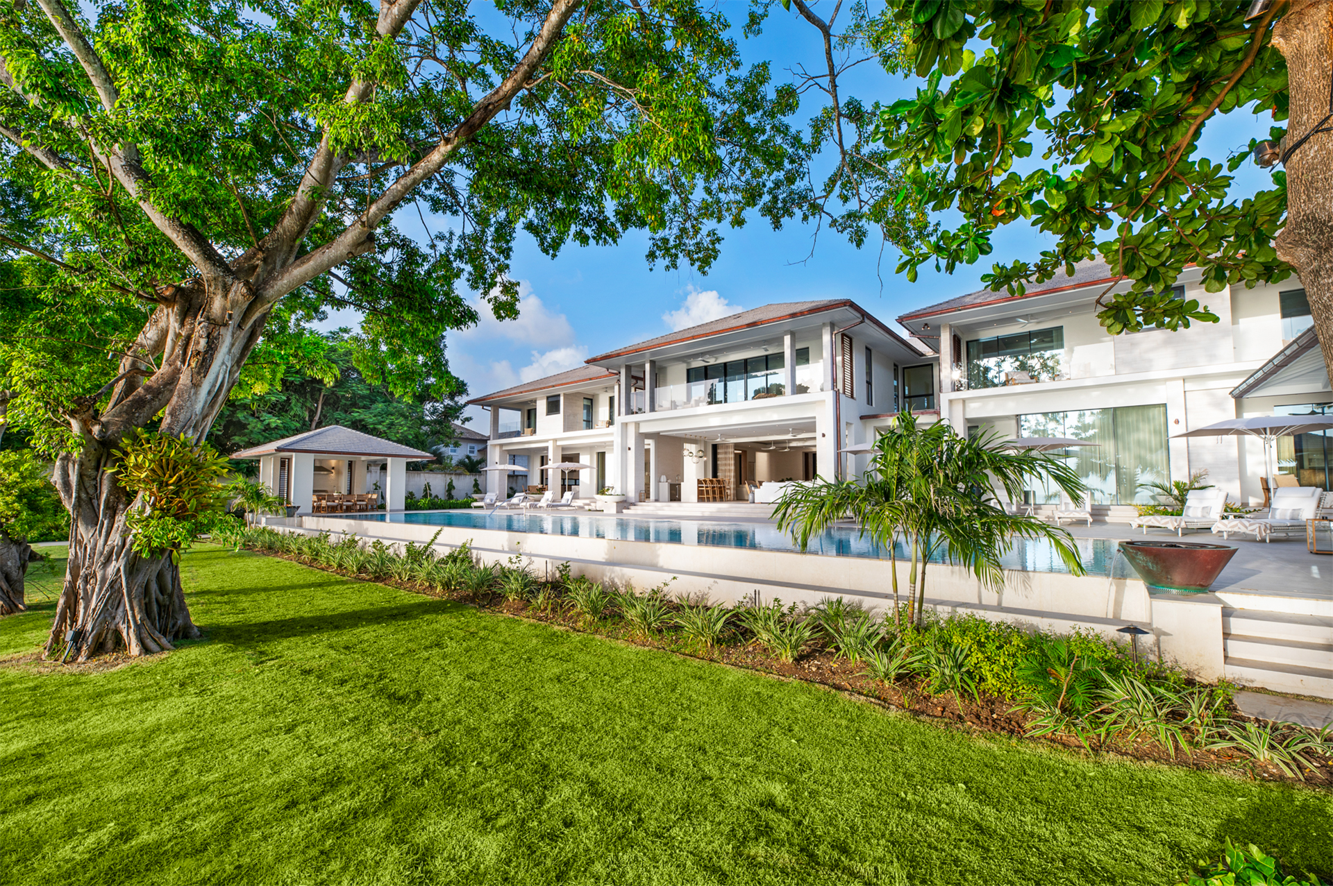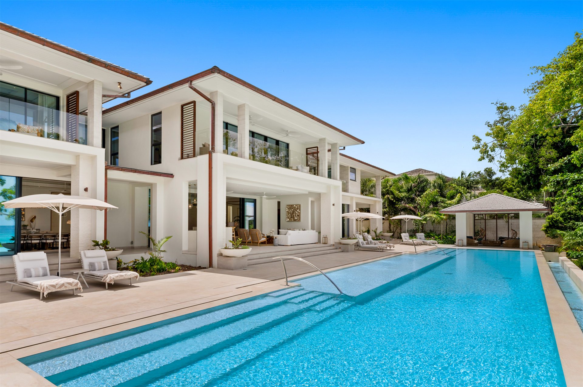 Outdoors, the splendor continues with a 75-foot-long infinity swimming pool that seamlessly blends with the uninterrupted Caribbean Sea panorama. Two pavilions at either end of the pool provide perfect spots for relaxation or hosting family gatherings.