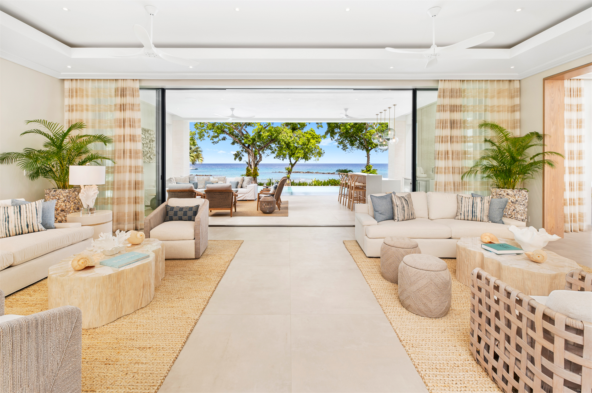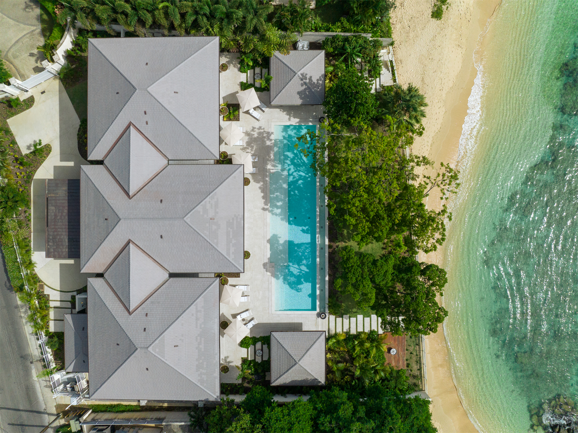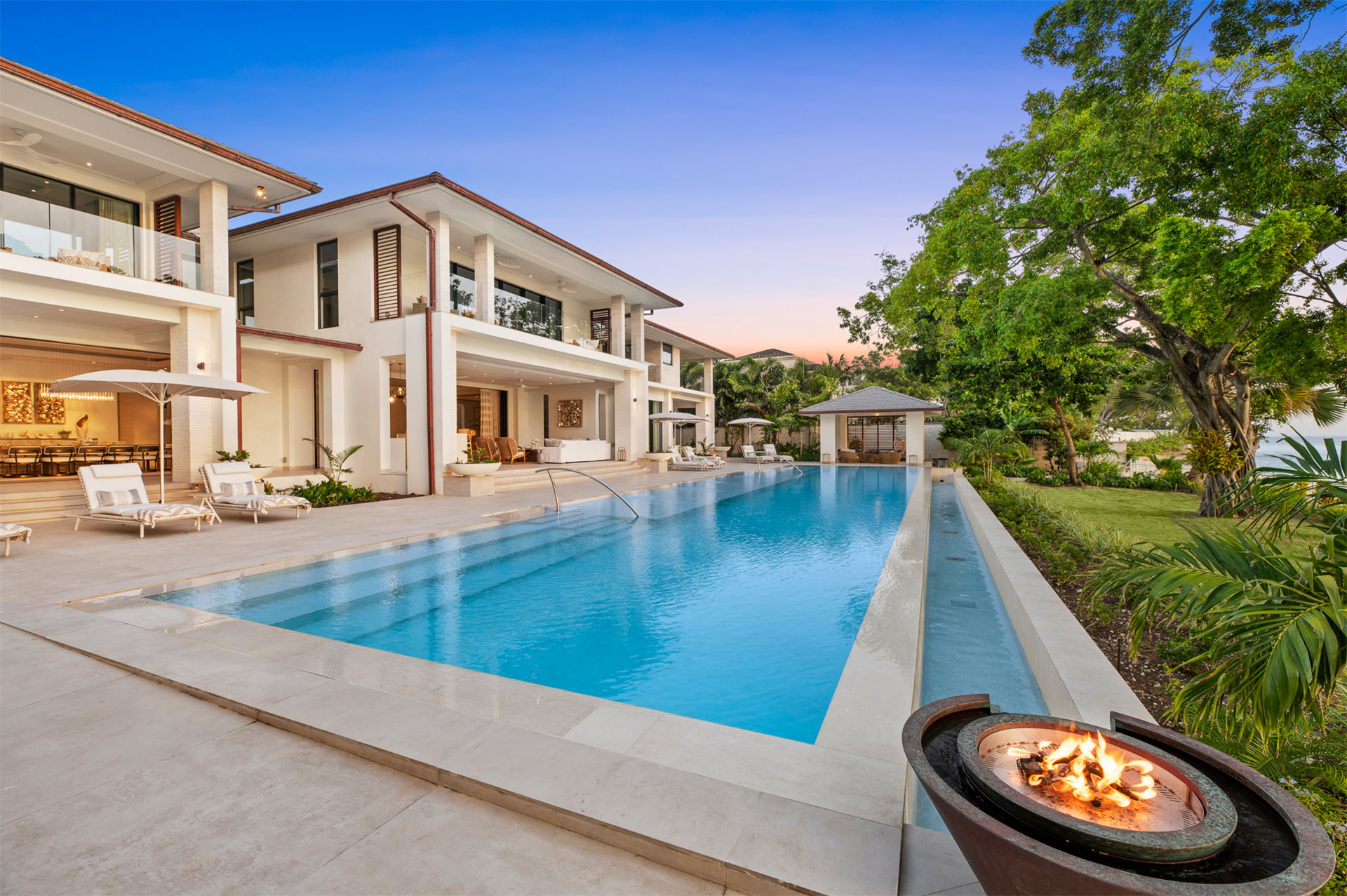 Outdoors, the splendor continues with a 75-foot-long infinity swimming pool that seamlessly blends with the uninterrupted Caribbean Sea panorama. Two pavilions at either end of the pool provide perfect spots for relaxation or hosting family gatherings.