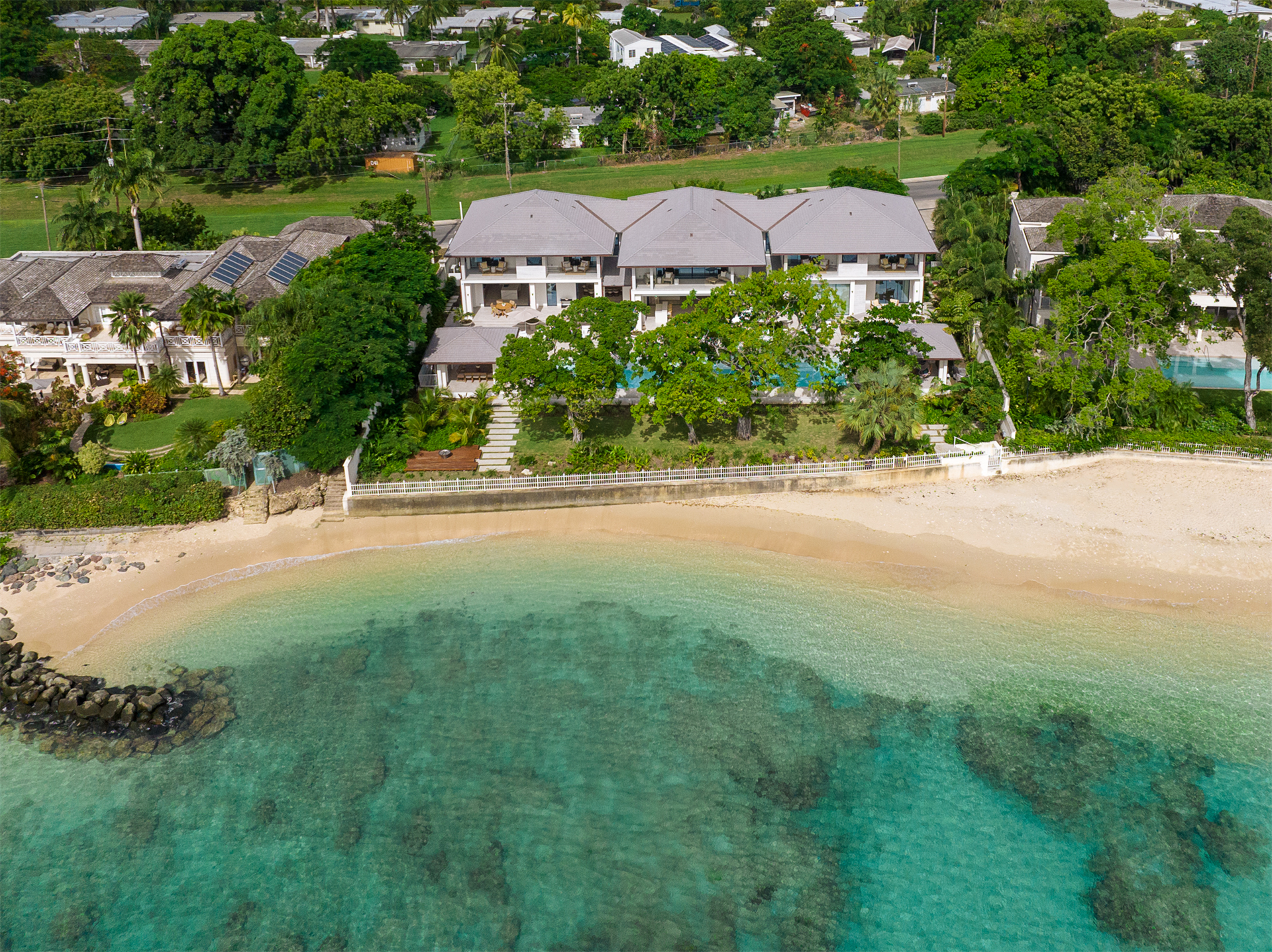 From the lush garden, guests can step directly into the warm Caribbean waters for tropical snorkeling. The grand carriage entrance to this mansion-like estate features a captivating water feature, setting a tone of elegance and sophistication.