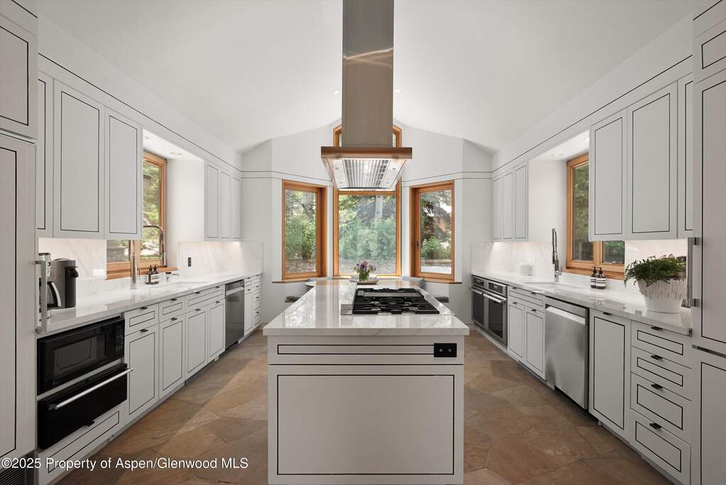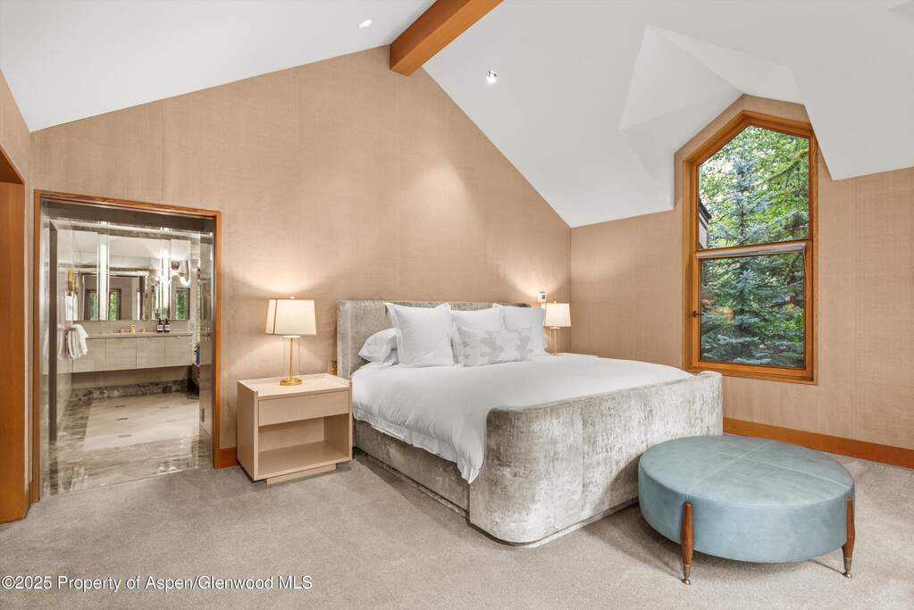 A elegant, European inspired 9000+ square foot Villa in one of the most private areas of Aspen near the Aspen Institute and minutes from Aspen's Core. Situated on over half an acre in a wooded setting, privacy is ensured. A gracious circular snow melt driveway leads to the beautiful wood double doors which open to a high ceiled entry. The exterior stone flows into the interior through the stone staircase that curves gracefully up the stairs to the main level which encompasses the office, primary bedroom and ensuite, and the main living area. Soaring ceilings of honey colored wood contrast beautifully with white walls and the elegant black columns that support the vaulted, beamed ceiling add a beautiful accent to the honeyed tones. Huge windows accented in the same honey wood give the feeling of being outdoors. The furnishings echo the sophistication of the architecture with warm wood tones, neutrals, and texture. The stone woodburning fireplace carries on the theme. Around the corner is the 'wet' bar with glass cabinets, mini fridge and seating for 4. The dining room has a beautiful honey wood table which matches the beams and seats 12. The kitchen is the sought after 'white kitchen' with accents of black. It has a gas cooktop with 6 burners and a griddle, double refrigerators, double sinks and banquet seating for breakfast dining. Turning left from the front stairs is the office which features stone floors, soaring windows, built-in cabinets and bookshelves, a beautiful black desk and large screen TV. Next door is the primary suite with a king bed, multiple windows which allow the light to shimmer over the neutral shades and knubby texture of the furnishings, built-ins and two closets. More closets can be found in the ensuite which has an enormous, jetted tub, a steam shower and double vanities. One level down is a great surprise, a large indoor pool and hot tub with a cascading water feature at one end and an atrium ceiling that opens. A large media/game room looks out over the pool through a wall of glass doors. A large screen TV on the far wall and an elegant copper bar at the other end of the room make this a perfect entertainment space. Four of the guest rooms are on the lower level, all are private, all have ensuites, and all have steam showers. A full gym in the garage, large laundry room with two washers and two dryers, AC throughout, radiant heat, grassy backyard area, numerous decks, an outside grill put the icing on the cake. Offered short term or long term, you will have the ultimate Aspen experience while vacationing in this gorgeous Villa. STRC 085760