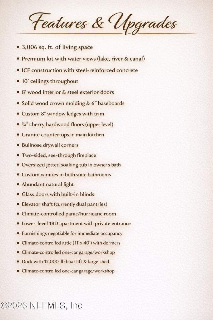 Experience the perfect blend of waterfront luxury and income potential in this unique Key West Inspired, thoughtfully designed, luxury, custom home. The primary residence boasts 2BD/2BA, and features open-concept living with over-sized, sun-drenched windows, hardwood floors and soaring 10-foot ceilings. A two-sided see-through gas fireplace anchors the main living space, offering warmth and elegance from every angle, and a large chef's dream kitchen with plenty of storage, granite countertops, KraftMaid cabinetry, double ovens, and soft-close drawers and doors. Finish your perfect day of boating and fishing with a therapeutic hydrotherapy experience in the oversized jetted tub paired with a fireplace. The Primary en-suite also features an oversized walk-in shower, a heated towel rack, and custom-designed vanities. Lots of upgrades please see Features & Benefits sheet available under the documents page. Versatile Second Unit: On the lower level, a separate, fully contained and equipped, beautiful 1BD/1BA apartment. The apartment features its own luxury kitchen with premium cabinetry and quartz countertops, full bathroom and large bedroom. The private entrance makes this a perfect space for extended family, extra rental income or even a home office. Thoughtfully designed and impeccably constructed, this residence exudes sophistication, strength, and style. Spanning 3,006 square feet of living space, plus 536 square feet of unfinished air-conditioned attic, this 3-bedroom, 3-bathroom home showcases ICF (Insulated Concrete Form) construction, steel-reinforced and concrete-filled for unmatched durability, energy efficiency, and peace of mind. Property Highlights: " Solid ICF (Insulated Concrete Form) construction with steel-reinforced, concrete-filled walls " One owner; original blueprints available " Versatile lower-level second unit with 1 bedroom and 1 bathroom " 8-foot solid wood and steel interior doors " -inch rich cherry hardwood flooring " Granite stone countertops in the main kitchen " Soft-close cabinetry in both kitchens " Tall 8-inch baseboards and custom wood crown molding throughout " Bullnose drywall corners " Abundant natural light throughout " Elevator shaft (currently dual pantries), pre-plumbed and ready for an 8-foot residential elevator " Climate-controlled hurricane/panic room for safety and secure storage " Climate-controlled attic space (approx. 11' x 40') " Climate-controlled garage/workshop " Boat shed on dock plus large dockside storage shed " Additional plastic garden shed Outdoor living is equally captivating. Enjoy your morning coffee on the full wraparound porch with spectacular water views of spring-fed Lake Saranac, the St. Johns River, and the neighborhood Harbor, while listening to the tranquil sounds of the waterfall. Depart from your private dock, with a 12,000-lb elevator boat lift, to enjoy endless days of fishing the St. Johns River, cooling off at the nearby sandbars or a day of swimming in the crystal clear waters of Salt Springs and Silver Glen. The Seller is open to sell the additional waterfront lot located across Gibbs Road, offering a rare opportunity to expand your waterfront lifestyle or investment potential. The lot fronts spring-fed Lake Saranac, which flows directly into the St. Johns River. The parcel measures approximately 154' x 57' with approximately 45 feet of frontage on Lake Saranac, making it ideal for a separate residence for in-laws or extended family, a guest cottage, or an additional income-producing home, subject to applicable zoning and permitting. Nestled within a desirable, quiet waterfront neighborhood, with newly paved roads, this home radiates tranquility and understated luxury, the perfect blend of craftsmanship, comfort. It is a rare opportunity to own a home built for a lifetime. Schedule your private tour today.