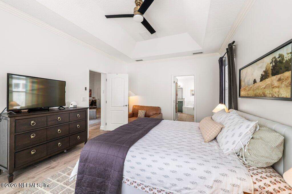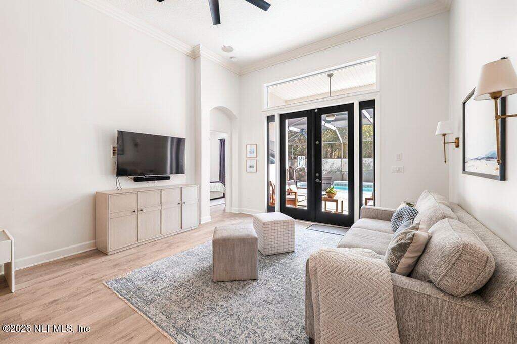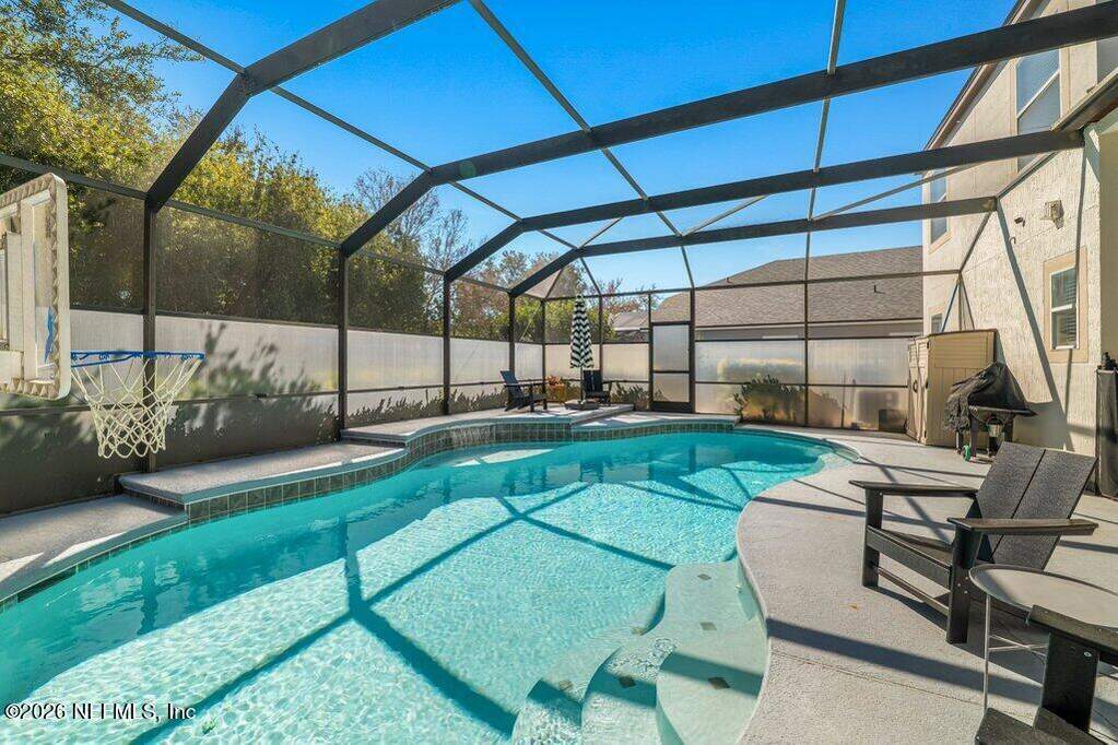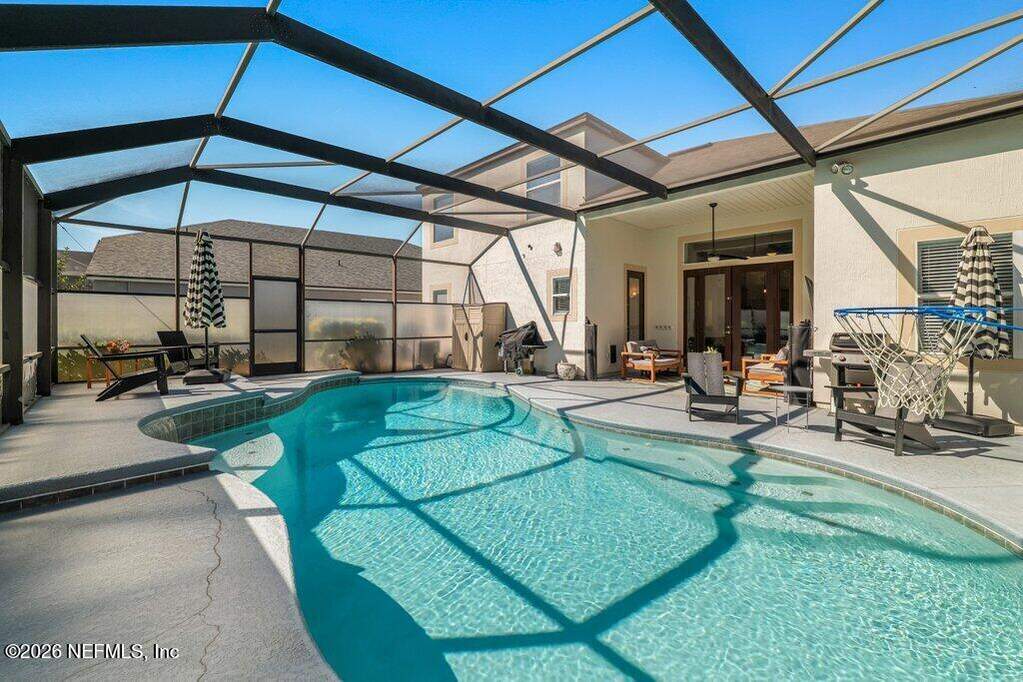 Beautifully updated pool home on a cul-de-sac in the highly sought-after St. Johns Forest community! Home features 12-foot ceilings and 5 bedrooms plus a dedicated home office or flex room; Upstairs shows as a media/play room or private guest retreat (BDR 5). Enjoy outdoor living with a large solar heated salt pool with privacy screen enclosure pool bath and fully fenced backyard. You'll have peace of mind with many recent upgrades including a brand new pool salt system, pool pump, newer kitchen appliances, newer roof, water heater, water softener, ceiling fans and light fixtures, newer HVAC systems with smart thermostats. Spacious master and primary bathroom renovated with tile glass shower. Located in the heart of St. Johns. Easy access to shopping, dining, parks, and major highways. Community has a 24/7 manned security gate - amenities include clubhouse, pool, playground and tennis courts. HOA includes internet. This home is a rare find in one of the area's most desirable zip codes!
