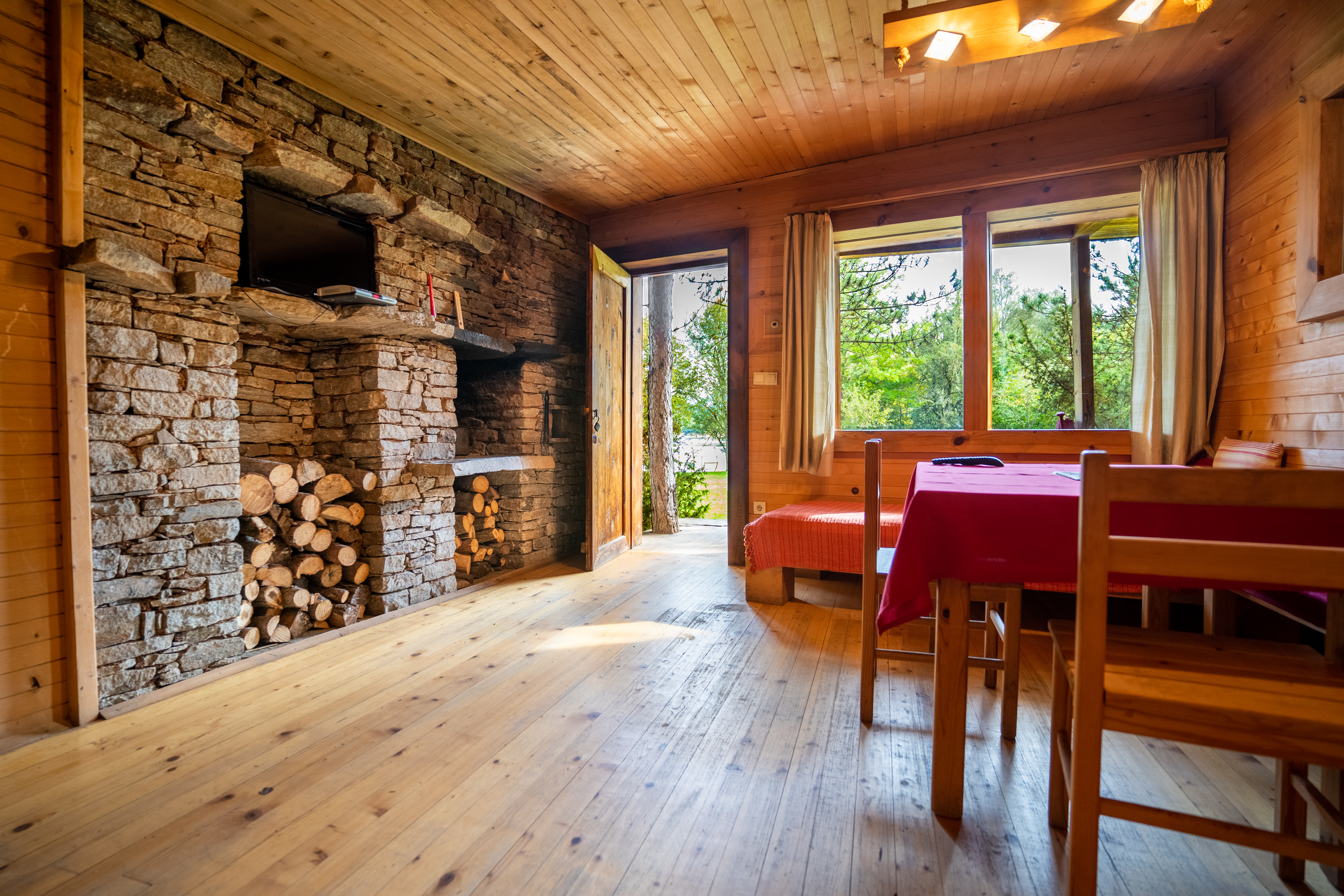 Comfortably furnished, this house features two separate beds, a fireplace, a small kitchen, a dining table, and a bathroom with a toilet. Immersed in the spirit of the forest, it is surrounded by wildflowers and located close to the outdoor pool and all village activities.