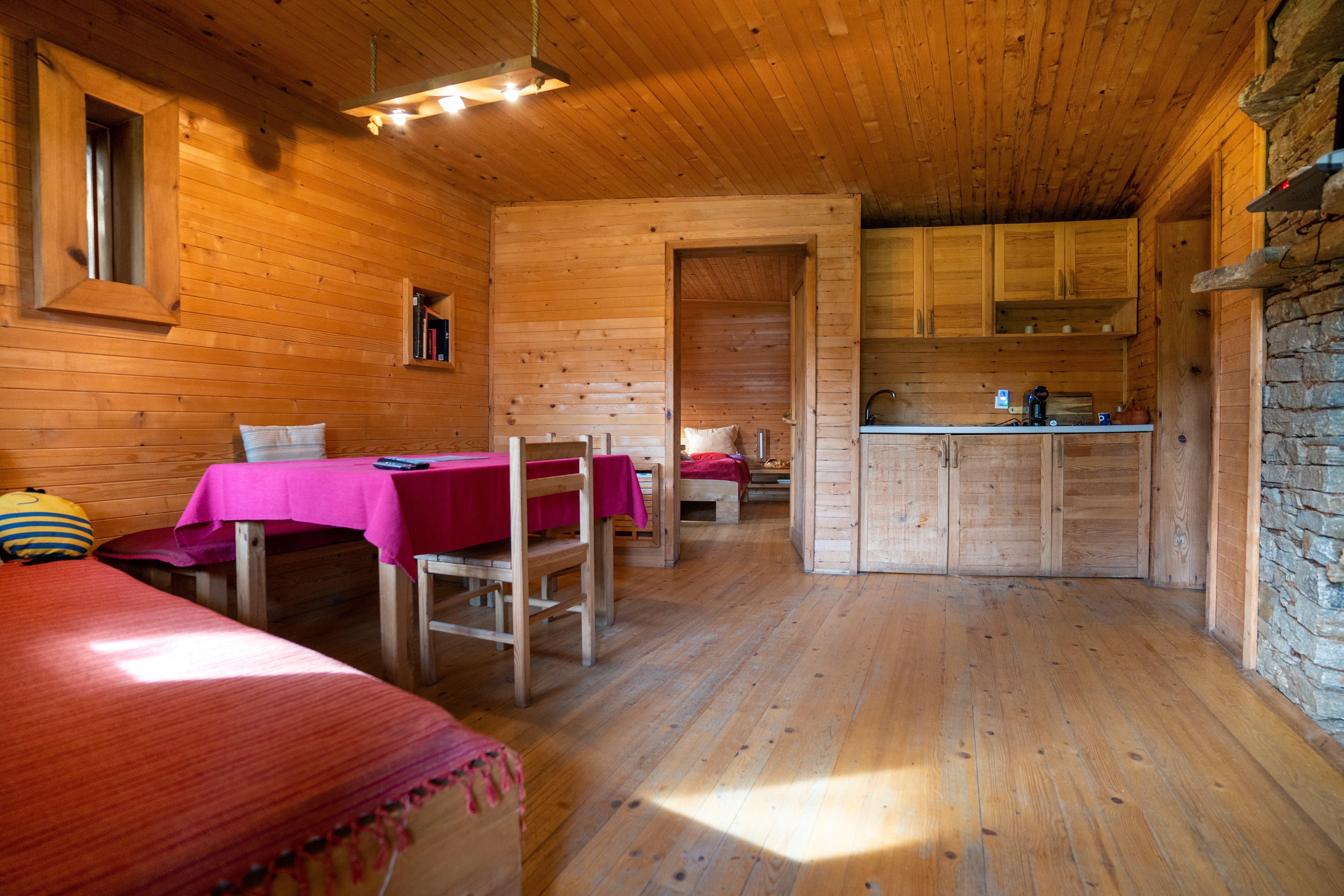 True to its name, the house's construction is elevated, with its chimney appearing to hold it aloft. This house features an open-plan layout with a shared fireplace connecting two rooms and a bathroom with a toilet. The bedroom boasts a 200 x 200 cm bed, while the living area includes an additional bed, a table by the fireplace, and large windows opening up to views of the forest and the stars.