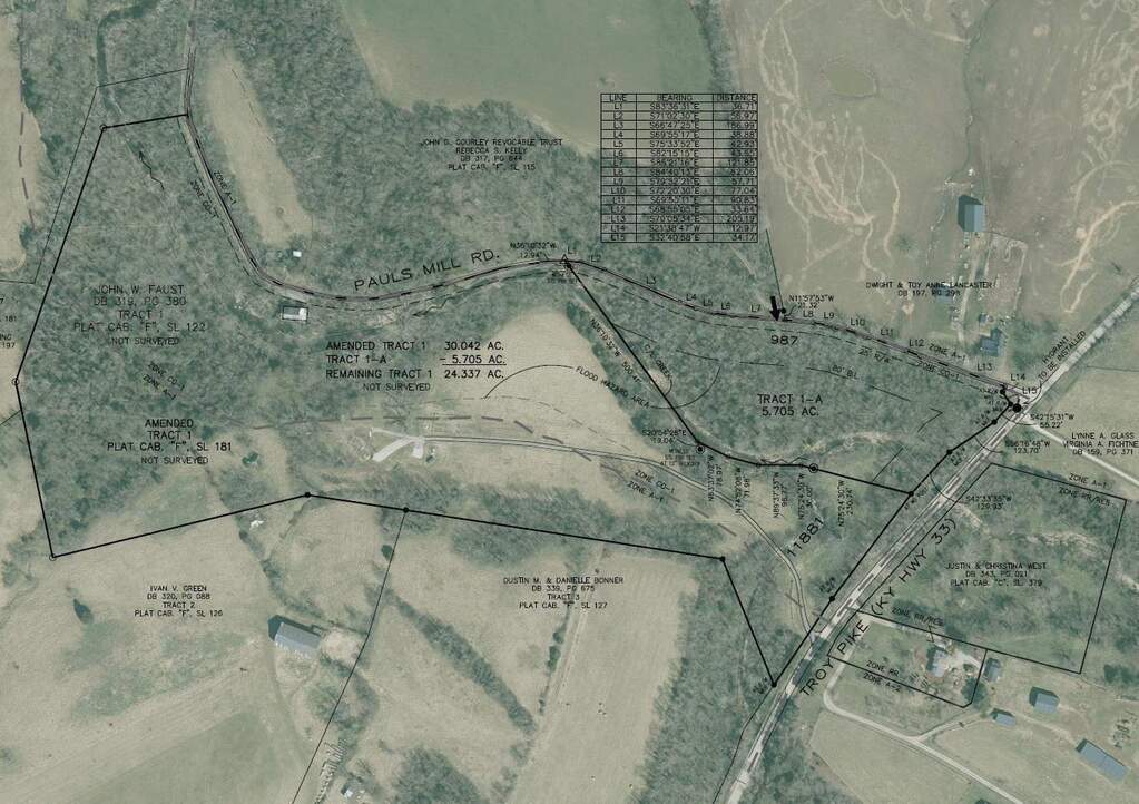 Located on a 5.705 acre parcel at 987 Pauls Mill Road in the Guyn's Mill Historic District, this proposed Southern Living Showcase Home offers a thoughtfully designed layout by Kurk Homes, a Southern Living Custom Builder Program member. The plan features a single-story design with a bonus room above the garage, providing adaptable space for future living or storage needs. A detached 3-car garage, casita with its own living area and bedroom, and covered outdoor living spaces are included in the proposed design. Interior selections from the Showcase Home plan include open living areas, a centrally designed kitchen layout with island seating, and a primary suite concept featuring large windows and an expansive bath design. The homesite features rolling, wooded terrain with frontage along Clear Creek, historic stone walls, and mature tree lines along the roadway. Wildlife, including deer and turkey, is commonly seen in the area. A recent survey and perc test have been completed. This parcel is part of Indian Springs Farm and represents a rare offering in a location where land has seldom been available since the 1700s. This proposed construction presents an opportunity to build a Southern Living-inspired home in a scenic and historic setting in Woodford County, approximately 15 minutes from Versailles and convenient to Lexington amenities. The builder is Easley and Faust Home Builders LLC. The lot is also listed by itself as ML # 25507026. Builder could build other plans that better suit your needs.