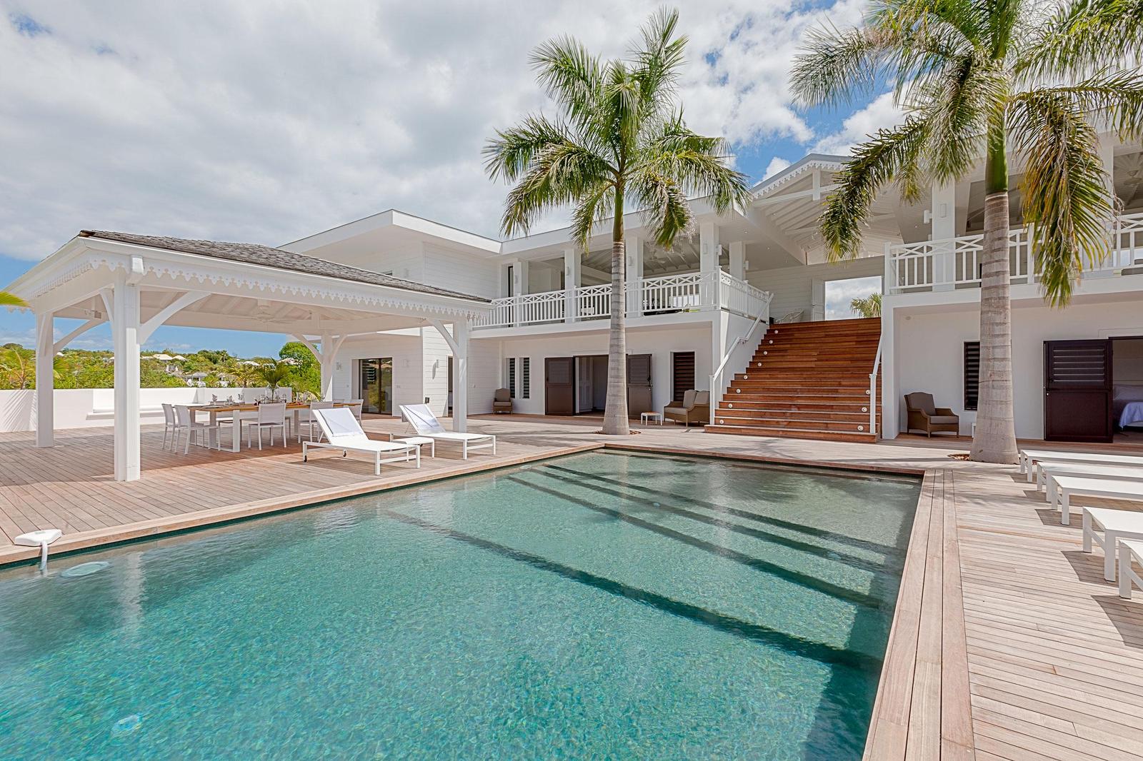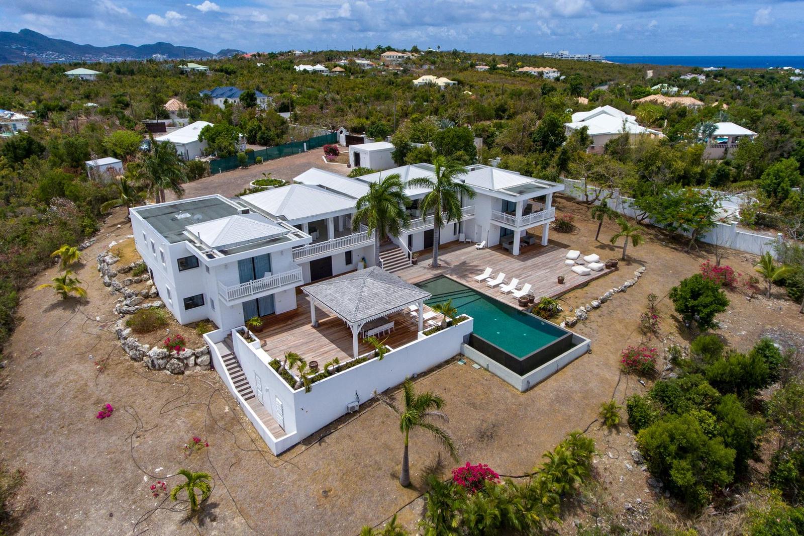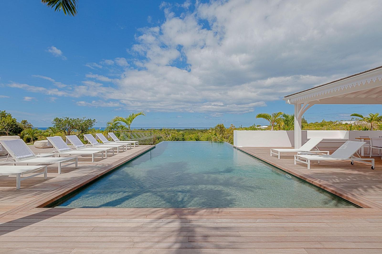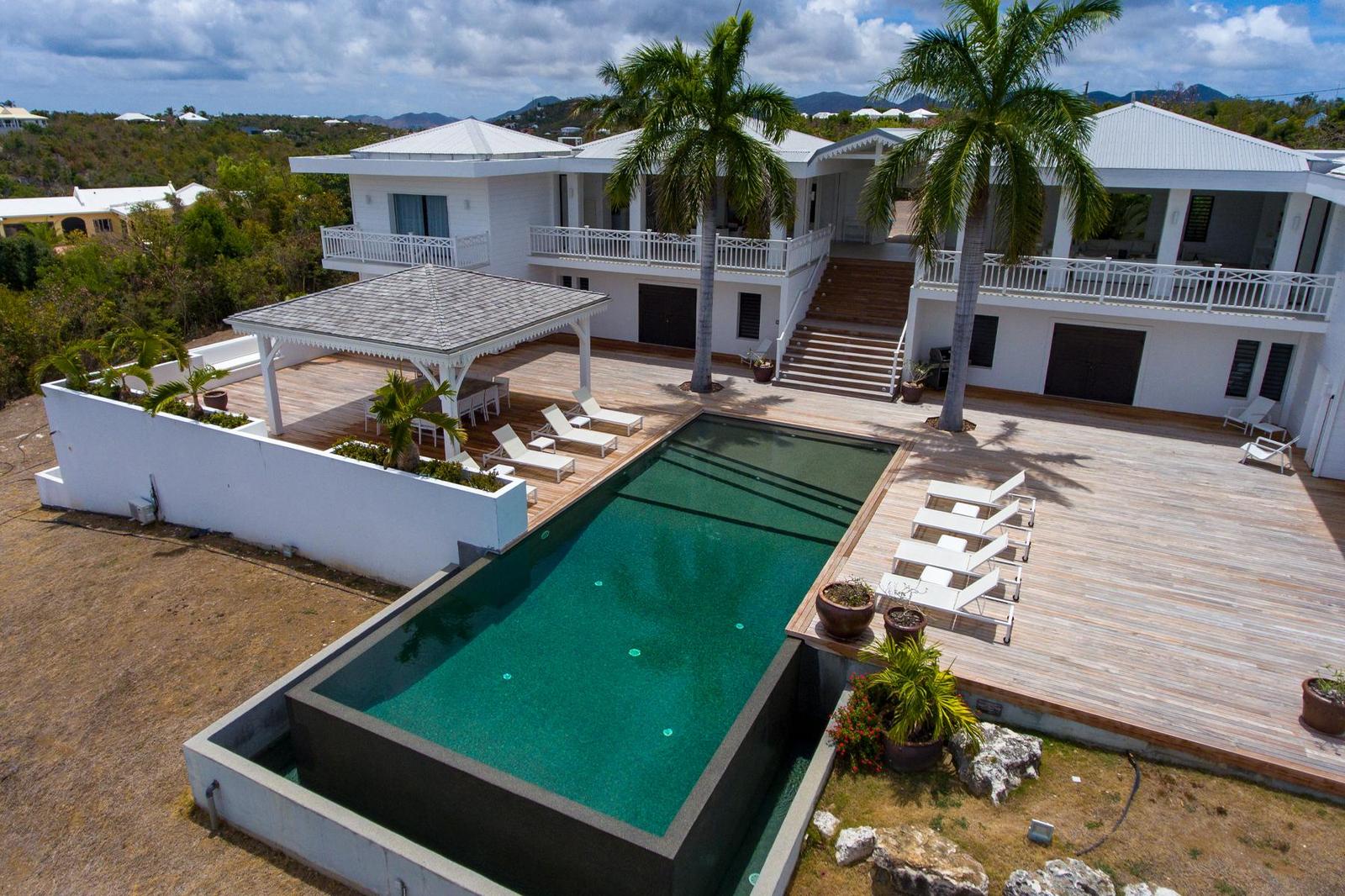 Villa Always completely renovated into a fabulous 6 bedrooms property.Built on 2 levels accommodating 6 bedroom suites, the residence has a vast living/dining area and gourmet kitchen and a large pool and deck with pool side gazebo.The main level accessed over a small bridge and water feature, houses the stunning white interior spaces of the living/dining area and gourmet kitchen completely open on one side to the fabulous ocean sunset view and view over the pool area. Flanking the living area on either end are two palatial bedroom suites each with king –size beds, private balconies overlooking the pool terrace and Victorian style en-suite bathrooms.A grand staircase descends from the main level to an extensive deck with a large infinity pool and shaded gazebo with outside dining and lounging area. The four remaining bedroom suites each with an en-suite bathroom open off the pool terrace.Villa Always St Martin is within minutes of the beautiful Terres Basses beaches.