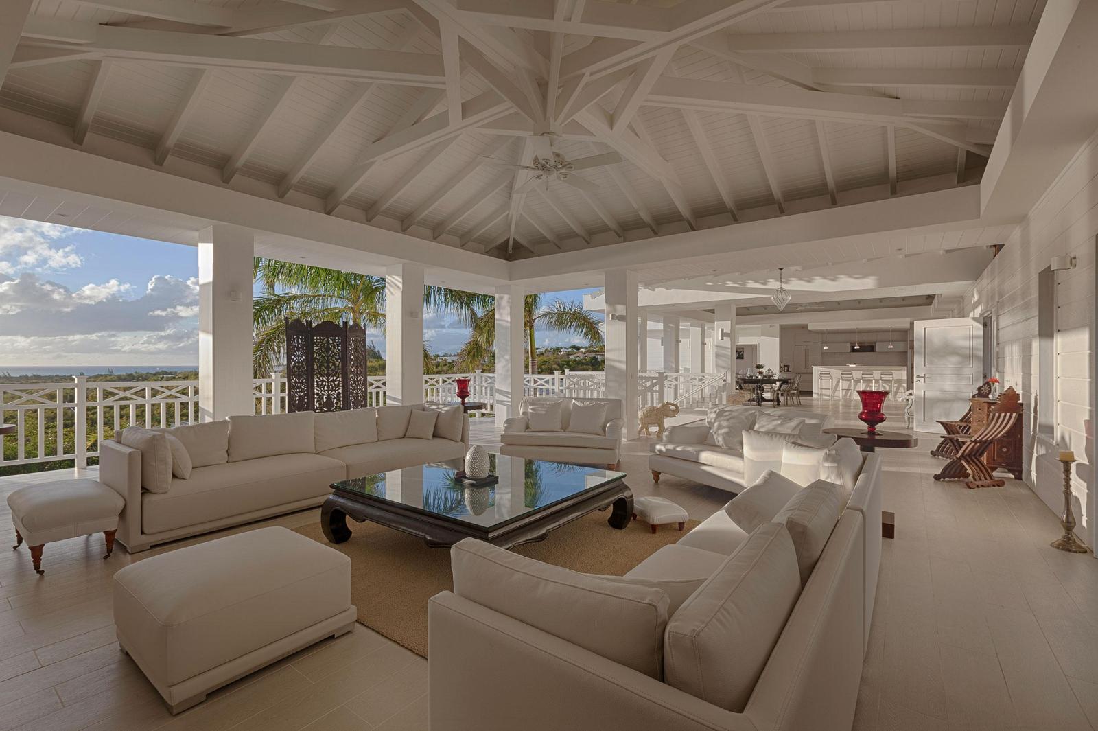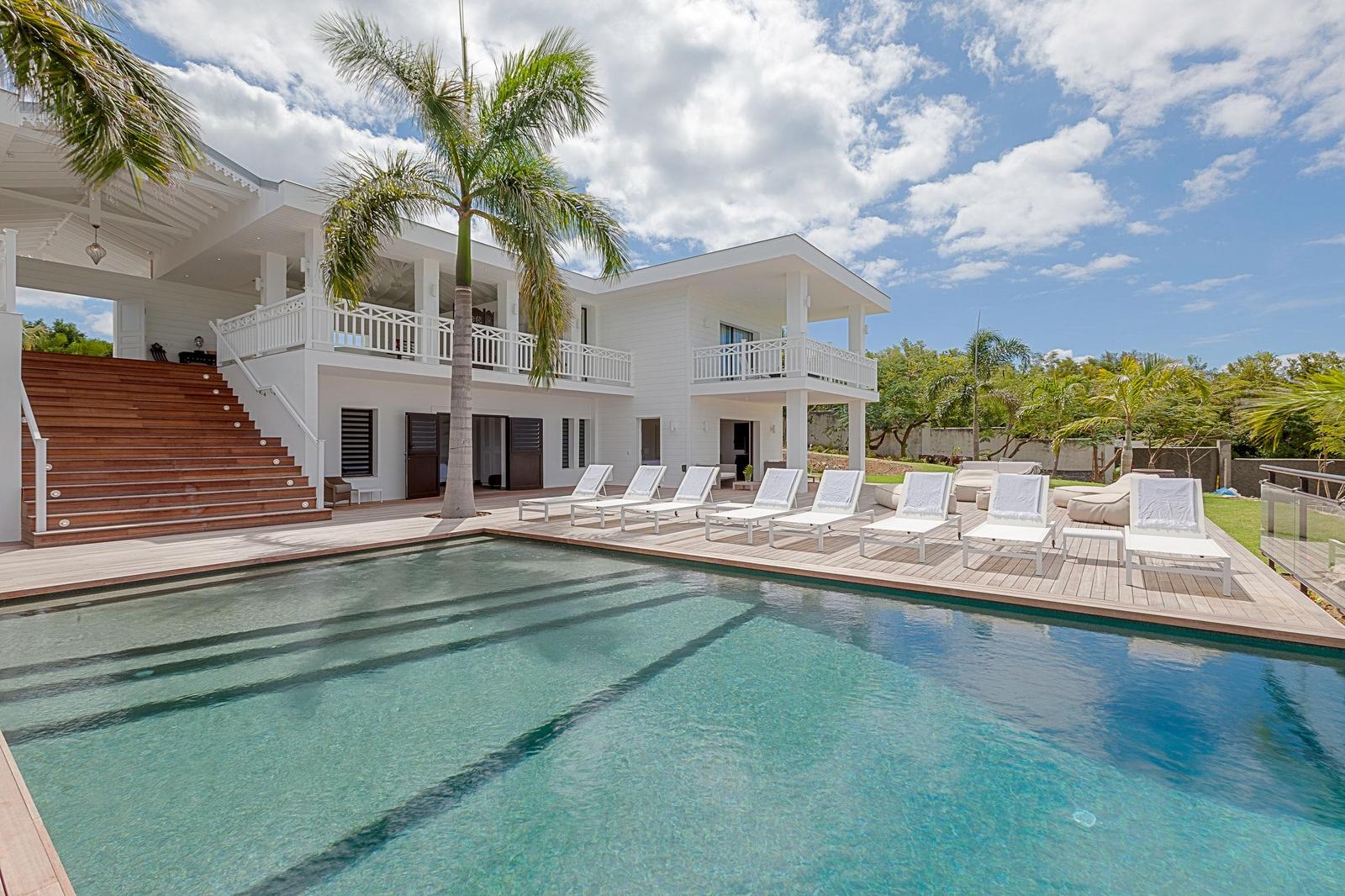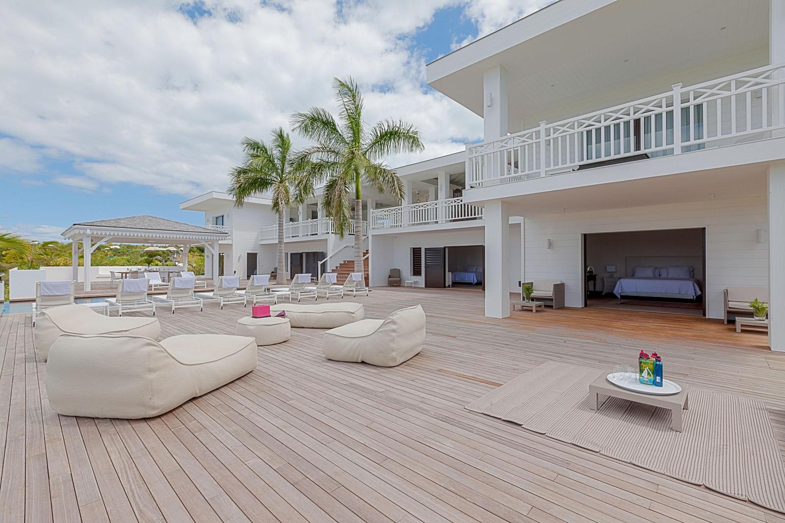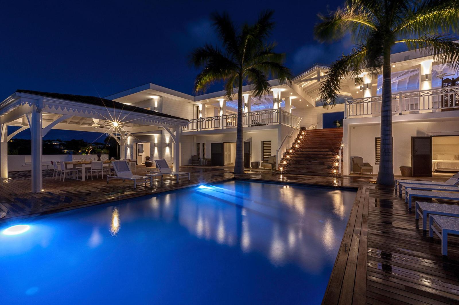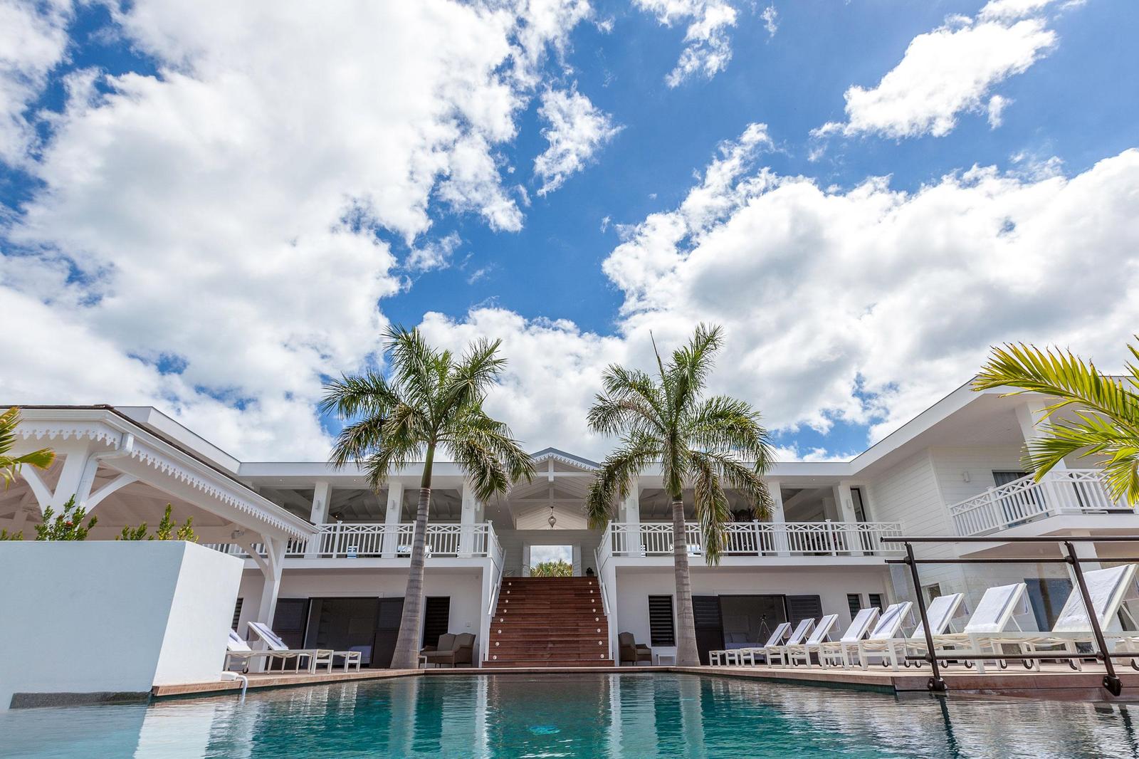Villa Always completely renovated into a fabulous 6 bedrooms property.Built on 2 levels accommodating 6 bedroom suites, the residence has a vast living/dining area and gourmet kitchen and a large pool and deck with pool side gazebo.The main level accessed over a small bridge and water feature, houses the stunning white interior spaces of the living/dining area and gourmet kitchen completely open on one side to the fabulous ocean sunset view and view over the pool area. Flanking the living area on either end are two palatial bedroom suites each with king –size beds, private balconies overlooking the pool terrace and Victorian style en-suite bathrooms.A grand staircase descends from the main level to an extensive deck with a large infinity pool and shaded gazebo with outside dining and lounging area. The four remaining bedroom suites each with an en-suite bathroom open off the pool terrace.Villa Always St Martin is within minutes of the beautiful Terres Basses beaches.