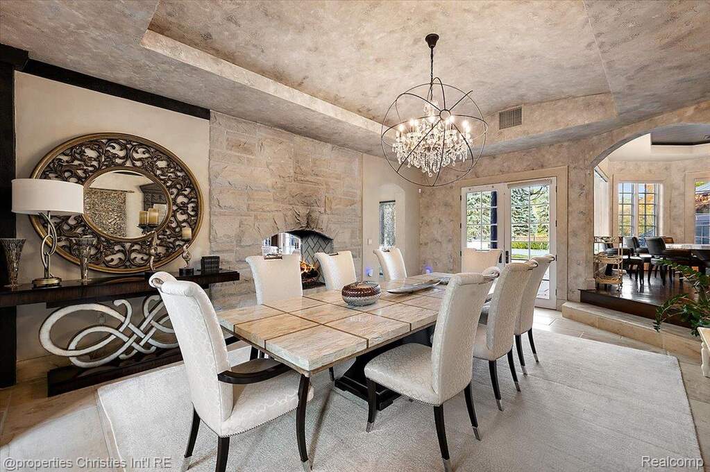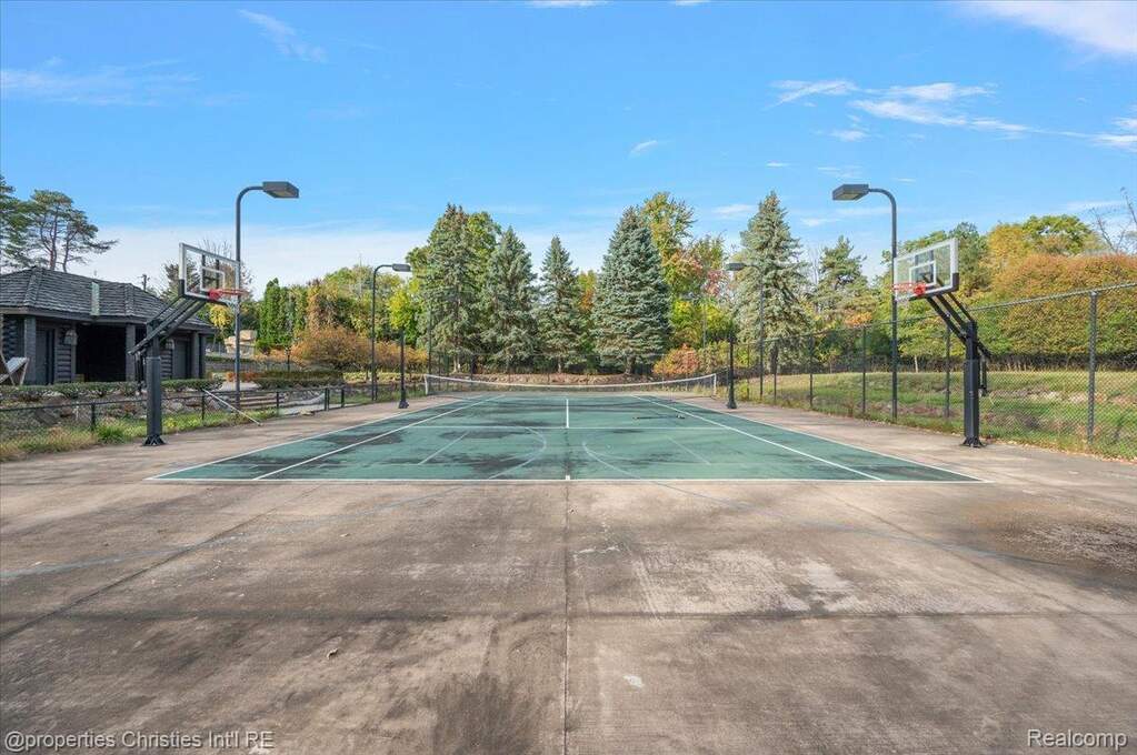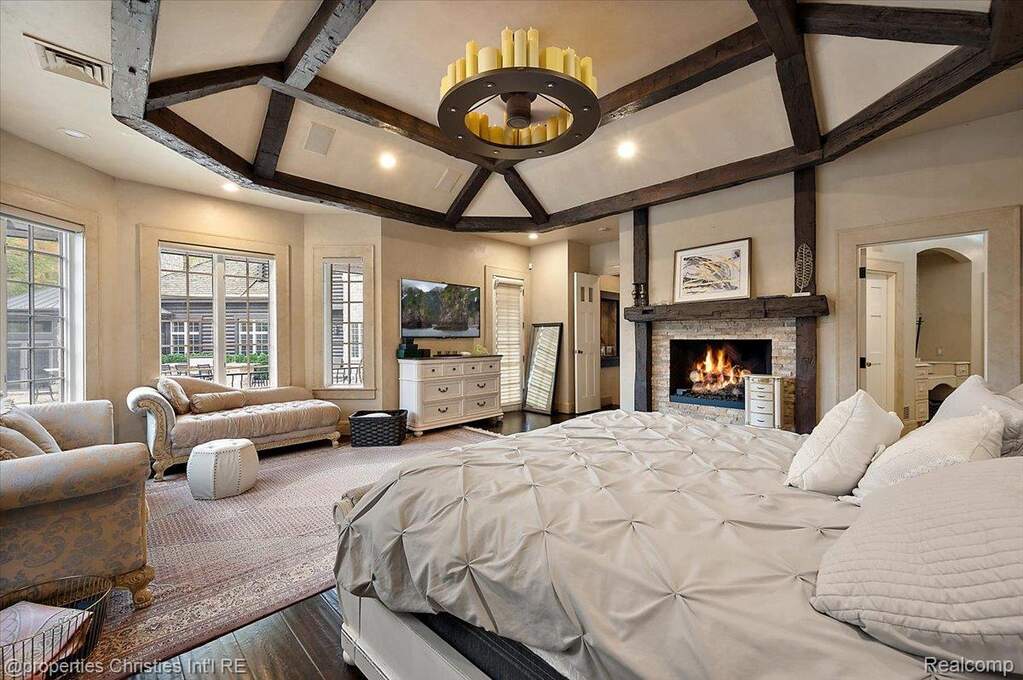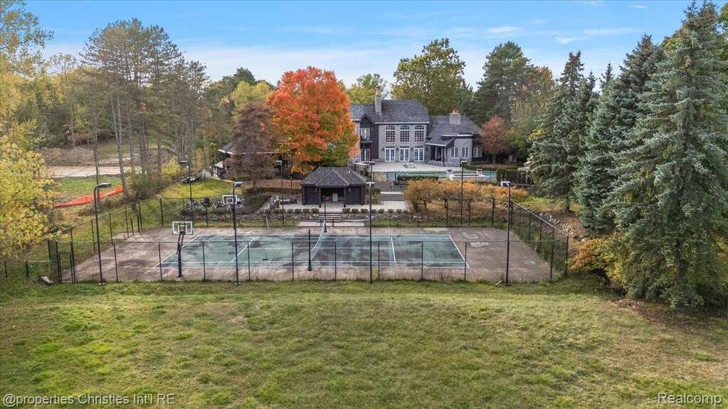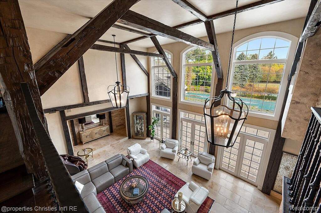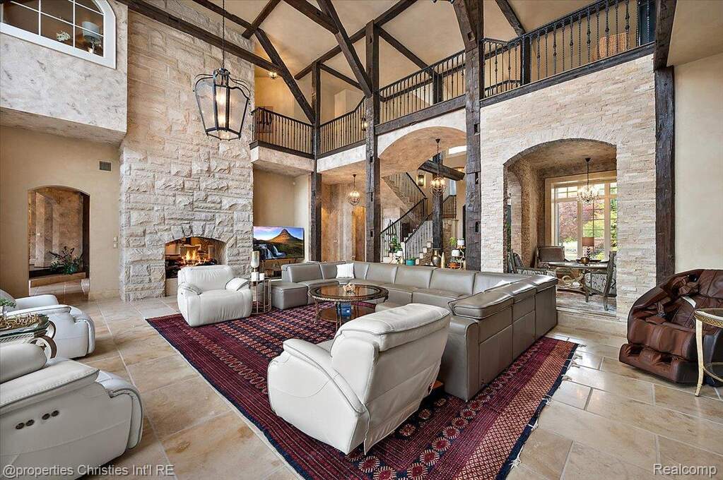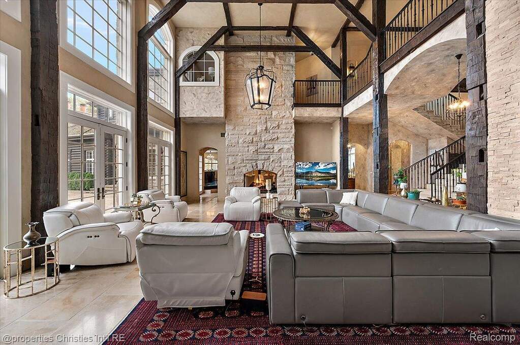 Experience timeless elegance and modern luxury on nearly four acres of pristine grounds. This extraordinary estate evokes the grace and character of a grand European manor, blending old-world craftsmanship with refined comfort. Upon entry, you're greeted by soaring ceilings and a stunning interplay of rich wood beams and natural stone, setting the tone for the home's sophisticated design. The layout seamlessly balances formal and casual living, with a sunlit two-story great room featuring expansive windows that frame breathtaking views of the property and a striking two-sided stone fireplace shared with the gracious dining room. Two primary suites are conveniently located on the main floor, each offering a spa-like ensuite bath, dressing room, and dry sauna-creating the ultimate retreat. The chef's kitchen is a true centerpiece, boasting dual islands, premium appliances, and a spacious breakfast area that opens to the inviting family room accented by the same magnificent beams and stonework. Enjoy the changing seasons in the charming three-season room or ascend one of two elegant staircases to discover four additional bedrooms and three full baths upstairs, providing ample space for family and guests. Outside, the property transforms into a private resort with an in-ground pool, pool house with full bath, sports court, and oversized gas fire pit-all surrounded by beautifully landscaped grounds. Residents also enjoy exclusive privileges at Upper Straits Lake. A rare offering where timeless architecture meets modern comfort-this is estate living at its finest.