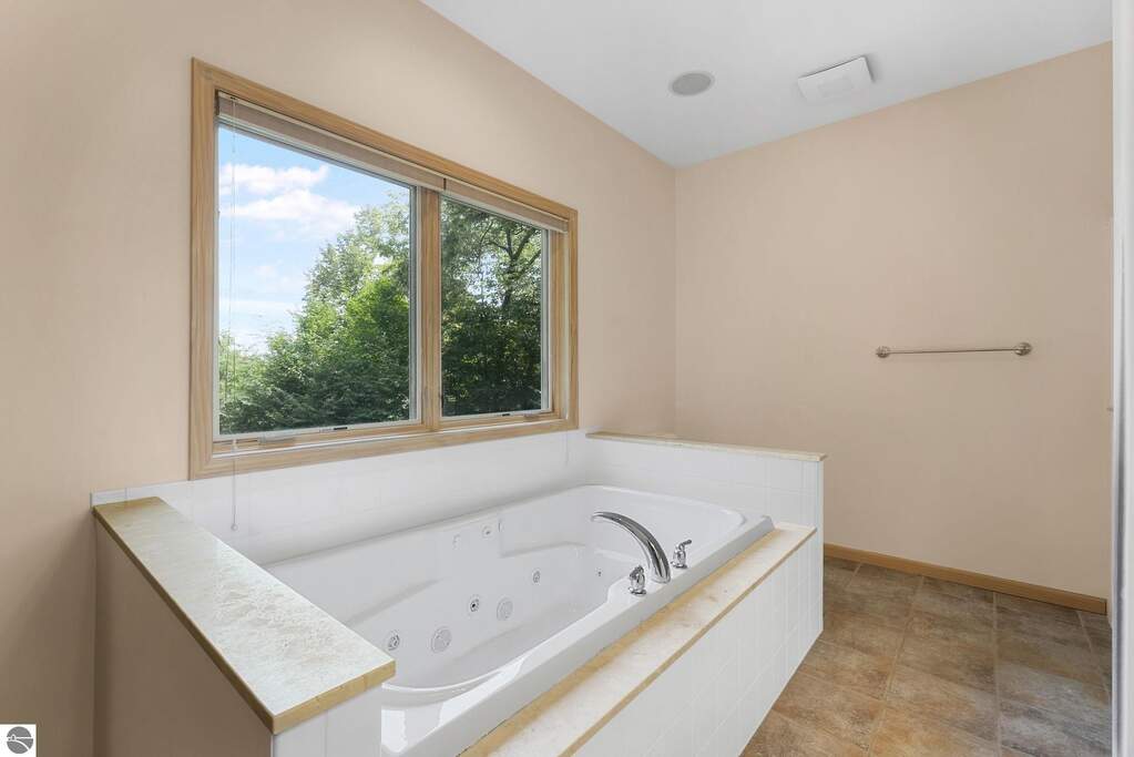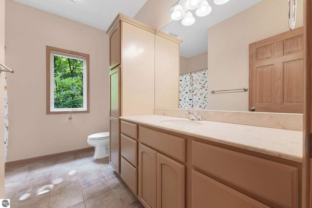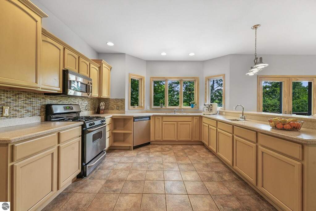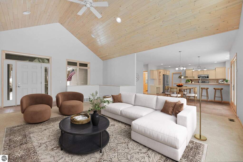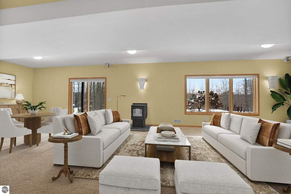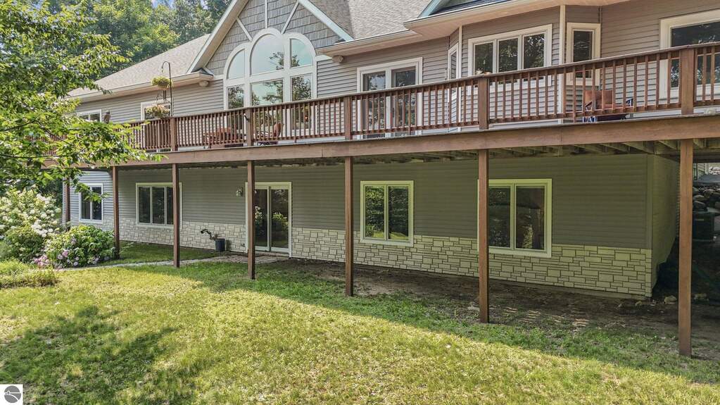 Nestled in a tranquil, treehouse-like setting on 1.6 acres, this 4-bedroom, 3.5-bath home in Truax Lake captures the essence of Up North living. This neighborhood enjoys a private access point to the Pere Marquette State Forest, with thousands of miles of scenic trails for hiking, biking, and year-round recreation. Step inside to vaulted ceilings and an open concept living space anchored by a floor-to-ceiling river stone fireplace. The spacious kitchen is well-appointed with solid wood cabinetry, natural stone countertops, stainless steel appliances, and picturesque views of the tree-lined backyard. The elevated deck spans the length of the home, overlooking the woodland canopy views. A cozy three seasons porch, wrapped in knotty pine, invites you to relax amidst the forested surroundings throughout the year. The primary bedroom features private deck access, walk-in closet and an ensuite bath with a dual vanity, jetted tub, and walk-in shower. Two additional bedrooms, a full bathroom, powder room, and laundry room complete this floor - offering the ease of single-level living. The walk-out lower level provides a large recreation room, bar area, guest bedroom, full bathroom, and an additional 1,225 sq. ft. of storage space. A landscaped backyard with a flagstone path leads to a fire pit, perfect for gathering under the stars and enjoying the peaceful Northern Michigan nights.