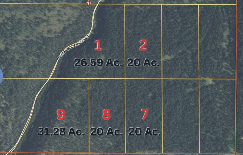 117.87 acres on 5 parcels with mountain views and Dayton Creek waterfront! This is a beautiful location tucked away and surrounded by nature, offering a beautiful balance of tree cover-a lush, magical forest setting without limiting buildability. The land features level terrain with numerous prime building sites, making it easy to design your ideal home, cabin, or retreat. Septic approval is in place, and power transformers are on site.