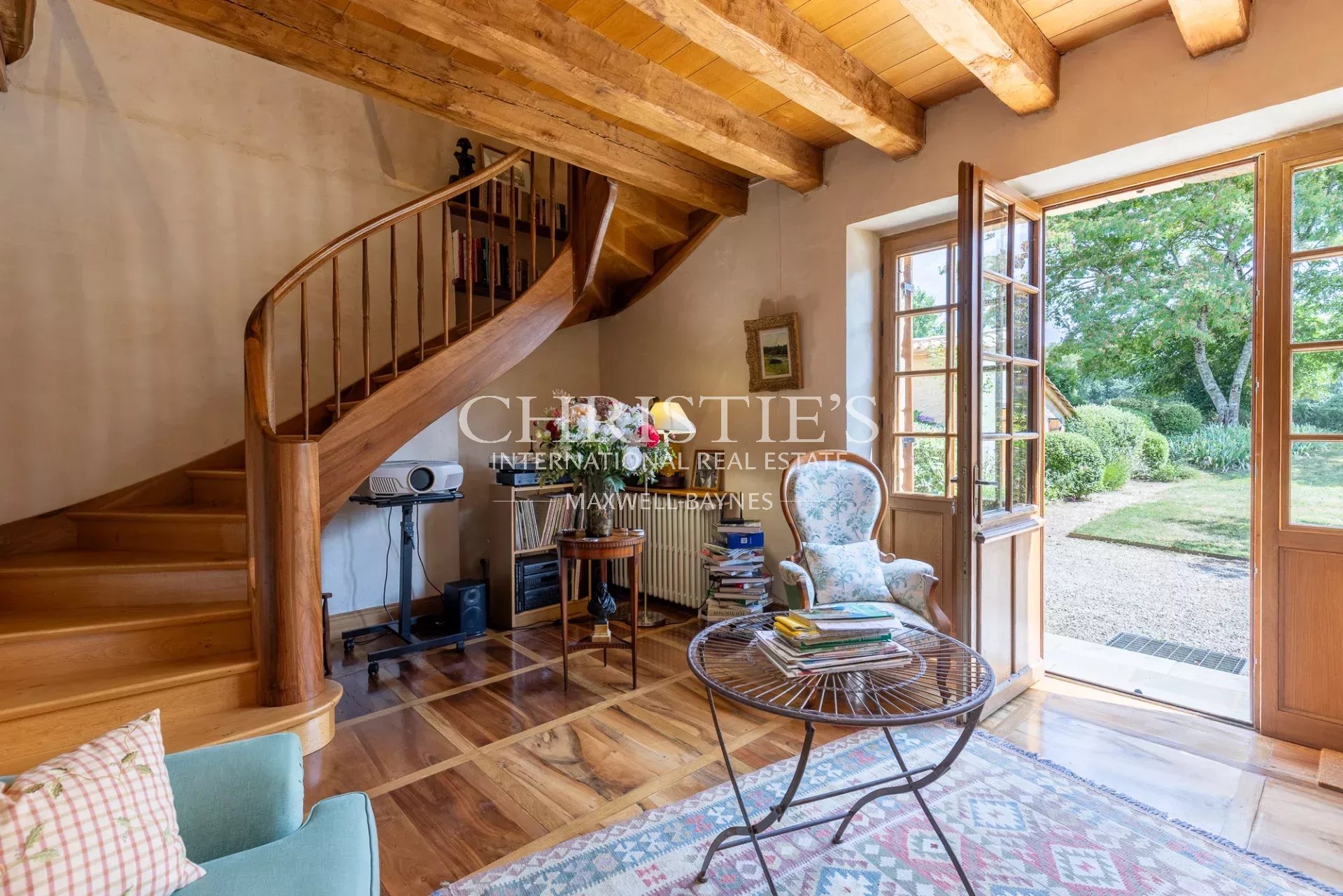 The spacious living room exudes charm with its parquet flooring, exposed beams, and open fireplace, a peaceful haven for relaxing or entertaining. Adjoining this is a well-appointed office, offering a quiet space for work or study.