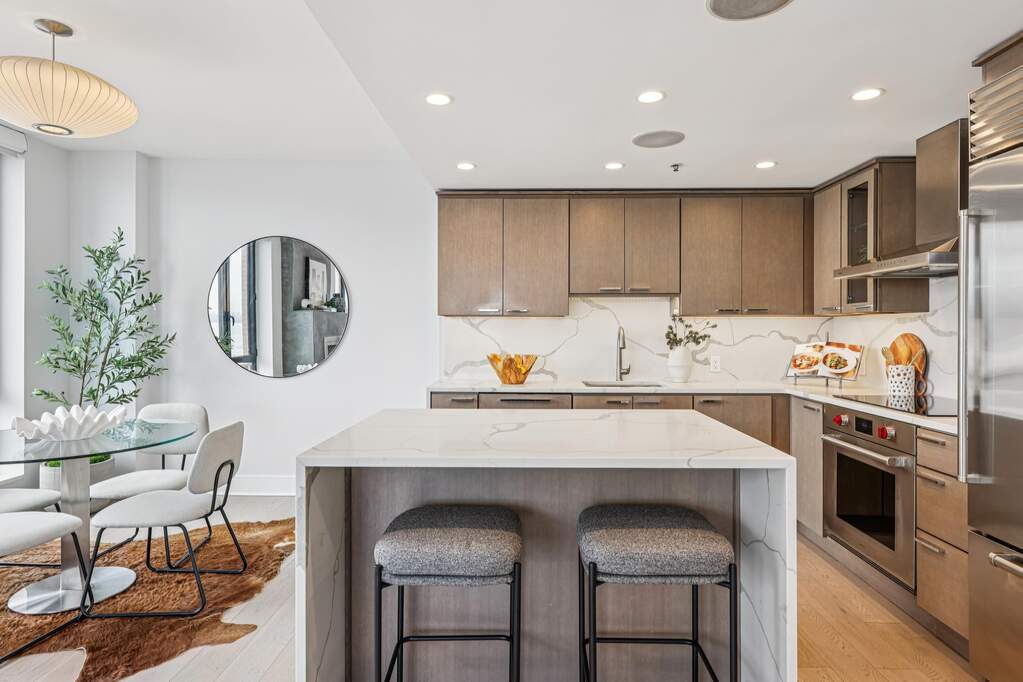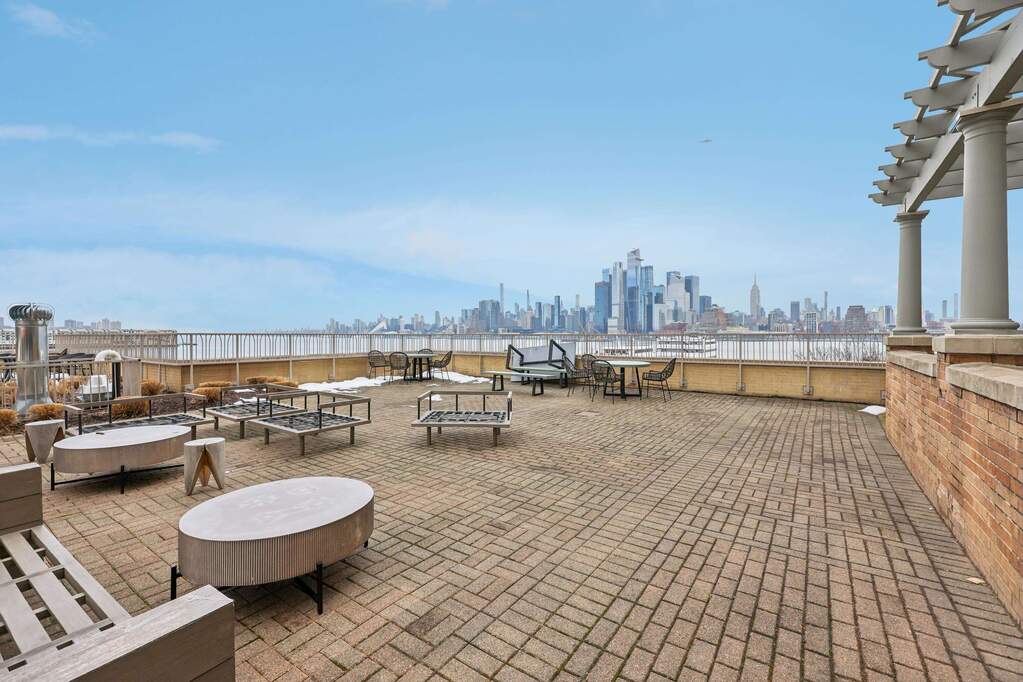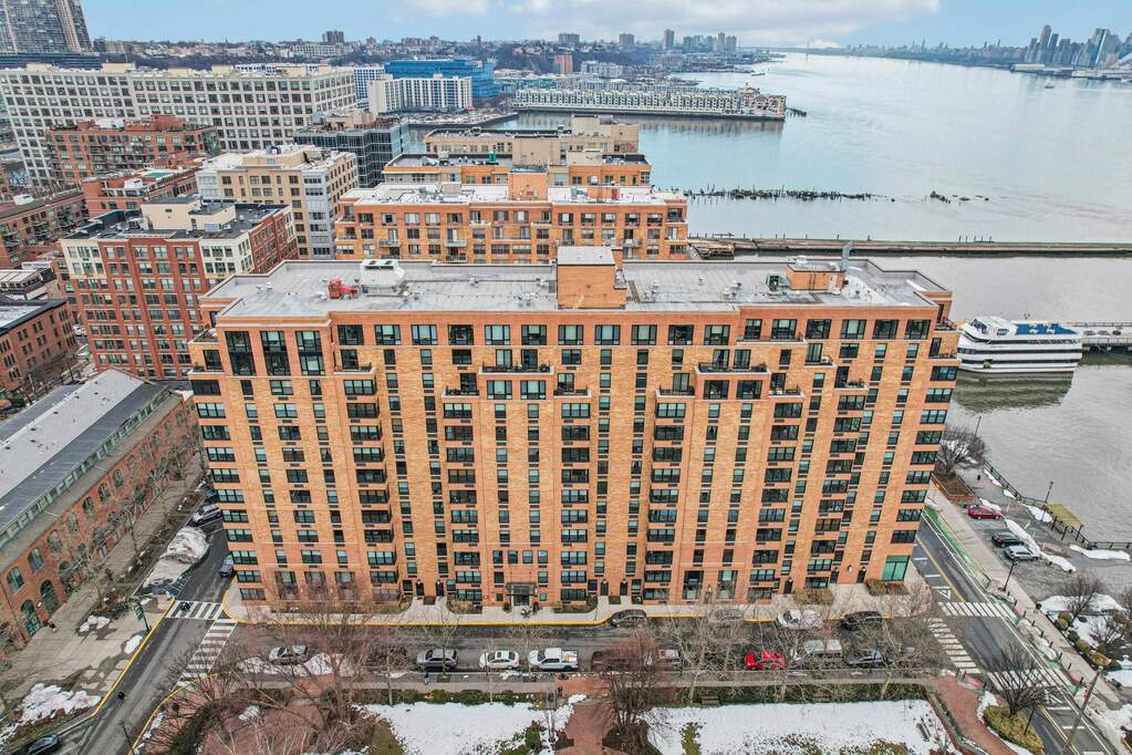 Rarely available northeast corner residence showcasing direct, panoramic views of the Manhattan skyline and Hudson River from every room. Perched within one of Hoboken's most coveted waterfront communities, this sun-drenched 3-bedroom, 2.5-bath home offers an extraordinary vantage point, where sunrise light pours in and the city skyline becomes your daily backdrop. Thoughtfully designed with meticulous attention to detail, the open-concept layout is anchored by a stunning designer kitchen positioned to capture direct NYC views. Outfitted with top-of-the-line appliances including a Wolf stove with induction cooktop and a SubZero refrigerator, the space is complemented by elegant quartz countertops and a full-height backsplash. Custom finishes throughout include wide-plank oak hardwood floors, Hunter Douglas electric blinds, Lutron lighting, a Hearth Cabinet ventless fireplace, spa-inspired bathrooms with Toto fixtures, and abundant custom closet space. Well-proportioned rooms, natural light from multiple exposures, and refined design elements create a seamless blend of sophistication and comfort. Residents enjoy full-service luxury amenities including a 24/7 concierge, dual elevators, a gym on the third floor, a landscaped fourth-floor courtyard with a children's play area, seasonal outdoor pools (add'l fee), and on-site garage parking options (add'l fee). Perfectly positioned on the uptown Hoboken waterfront, you are just minutes from the ferry and bus to NYC, the 13th Street Pier, waterfront promenade, parks, marina, top-rated schools, and the vibrant shops and restaurants along Washington Street. This is waterfront luxury living at its finest, offering peaceful riverfront serenity without sacrificing convenience, connectivity, or style. Come unpack, enjoy, and make this your new home today!