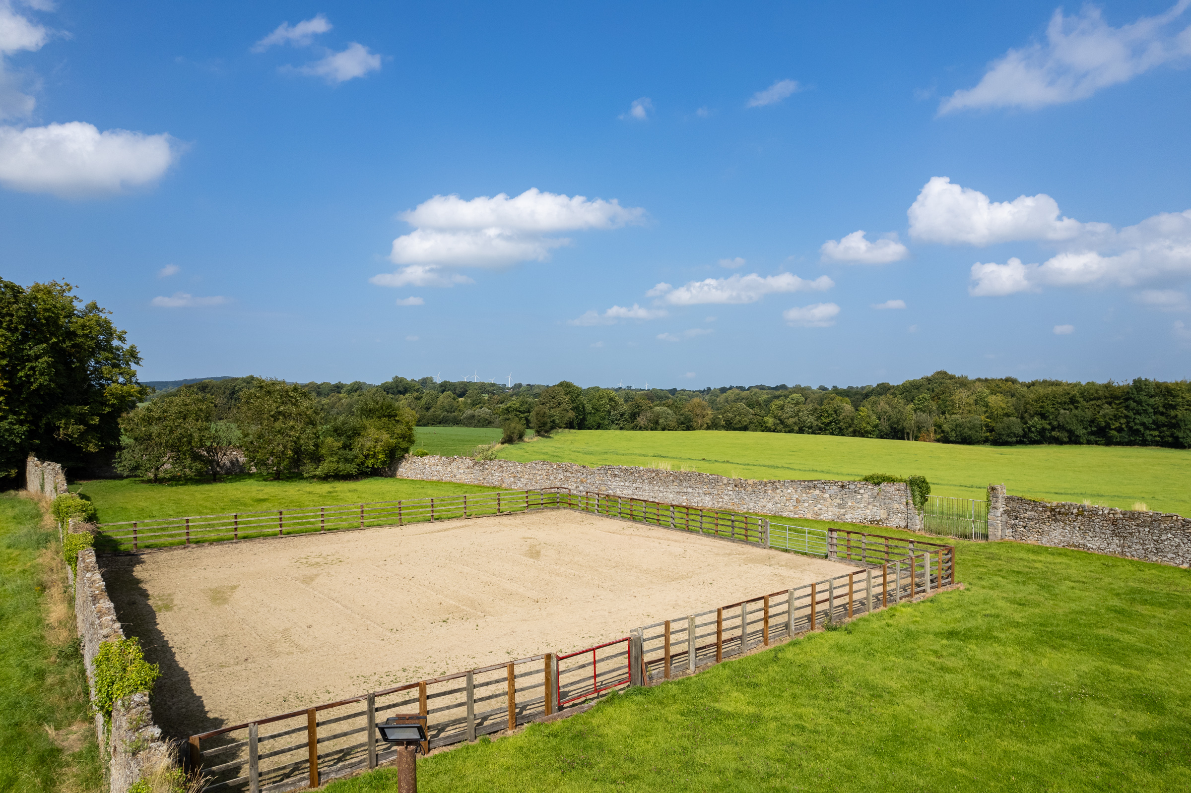 At the rear of the house, an enclosed courtyard is framed by a collection of charming old stone buildings, including 13 stables and a shed for firewood and garden tools. Adjacent to the courtyard lies the historic walled garden, now home to a sand arena for exercising horses.