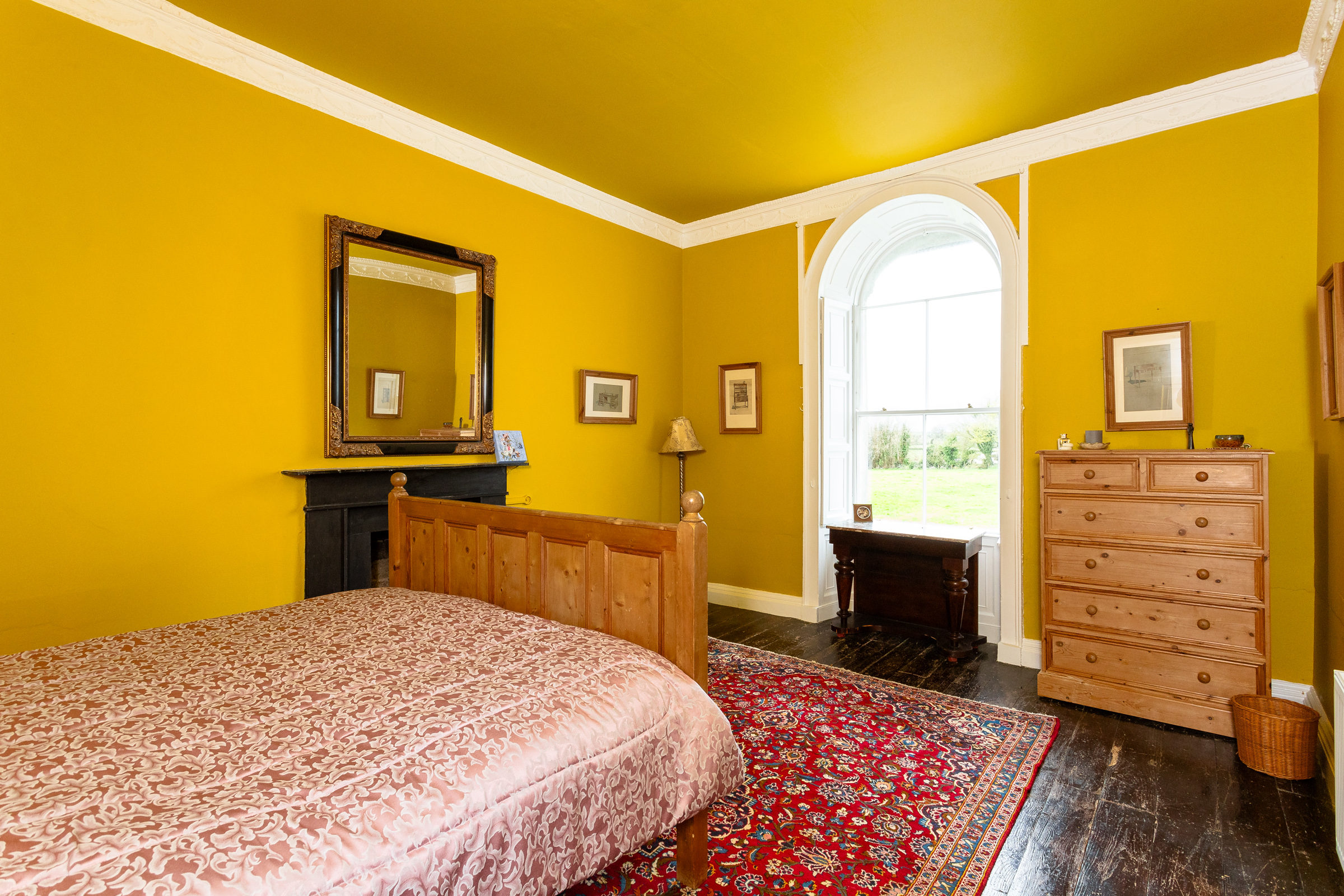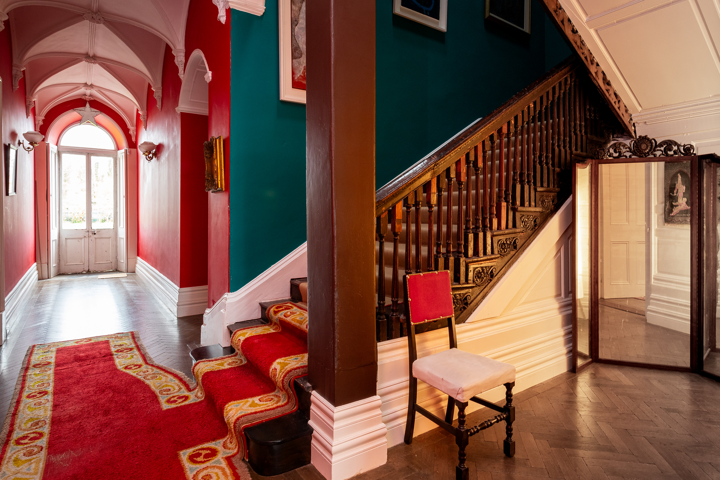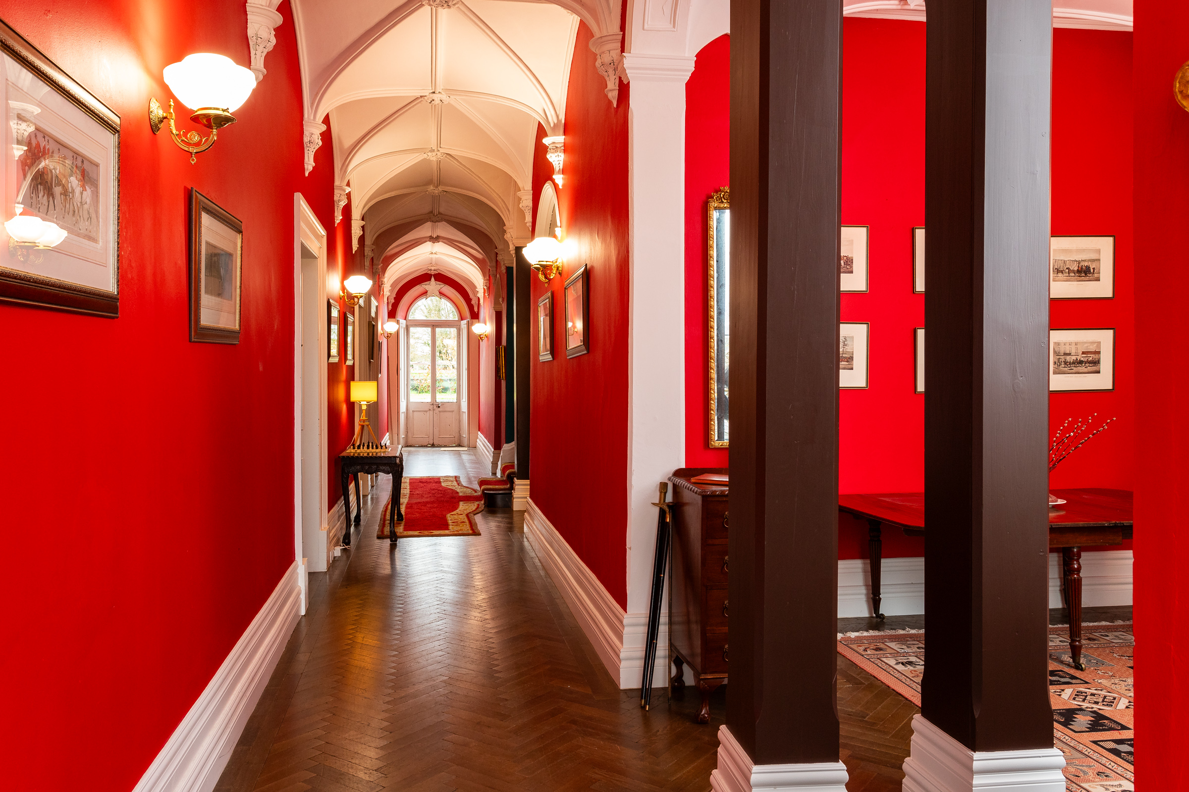 The current owners have skilfully preserved the property's historic character while introducing a bold and vibrant colour palette that adds a modern, distinctive touch throughout the house. Upon entering Cangort House, you are greeted by a long entrance hall featuring a decorative vaulted ceiling and stunning parquet flooring, which extends into many of the rooms throughout the house. To the right is a small lobby area, and as you continue, the first reception room you encounter is the dining room. This elegant space boasts lofty ceilings adorned with intricate cornicing, solid wood flooring, a striking marble fireplace, and large mullioned windows, a hallmark of the Jacobean era.
