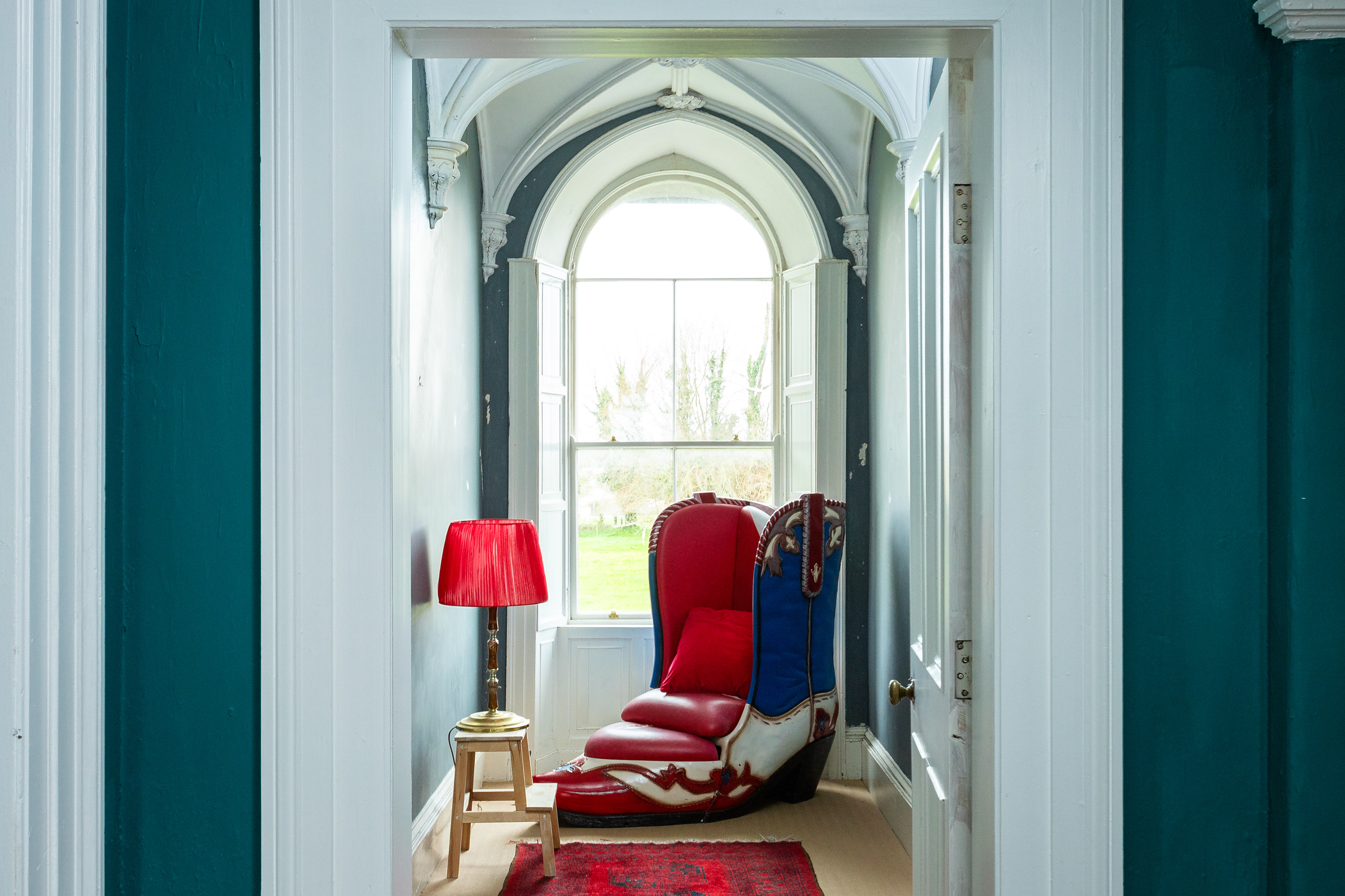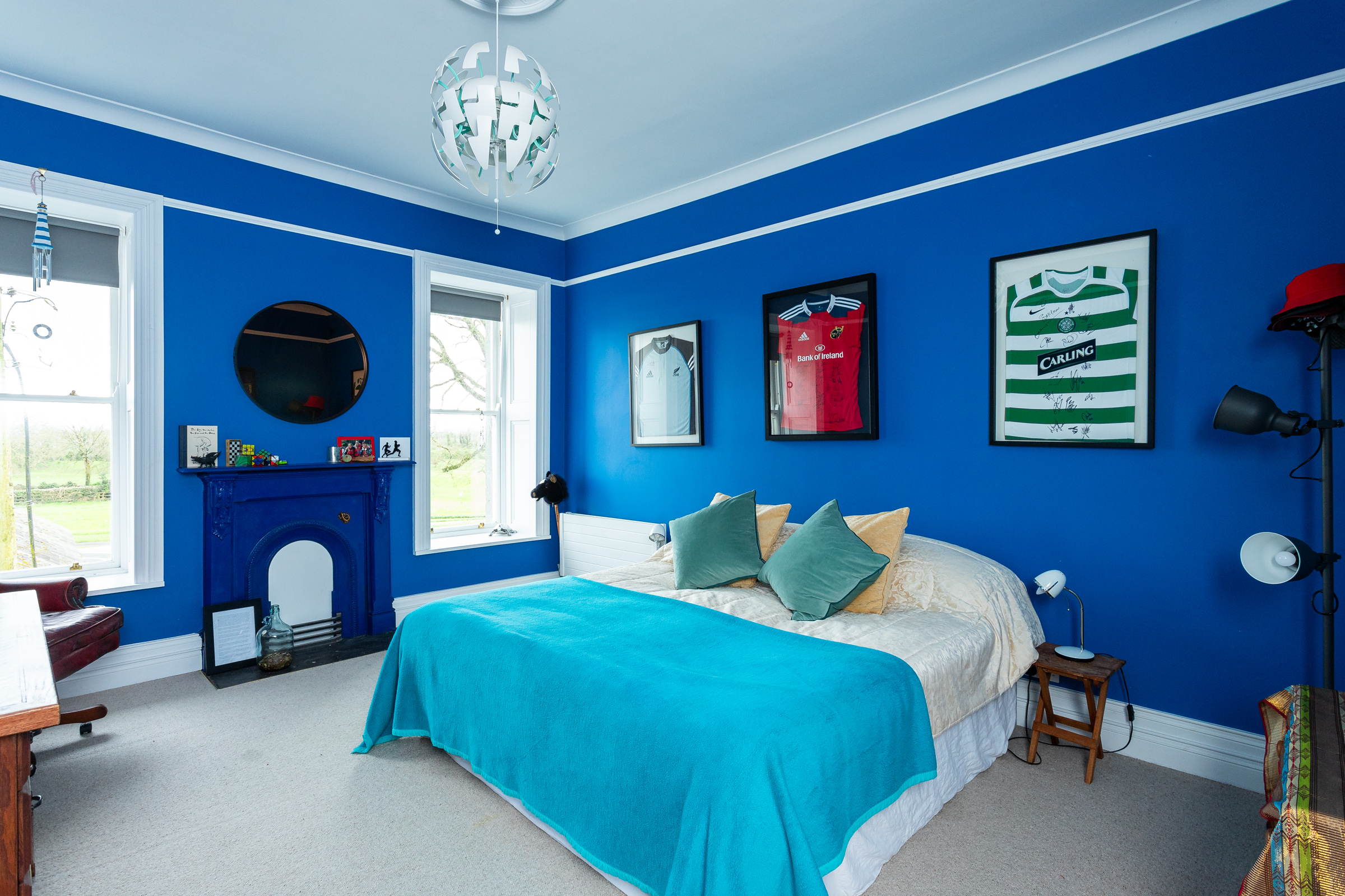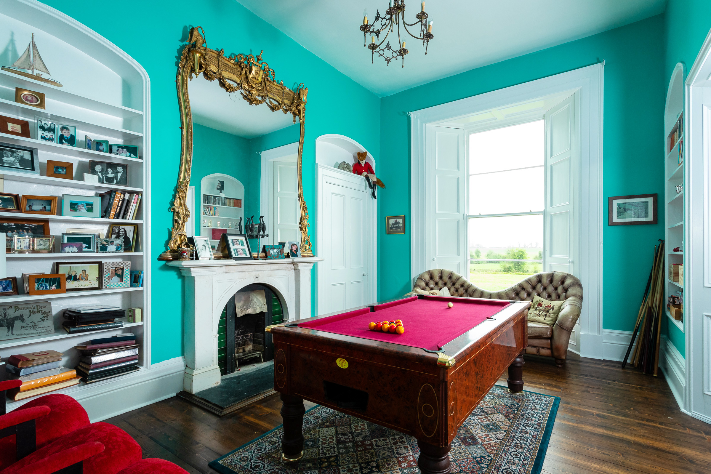 The current owners have skilfully preserved the property's historic character while introducing a bold and vibrant colour palette that adds a modern, distinctive touch throughout the house. Upon entering Cangort House, you are greeted by a long entrance hall featuring a decorative vaulted ceiling and stunning parquet flooring, which extends into many of the rooms throughout the house. To the right is a small lobby area, and as you continue, the first reception room you encounter is the dining room. This elegant space boasts lofty ceilings adorned with intricate cornicing, solid wood flooring, a striking marble fireplace, and large mullioned windows, a hallmark of the Jacobean era.