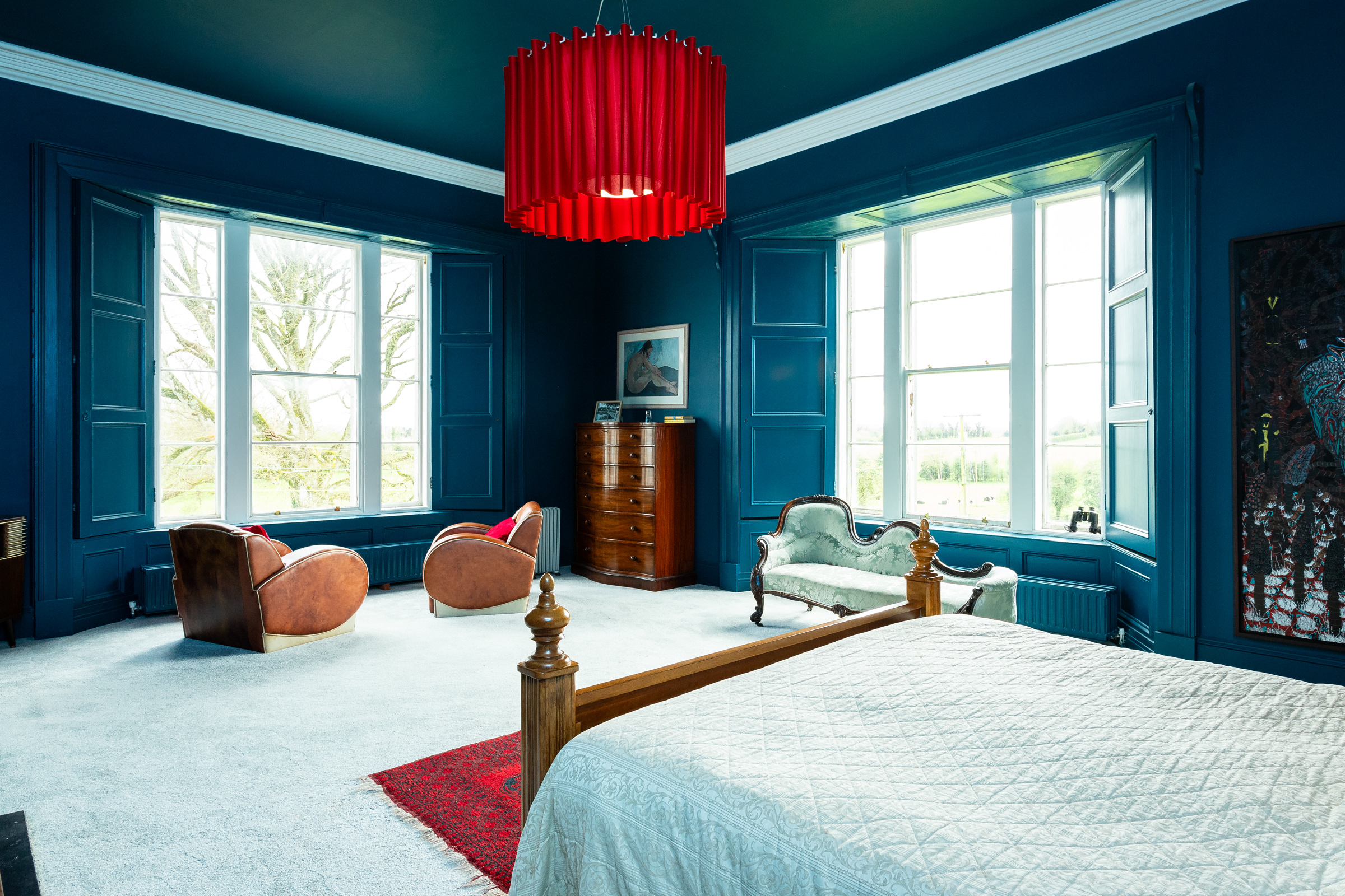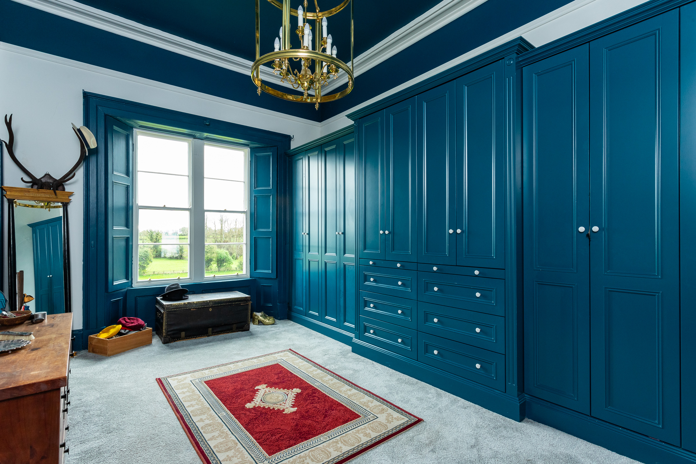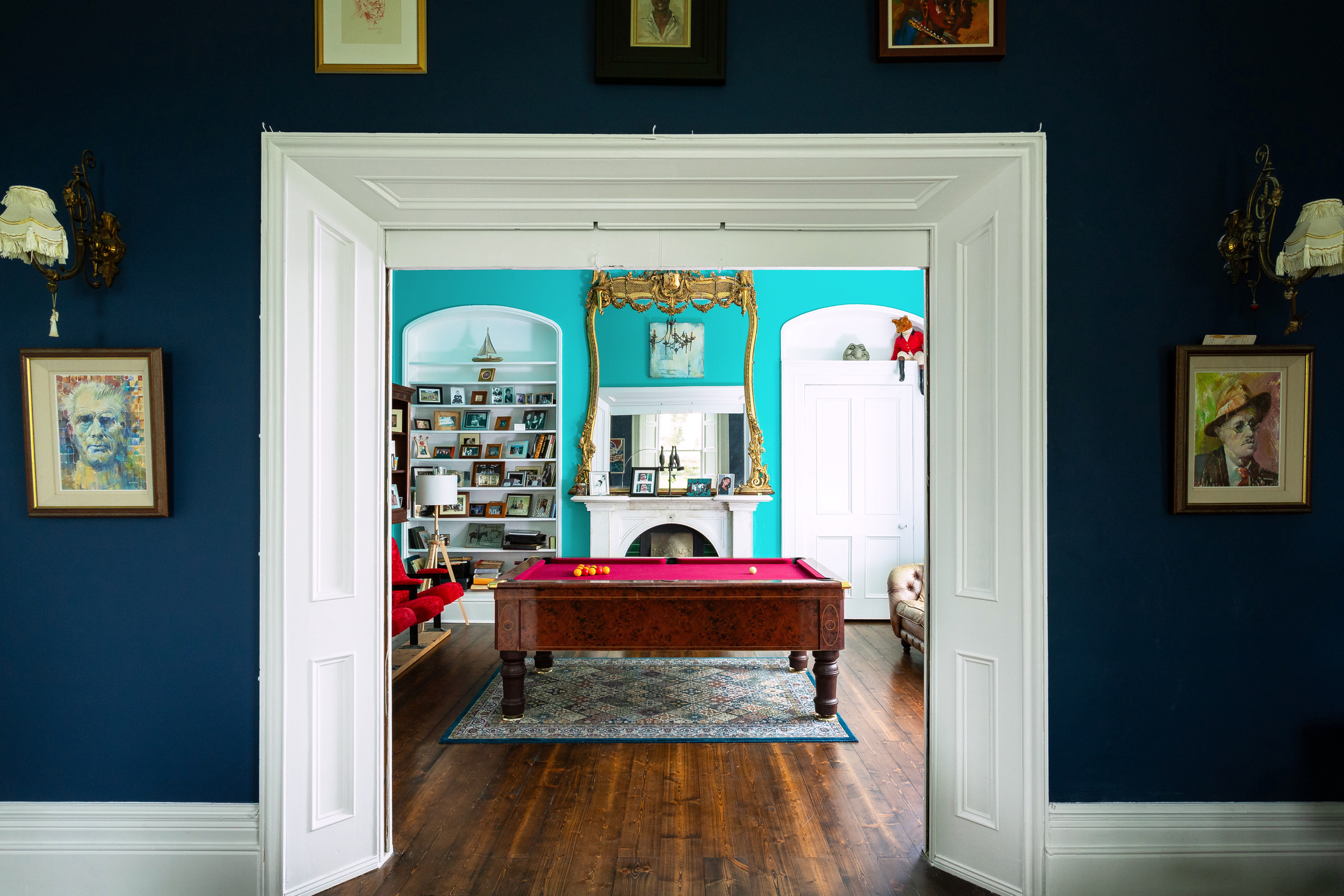 Next door, the library offers a cosy atmosphere with built-in shelving. Sliding double doors lead from this room into the beautifully light-filled drawing room, where the rich navy walls create a warm and inviting ambiance. A wood-burning stove is complemented by a stunning Adams fireplace above, making it the ideal space for entertaining.