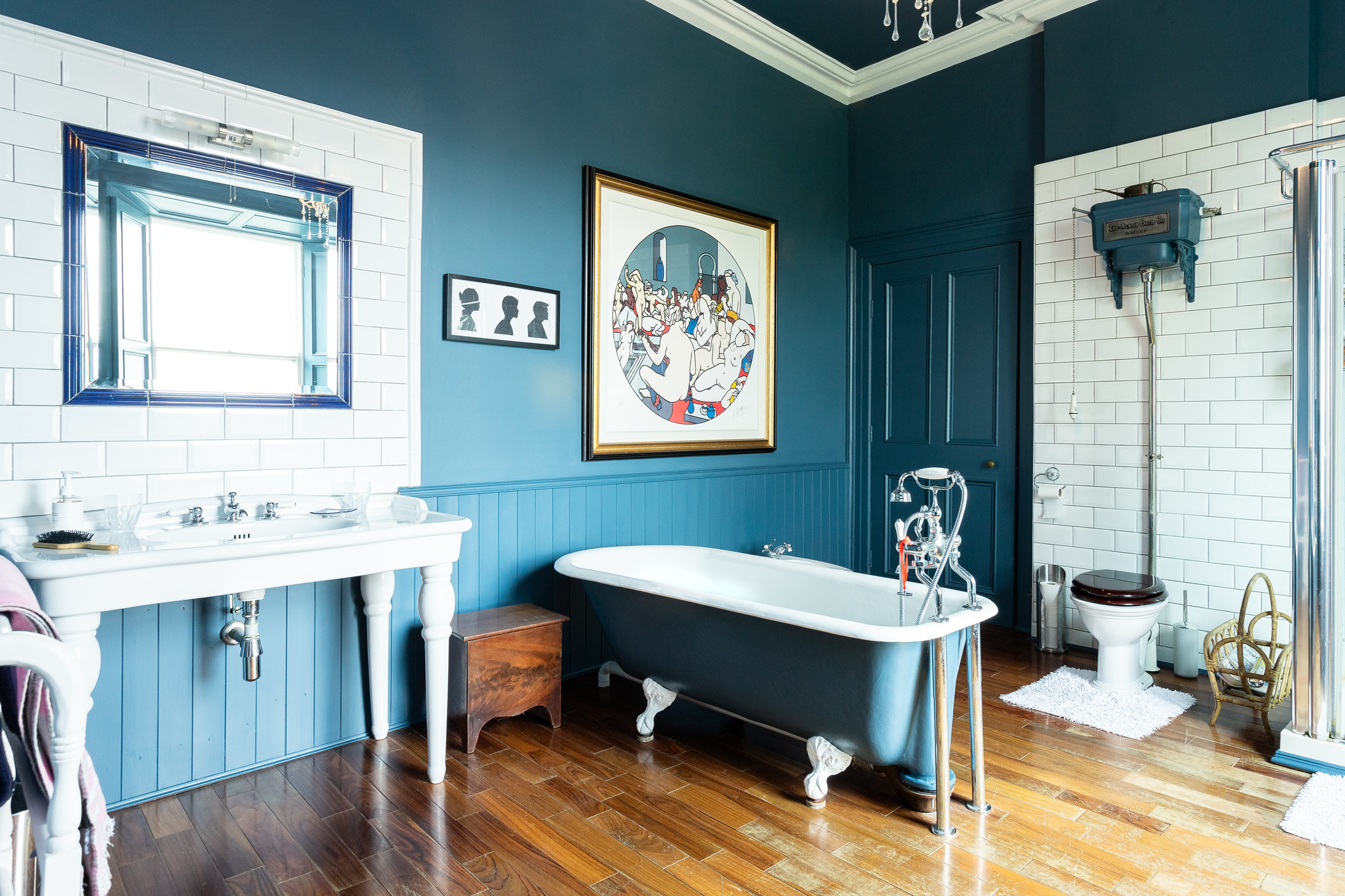 The master suite exudes luxury, with lofty ceilings, an open fire, and large windows adorned with shutters that overlook the splendid gardens. It is further enhanced by a dressing room with built-in wardrobes. The main bathroom is a relaxing retreat, featuring panelled walls, solid wood flooring, a generous shower, a vintage freestanding roll top bathtub, and an Edwardian rectangular washstand, creating an elegant space.