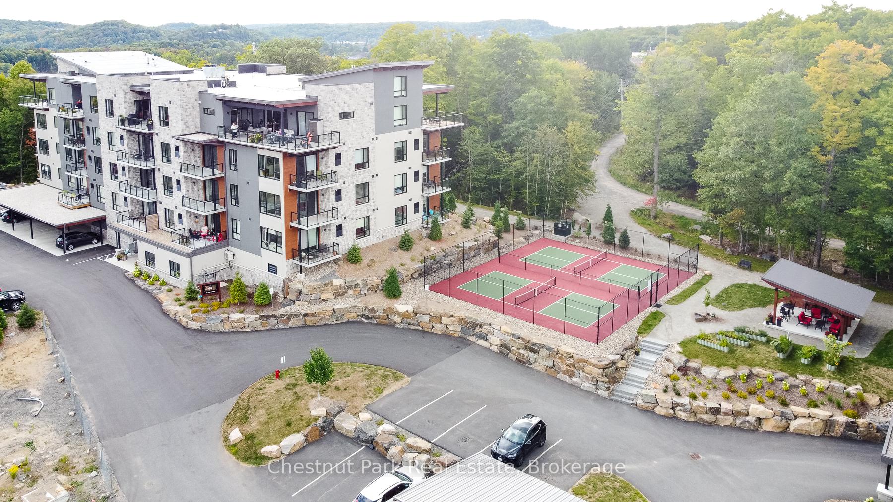 PUBLIC OPEN HOUSE - SATURDAY, FEBRUARY 14TH FROM 1:00PM TO 4:00PM - Welcome to Campus Trails by Greystone - THE EMILY - a stunning new addition to one of Huntsville's most sought-after condo communities. This brand-new, never-lived-in 1-BEDROOM PLUS DEN builder's suite offers 886 sq. ft. of thoughtfully designed living space, combining modern finishes with the natural beauty that surrounds the property. Located on the fourth floor, the unit enjoys beautiful south-facing forested views, allowing warm afternoon sun to pour in and creating a calm, inviting atmosphere throughout the day - and capturing all the way through to north-west so you will also enjoy sunset exposure all year long! Step inside to an upgraded kitchen featuring quartz countertops, stainless steel appliances, soft-close cabinetry, and clean contemporary styling. The bright, spacious open-concept living and dining area flows naturally toward the private balcony, perfect for relaxing, reading, or simply enjoying the treed backdrop. The primary bedroom offers a walk-in closet, while the den provides a versatile flex space, ideal for a home office, guest room, or hobby area. Designed as an accessible suite, the layout emphasizes comfort, ease, and functionality. This unit also includes in-suite laundry, an indoor heated parking space, and a private storage locker, adding exceptional convenience to everyday life. Residents of Campus Trails appreciate the peaceful setting, amenities including walking trails right at the doorstep, beautifully maintained common areas, and the sense of community the development is known for. Located moments from the hospital, shopping, restaurants, and Huntsville's vibrant downtown, this condo offers the perfect blend of nature, modern living, and low-maintenance comfort. Experience the best of Muskoka in a building where everything is new (comes with full Tarion Warranty), efficient, and ready for you to simply move in and enjoy the carefree life you've always wanted. Refrigerator, Stove, Microwave, Dishwasher, Washer, Dryer