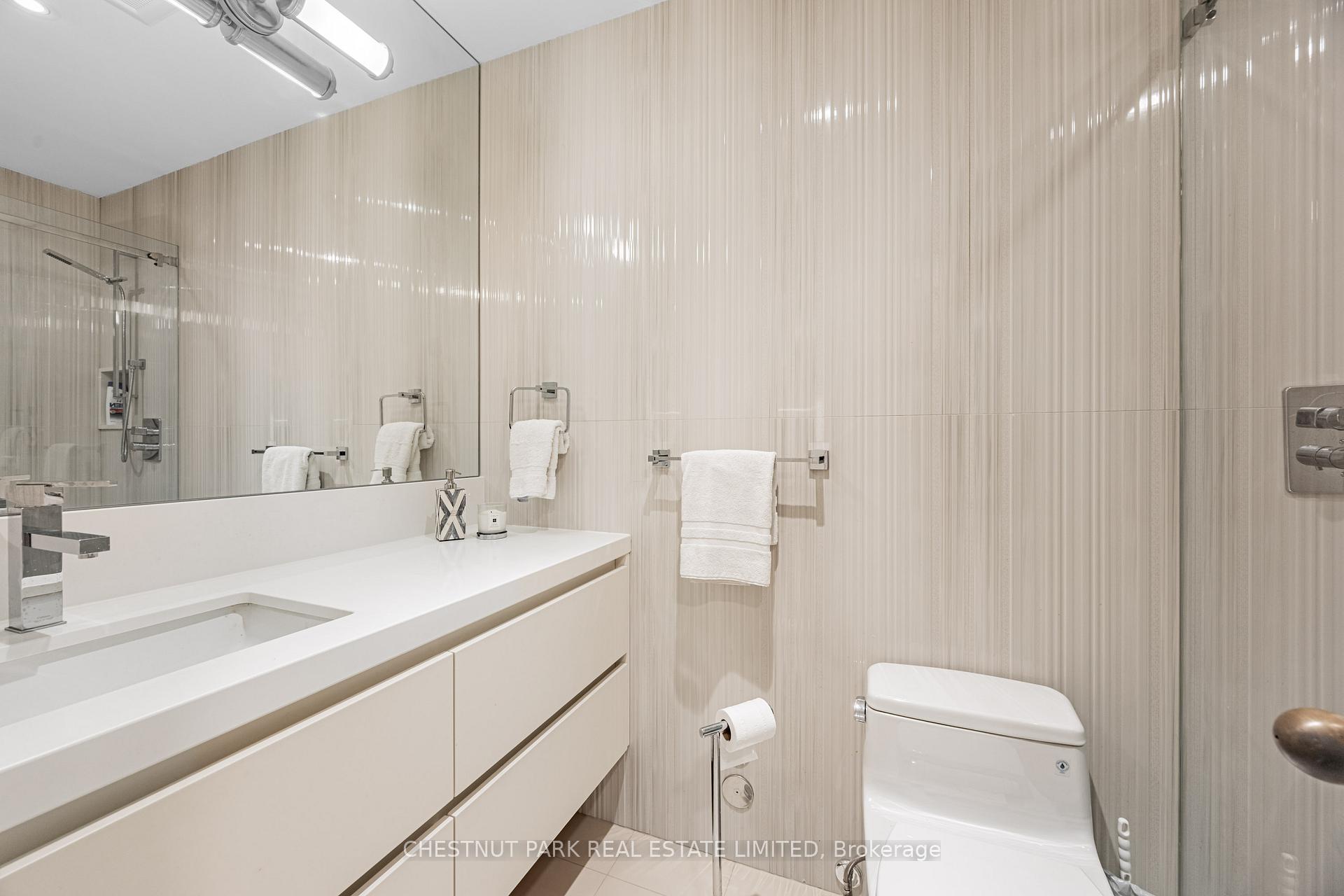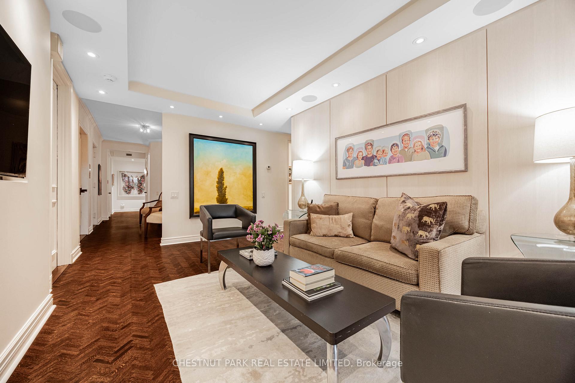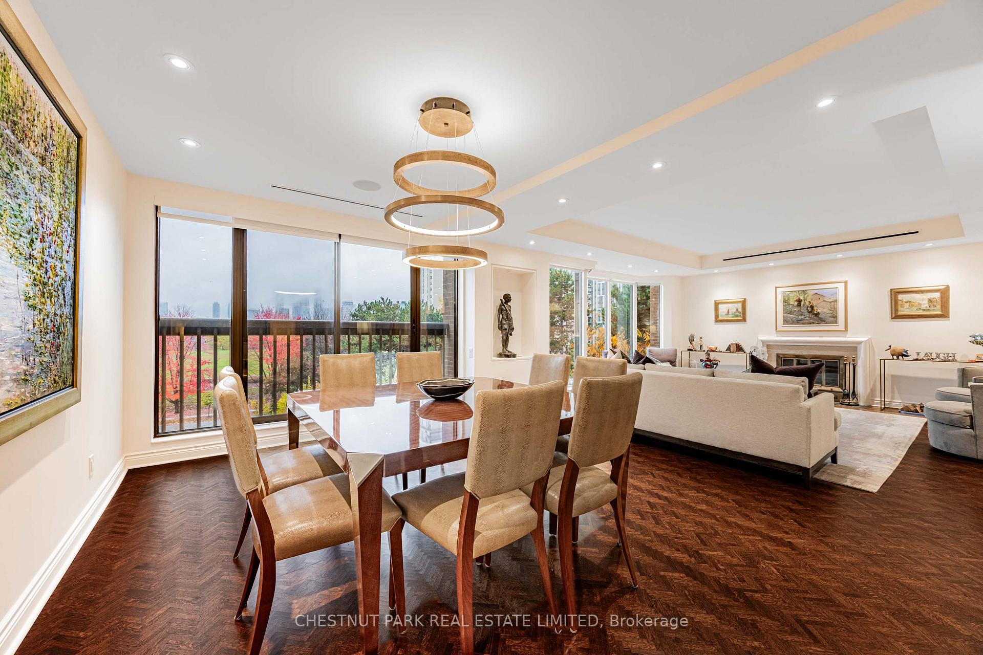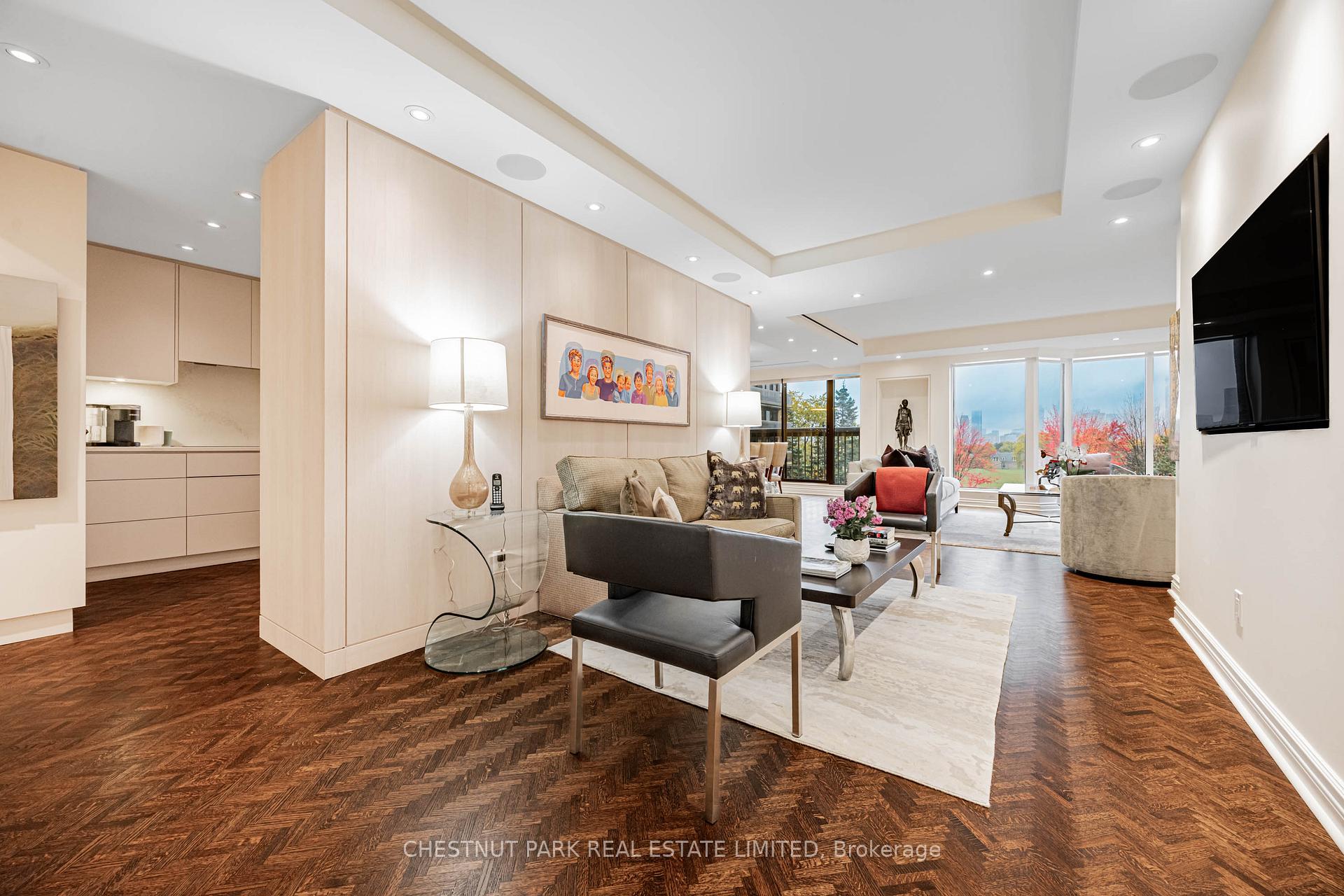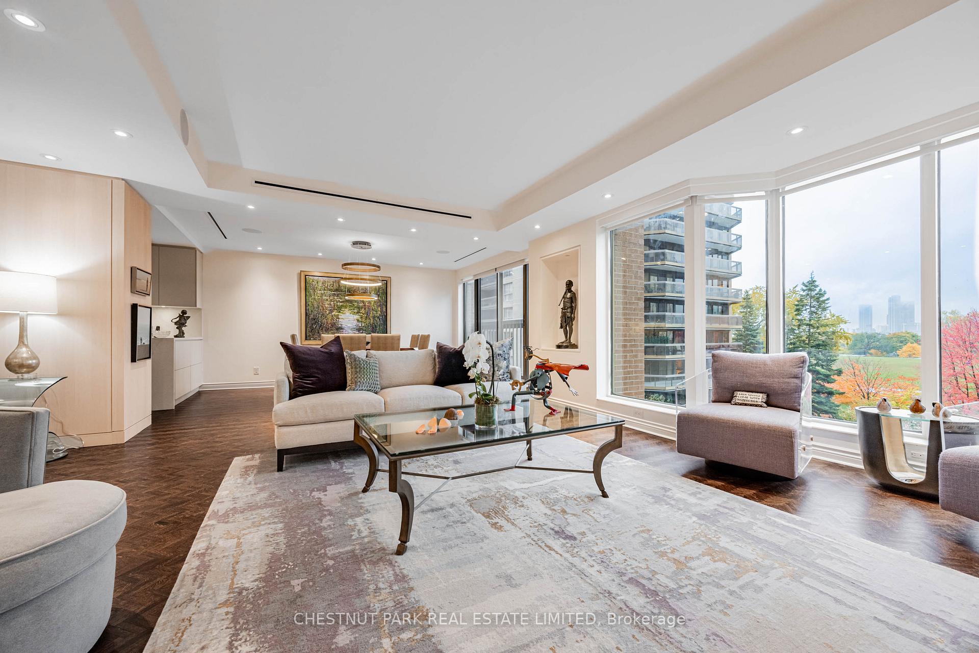 Commanding spectacular, uninterrupted skyline & south facing park views, this approximately 2,100 sq. ft. dazzling renovation exemplifies refined city living at Yonge & St Clair. Set within one of the area's most coveted, full-service buildings, it offers exceptional privacy, white-glove amenities, & direct elevator access into the suite-an elegant rarity that sets the tone for the lifestyle within. A dramatic, open-concept layout in the entertaining area is well separate from the private quarters, with wall-to-wall glass infusing the principal rooms with natural light & breathtaking views of David Balfour Pk. The expansive LR & DR flow seamlessly for glamorous entertaining or intimate evenings by the wood-burning fireplace. There is ample space for a baby grand piano, & sliding doors to a Juliette balc inviting the outdoors in. Every finish speaks of quiet sophistication: rich hardwood underfoot, bespoke millwork, custom built-ins including ceiling speakers for music & subtle architectural detailing throughout. The open living, dining & family room areas transition effortlessly into a sleek, contemporary chef's kit with stone surfaces & integrated cabinetry, providing both visual harmony & high functionality. The DR easily accommodates 10-12 guests, making it ideal for elegant dinner parties. The open concept allows the DR & Fam Rm to be used interchangeably. The private wing is equally impressive. The king-size PR suite enjoys direct access to a secluded balcony & offers expansive wardrobe space, with both a double closet & a generous walk-in. Its 7 pc spa-like bath features a deep soaking tub, separate shower, dual sink vanity, & a priv sauna-an indulgent retreat after a day in the city. The 2nd BR, fitted with extensive built-ins & its own 3 pc ensuite, is ideal for guests or home ofc. A discreet powder rm, rare ensuite laundry rm, & remarkable in-suite storage further enhance comfort & convenience.