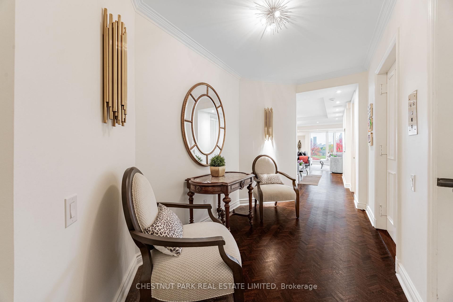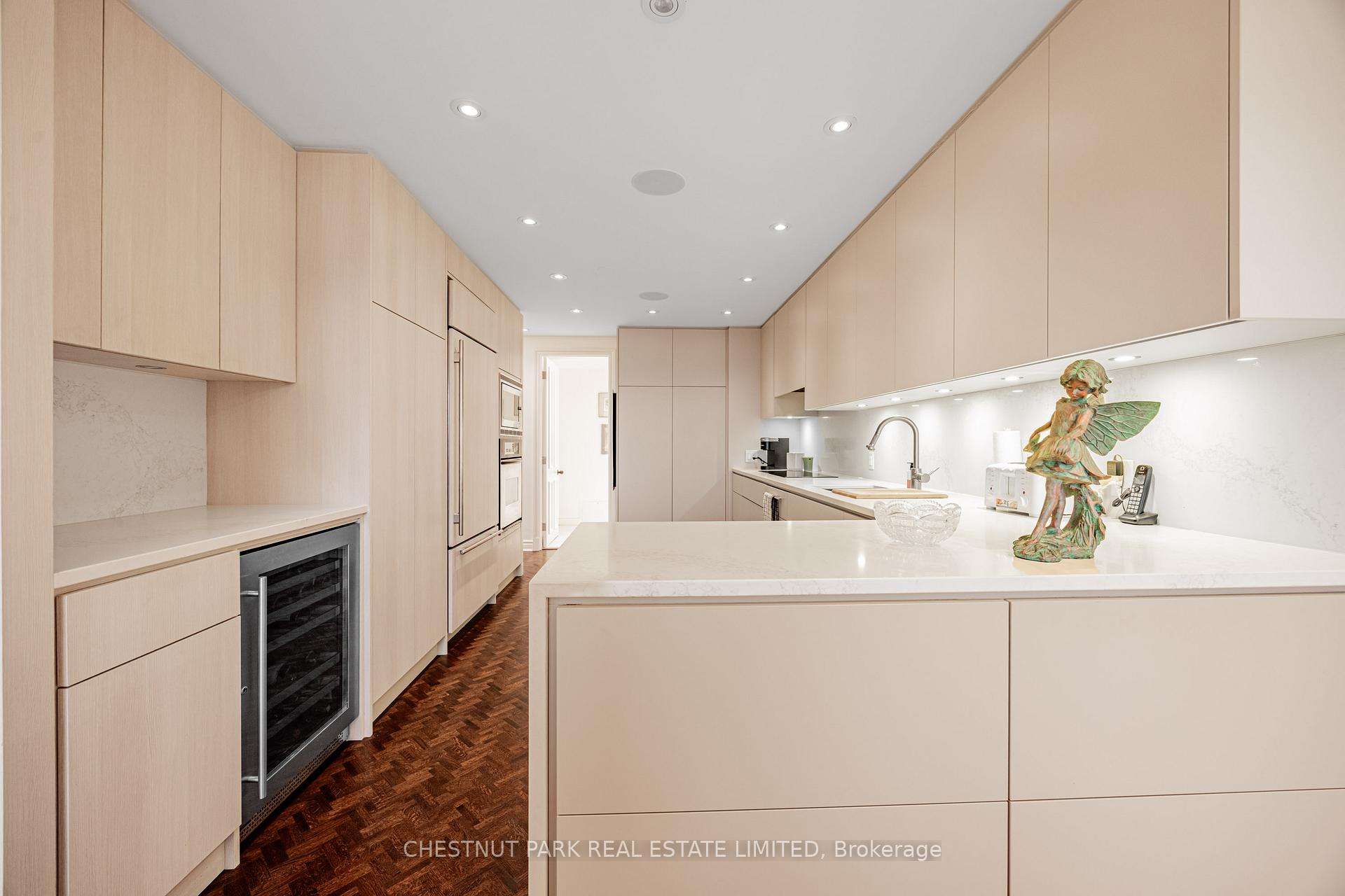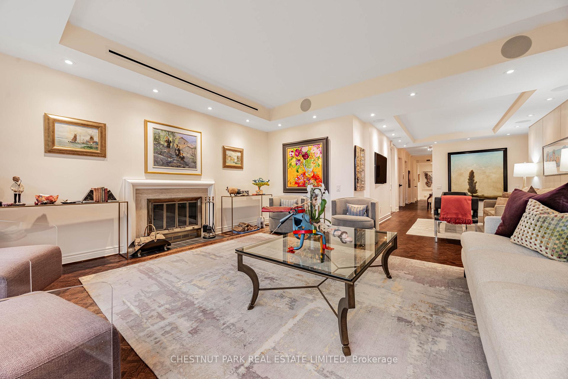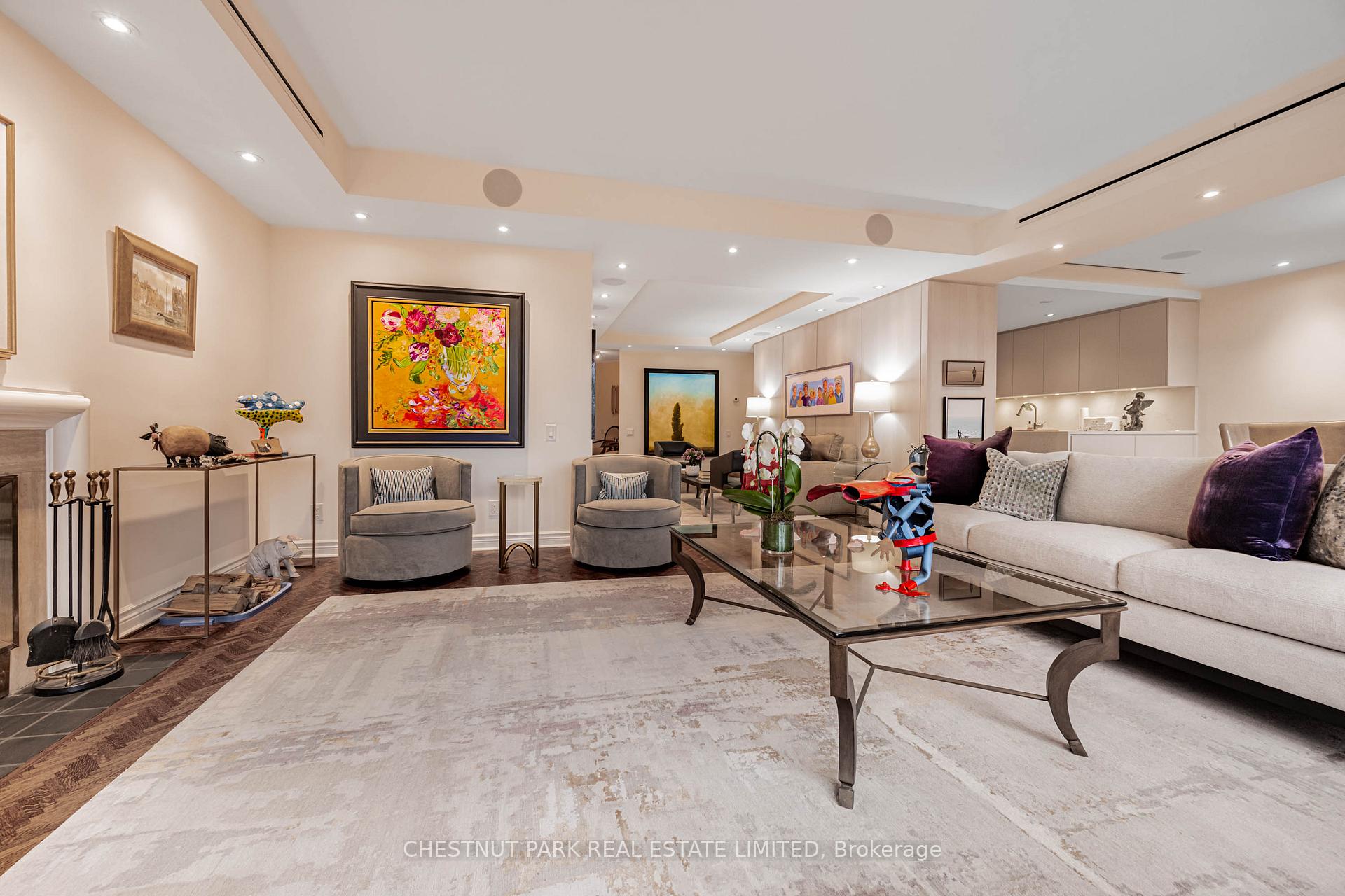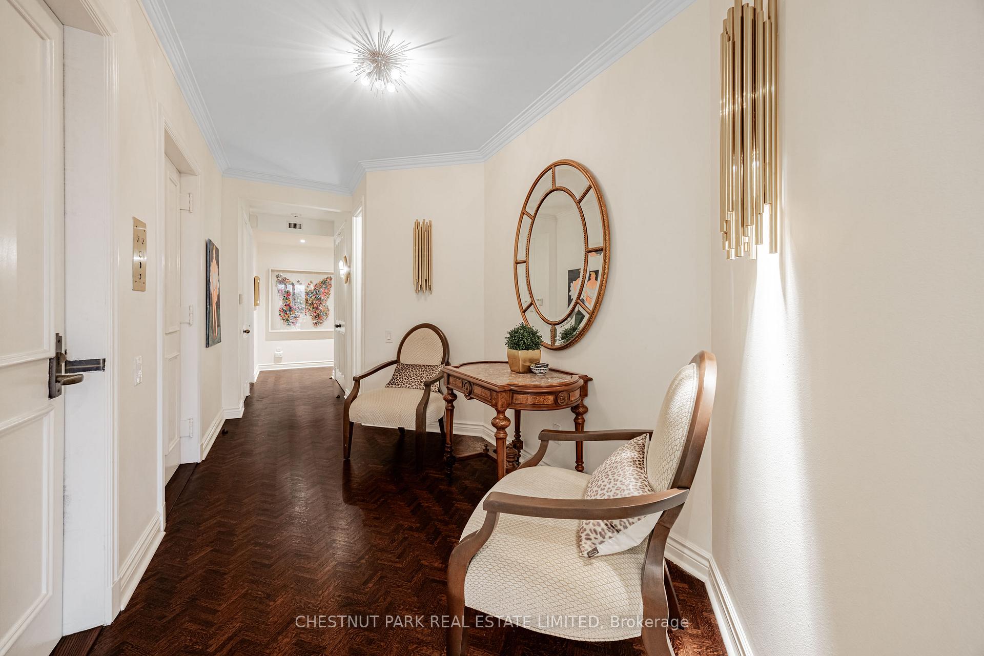 Commanding spectacular, uninterrupted skyline & south facing park views, this approximately 2,100 sq. ft. dazzling renovation exemplifies refined city living at Yonge & St Clair. Set within one of the area's most coveted, full-service buildings, it offers exceptional privacy, white-glove amenities, & direct elevator access into the suite-an elegant rarity that sets the tone for the lifestyle within. A dramatic, open-concept layout in the entertaining area is well separate from the private quarters, with wall-to-wall glass infusing the principal rooms with natural light & breathtaking views of David Balfour Pk. The expansive LR & DR flow seamlessly for glamorous entertaining or intimate evenings by the wood-burning fireplace. There is ample space for a baby grand piano, & sliding doors to a Juliette balc inviting the outdoors in. Every finish speaks of quiet sophistication: rich hardwood underfoot, bespoke millwork, custom built-ins including ceiling speakers for music & subtle architectural detailing throughout. The open living, dining & family room areas transition effortlessly into a sleek, contemporary chef's kit with stone surfaces & integrated cabinetry, providing both visual harmony & high functionality. The DR easily accommodates 10-12 guests, making it ideal for elegant dinner parties. The open concept allows the DR & Fam Rm to be used interchangeably. The private wing is equally impressive. The king-size PR suite enjoys direct access to a secluded balcony & offers expansive wardrobe space, with both a double closet & a generous walk-in. Its 7 pc spa-like bath features a deep soaking tub, separate shower, dual sink vanity, & a priv sauna-an indulgent retreat after a day in the city. The 2nd BR, fitted with extensive built-ins & its own 3 pc ensuite, is ideal for guests or home ofc. A discreet powder rm, rare ensuite laundry rm, & remarkable in-suite storage further enhance comfort & convenience.