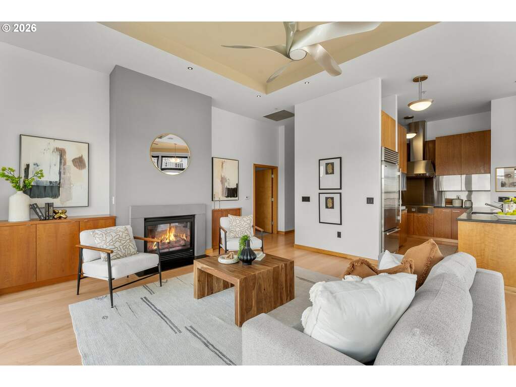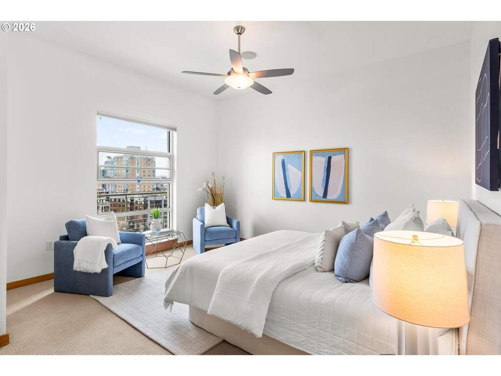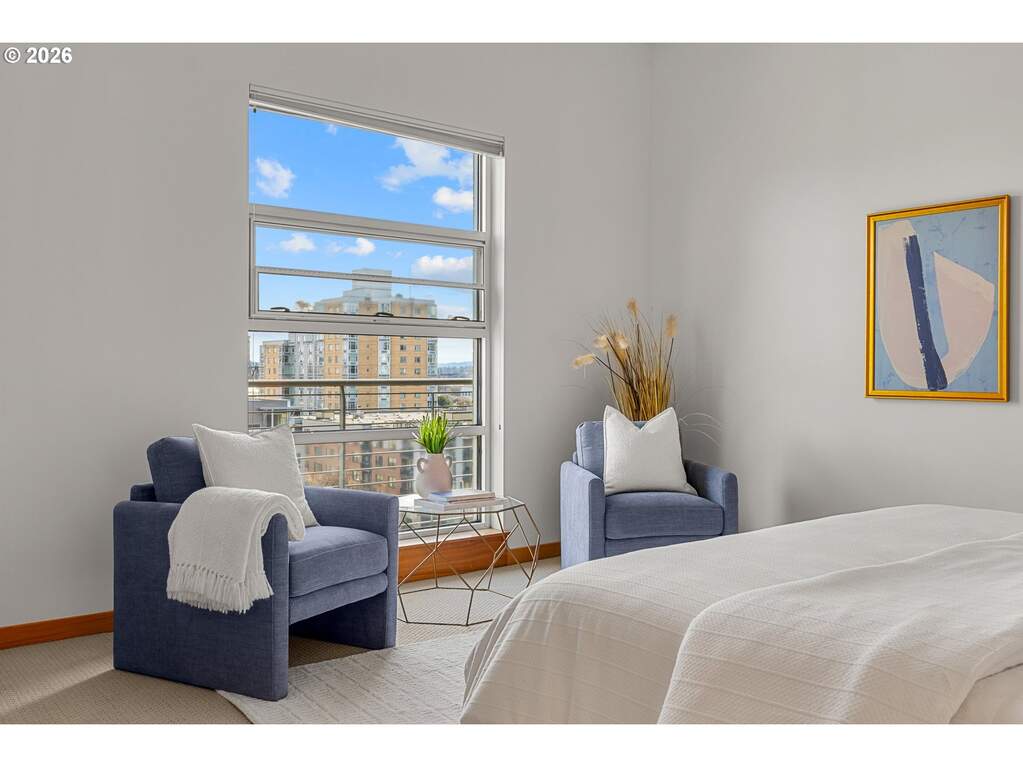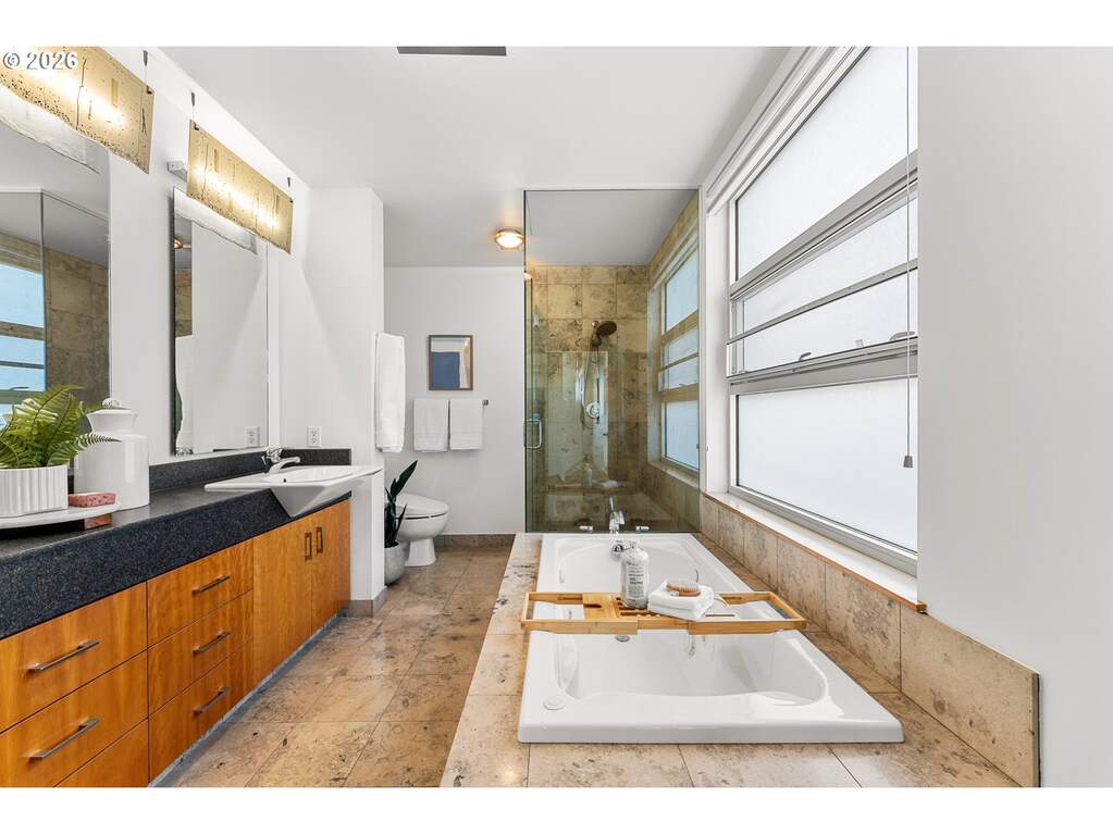 Experience elevated city living in this meticulously maintained corner residence located in the heart of Portland's sought-after Pearl District. Dramatic floor-to-ceiling windows showcase breathtaking 270-degree views overlooking Tanner Springs Park, with stunning vistas of Mt. Hood, iconic city bridges, and the river. An expansive wraparound deck seamlessly extends the living space, offering an ideal setting for entertaining or unwinding while taking in the ever-changing cityscape.The thoughtfully designed floor plan features two spacious ensuite primary bedrooms, each with walk-in closets outfitted with California Closets for exceptional organization and style. A versatile den provides the perfect space for a home office, media room, or guest retreat. Marble finishes in the bathrooms create a refined, spa-like atmosphere, while custom lighting throughout enhances the home's modern elegance. Abundant storage and meticulous upkeep are evident at every turn.Set in the vibrant Pearl District, this residence offers unparalleled access to renowned dining, boutique shopping, art galleries, parks, and the city's best cultural amenities-all just steps from your front door. A rare opportunity to enjoy sophisticated urban living, premier walkability, and truly remarkable views in one exceptional home.
