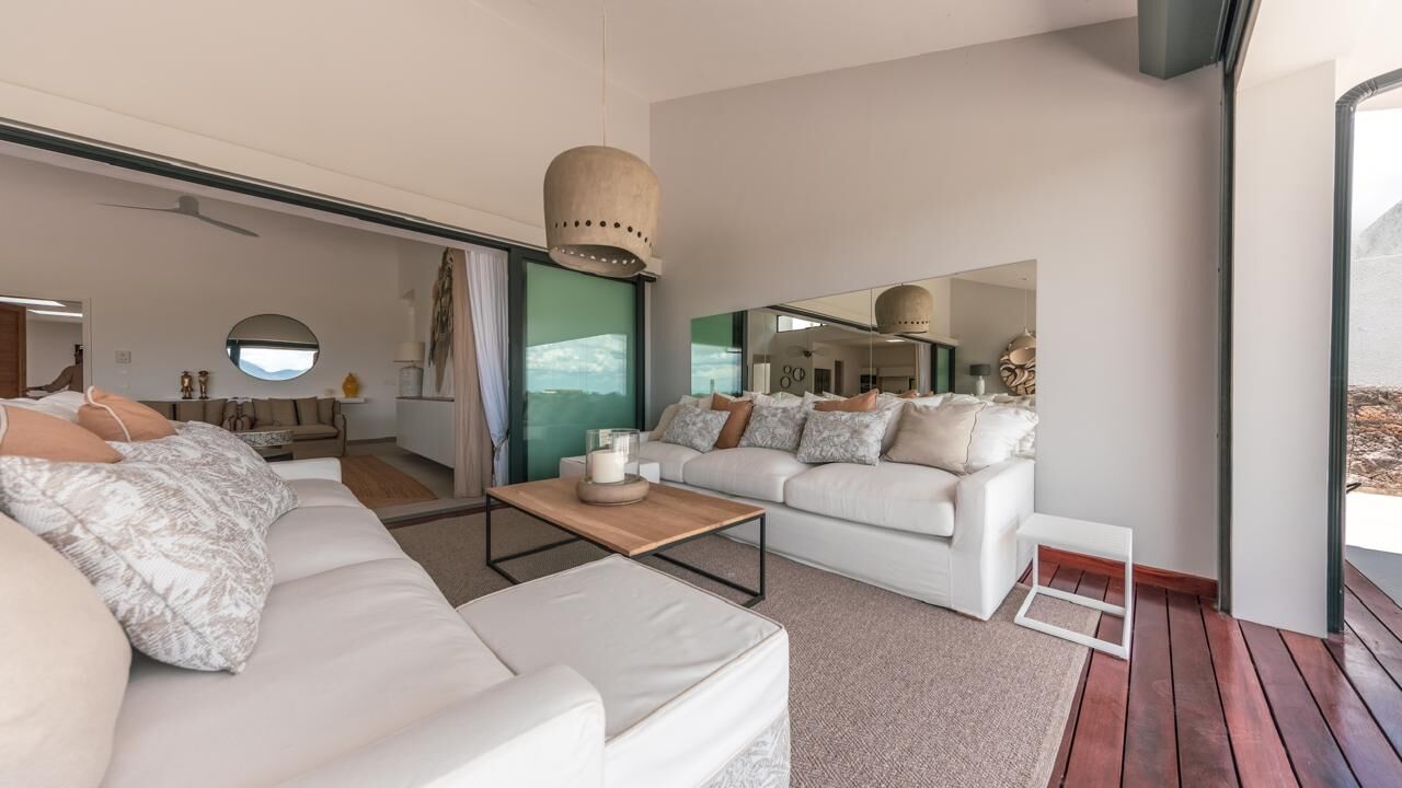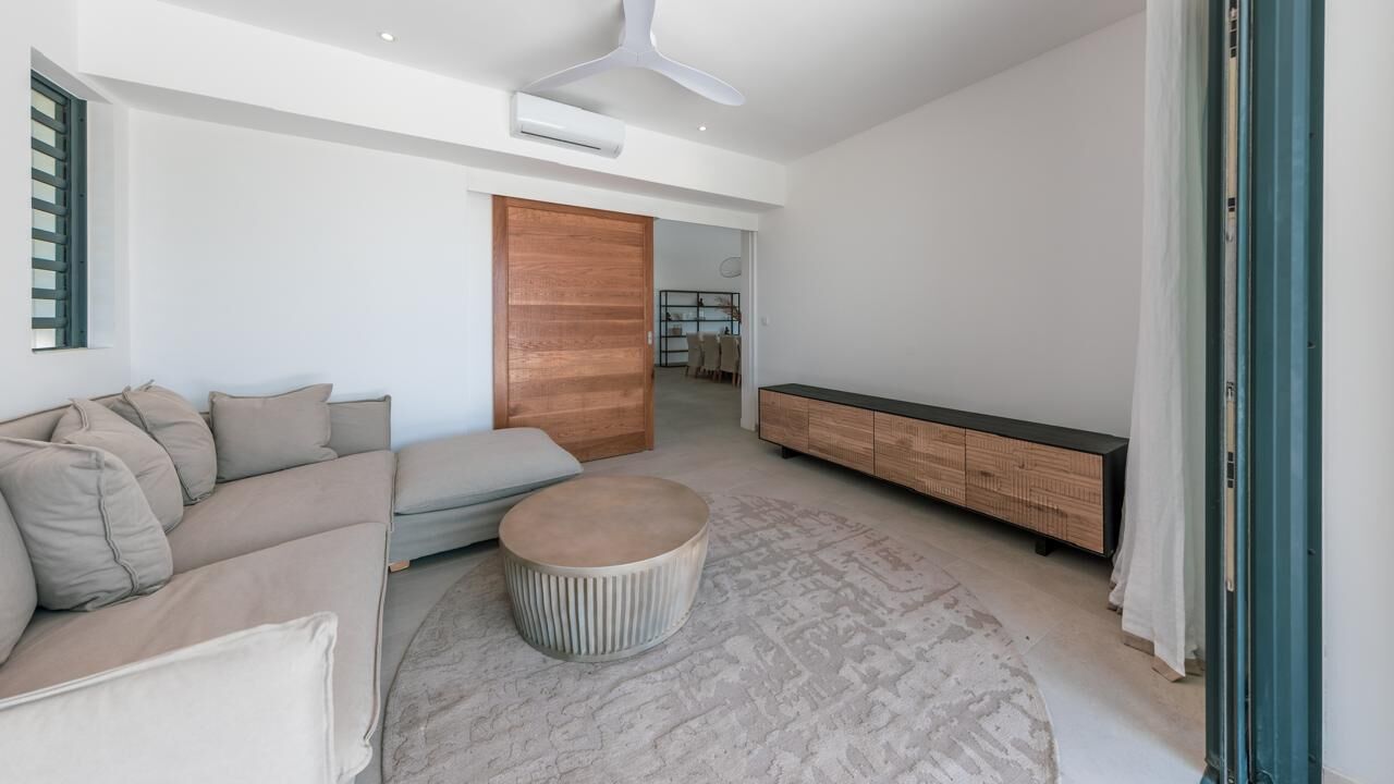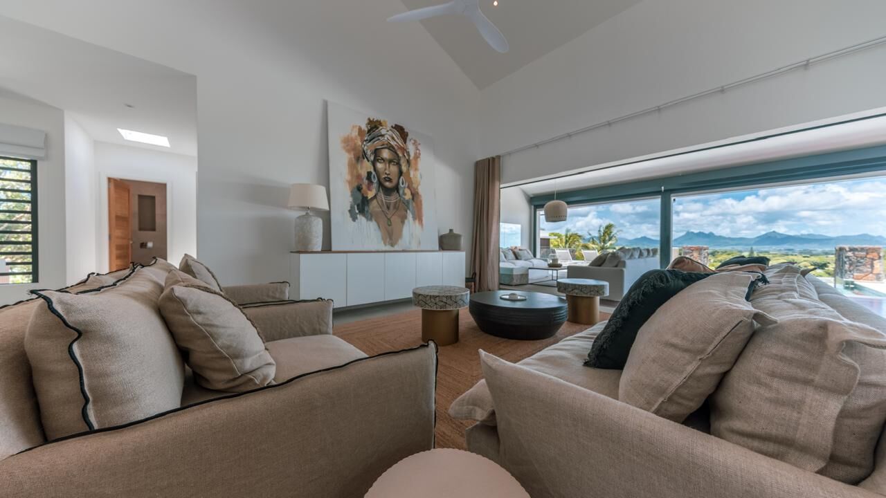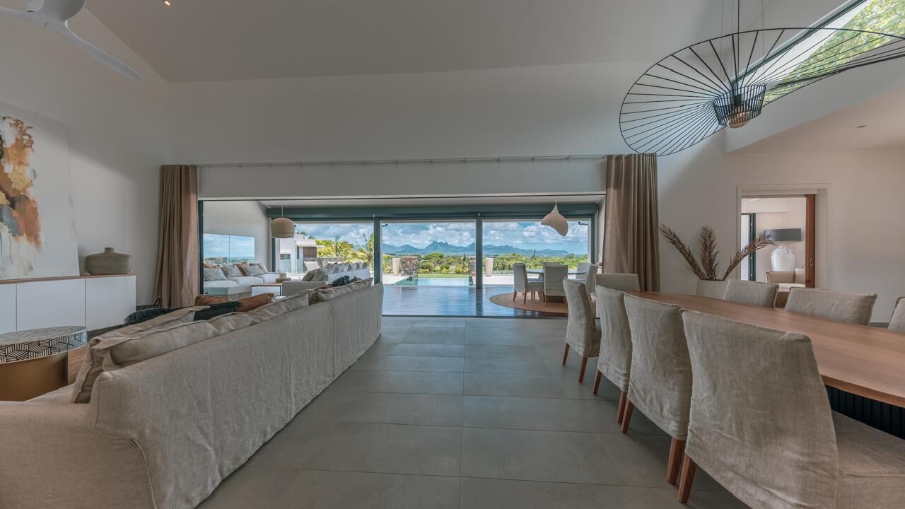 The expansive living areas open seamlessly onto generous terraces where panoramic views stretch across Mauritius' iconic mountain range and the turquoise waters of the Indian Ocean. Large openings allow natural light to flood the interiors, creating bright, airy spaces that feel both calming and connected to the surrounding landscape.