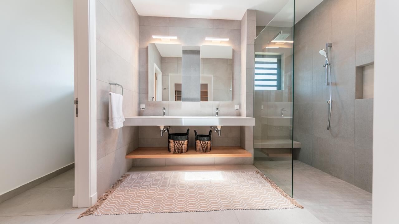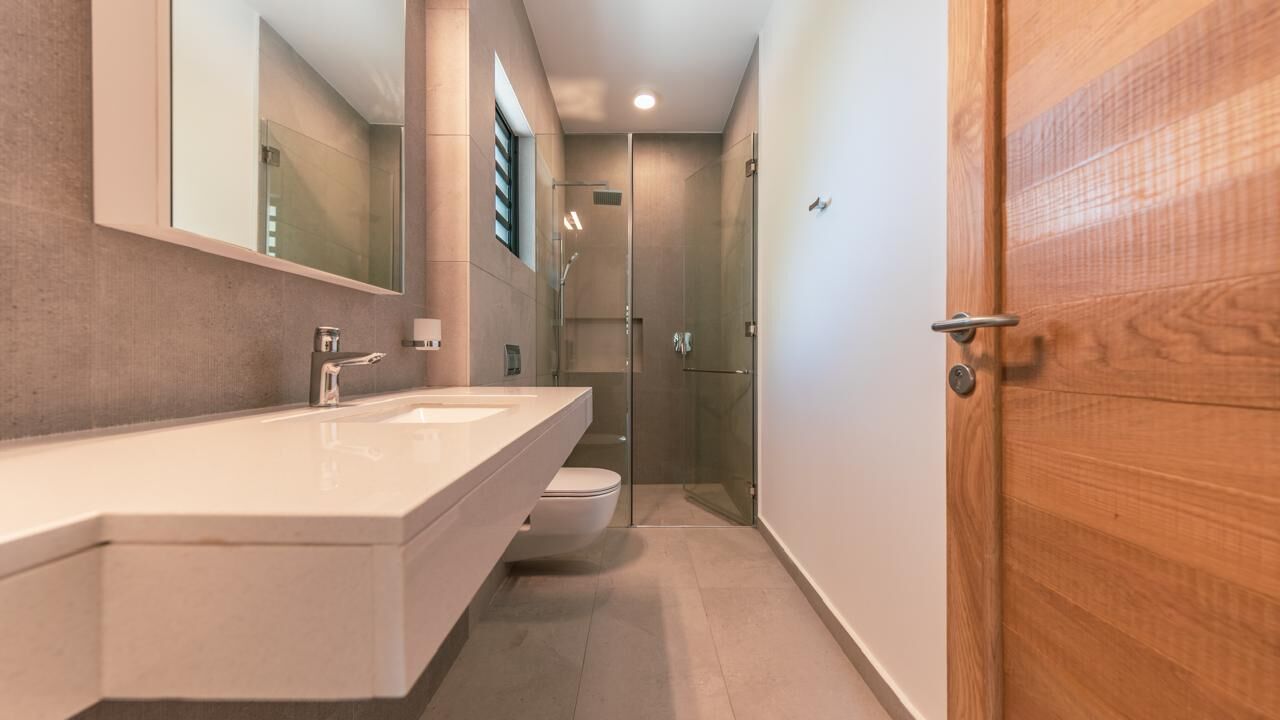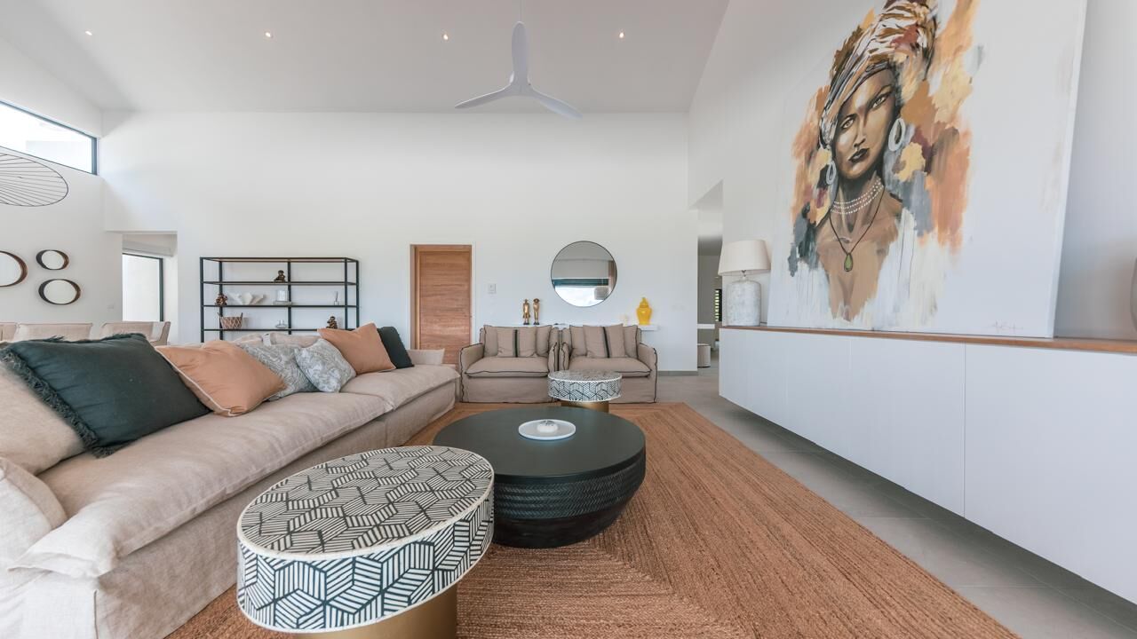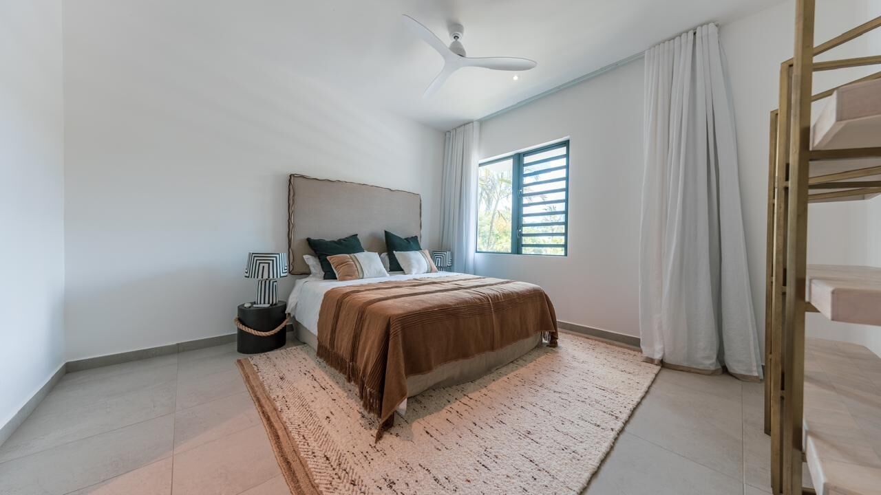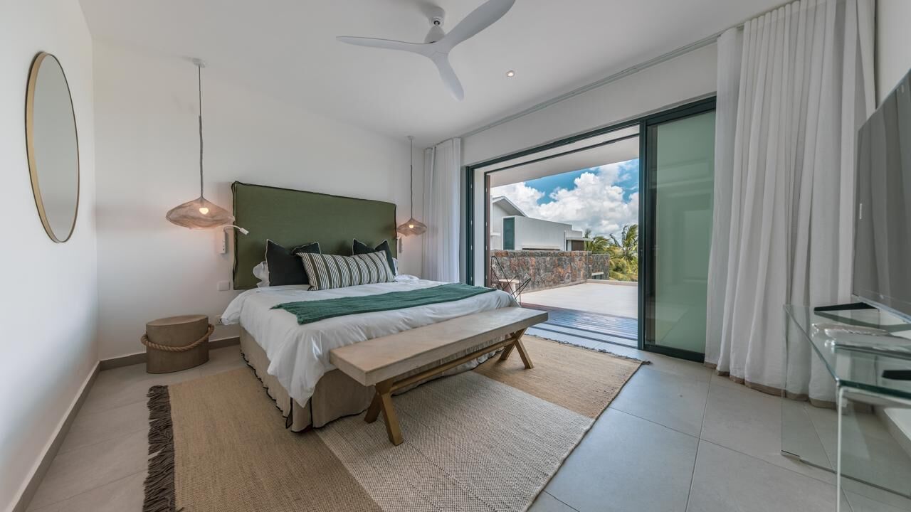 The expansive living areas open seamlessly onto generous terraces where panoramic views stretch across Mauritius' iconic mountain range and the turquoise waters of the Indian Ocean. Large openings allow natural light to flood the interiors, creating bright, airy spaces that feel both calming and connected to the surrounding landscape.