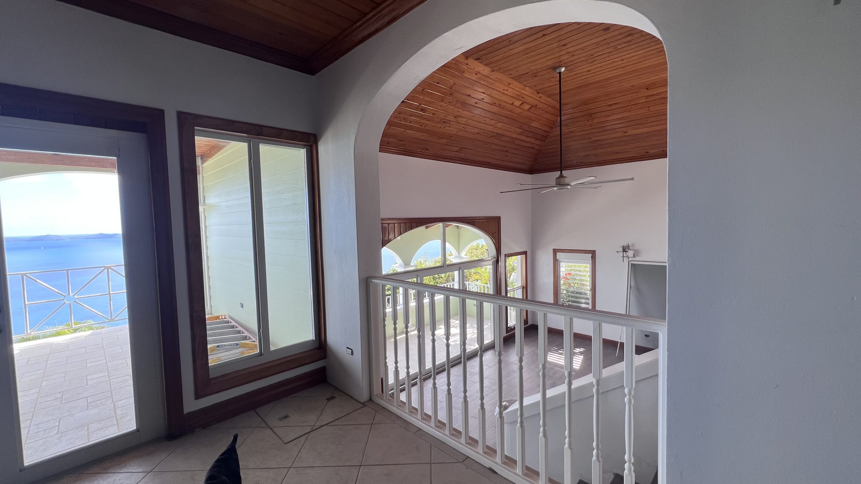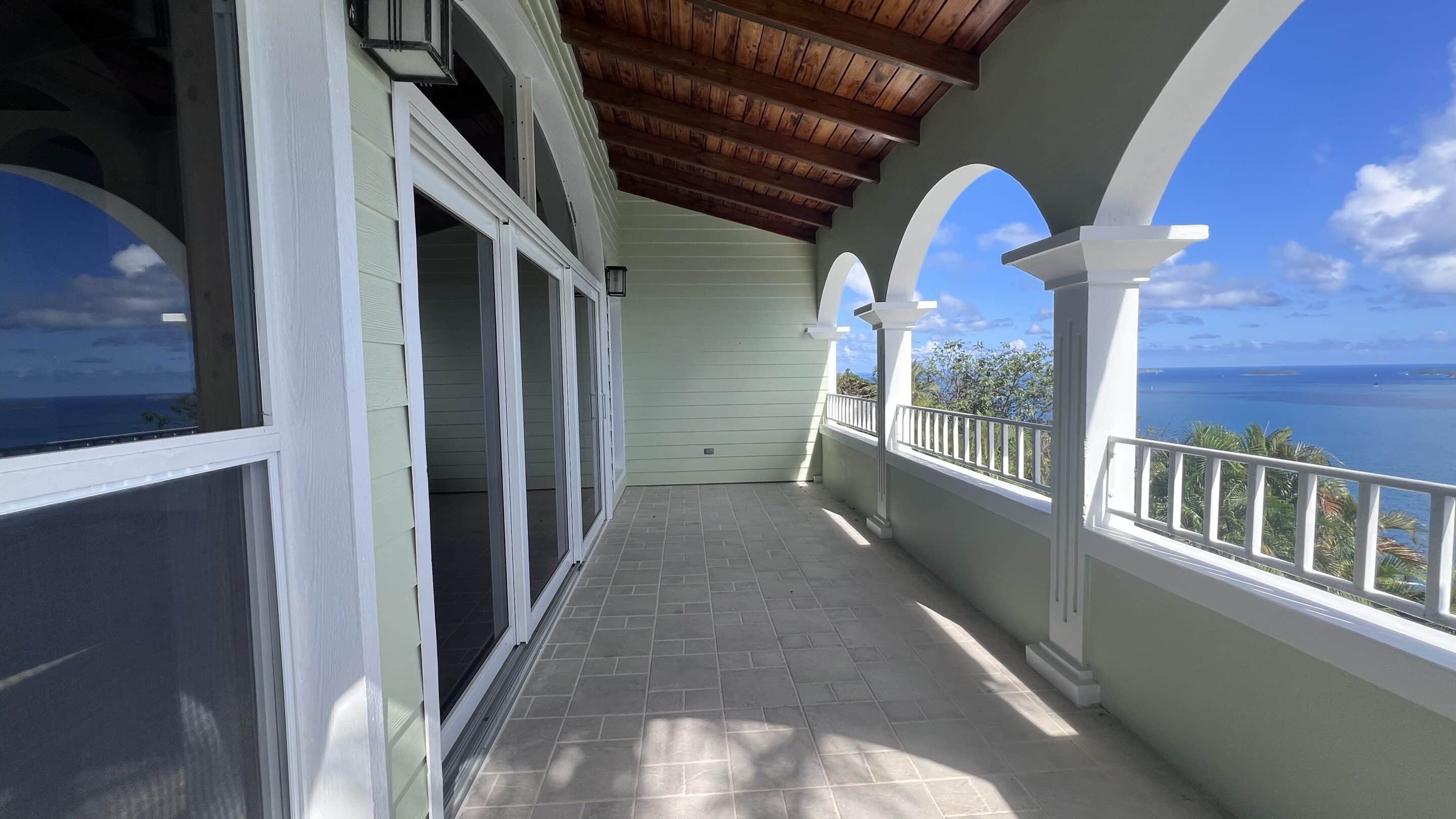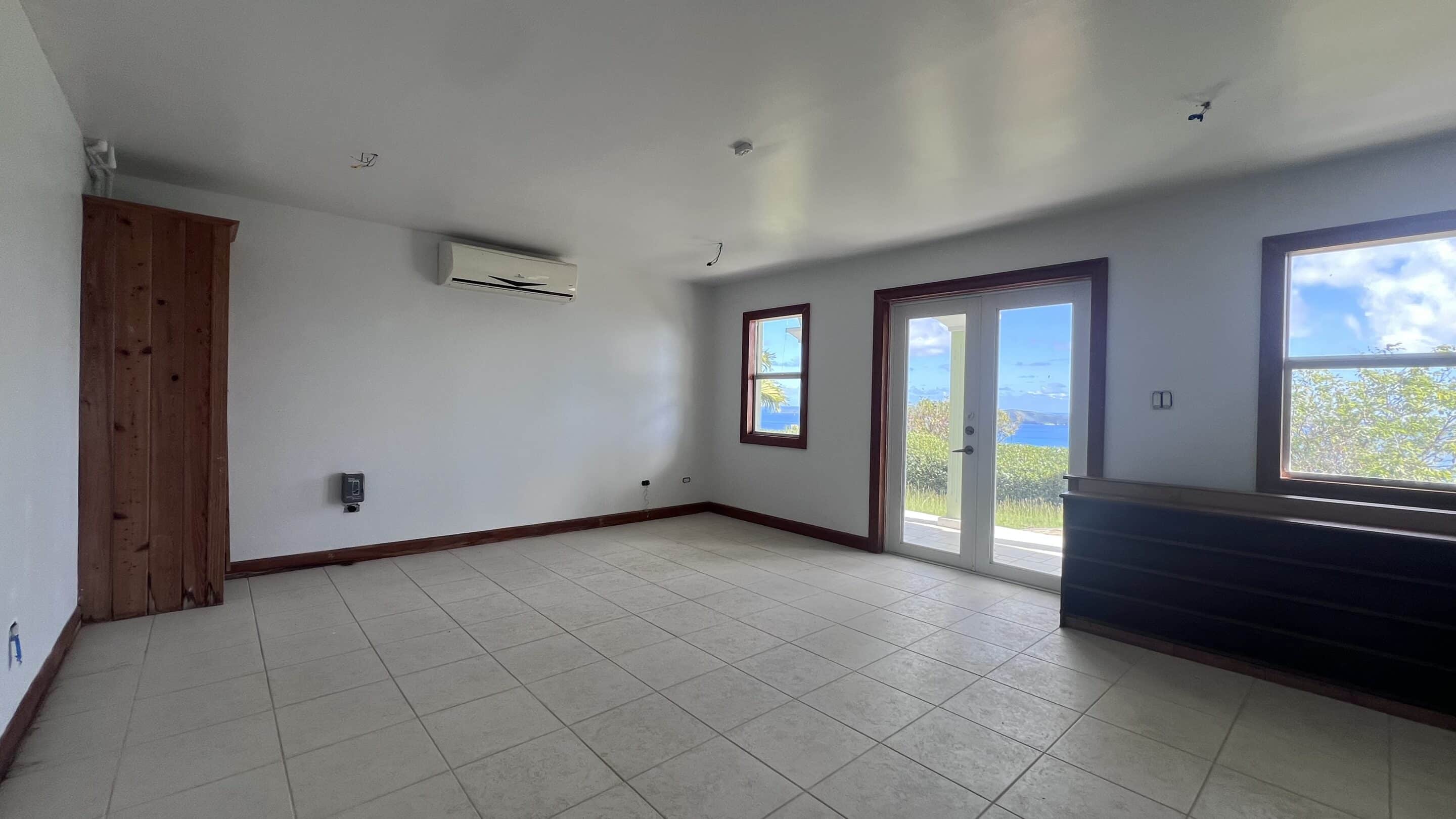 A built-in library adds character and warmth, while multiple doors open onto covered balconies, the pool terrace, and sundeck—framing sweeping views across the southern cays. To the left of the kitchen, suite offers a walk-in pantry, spacious washroom, and an ensuite bathroom complete with bathtub and separate shower. To the right, two additional air-conditioned bedrooms with ensuite bathrooms are complemented by a dedicated home office.