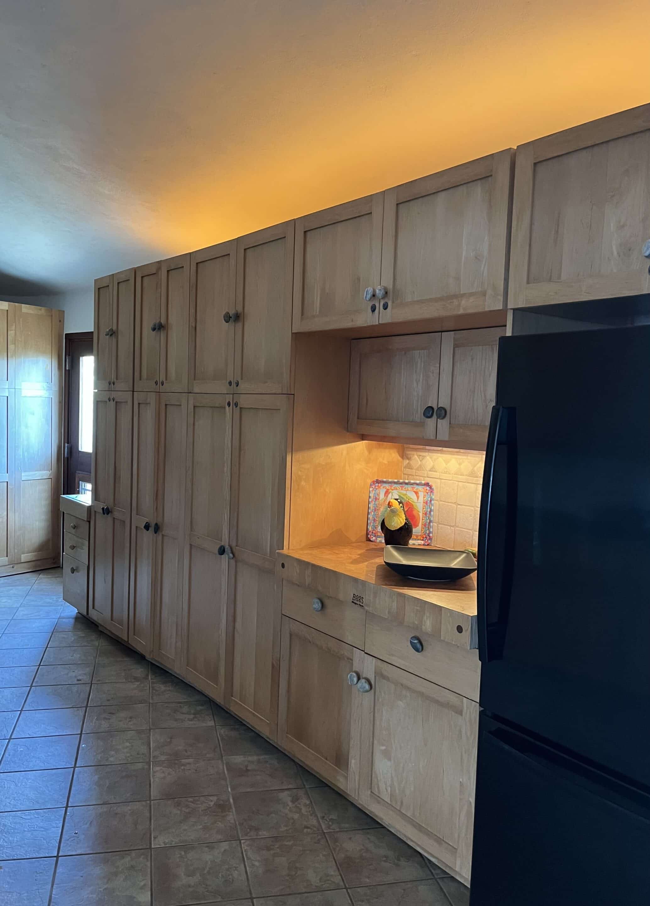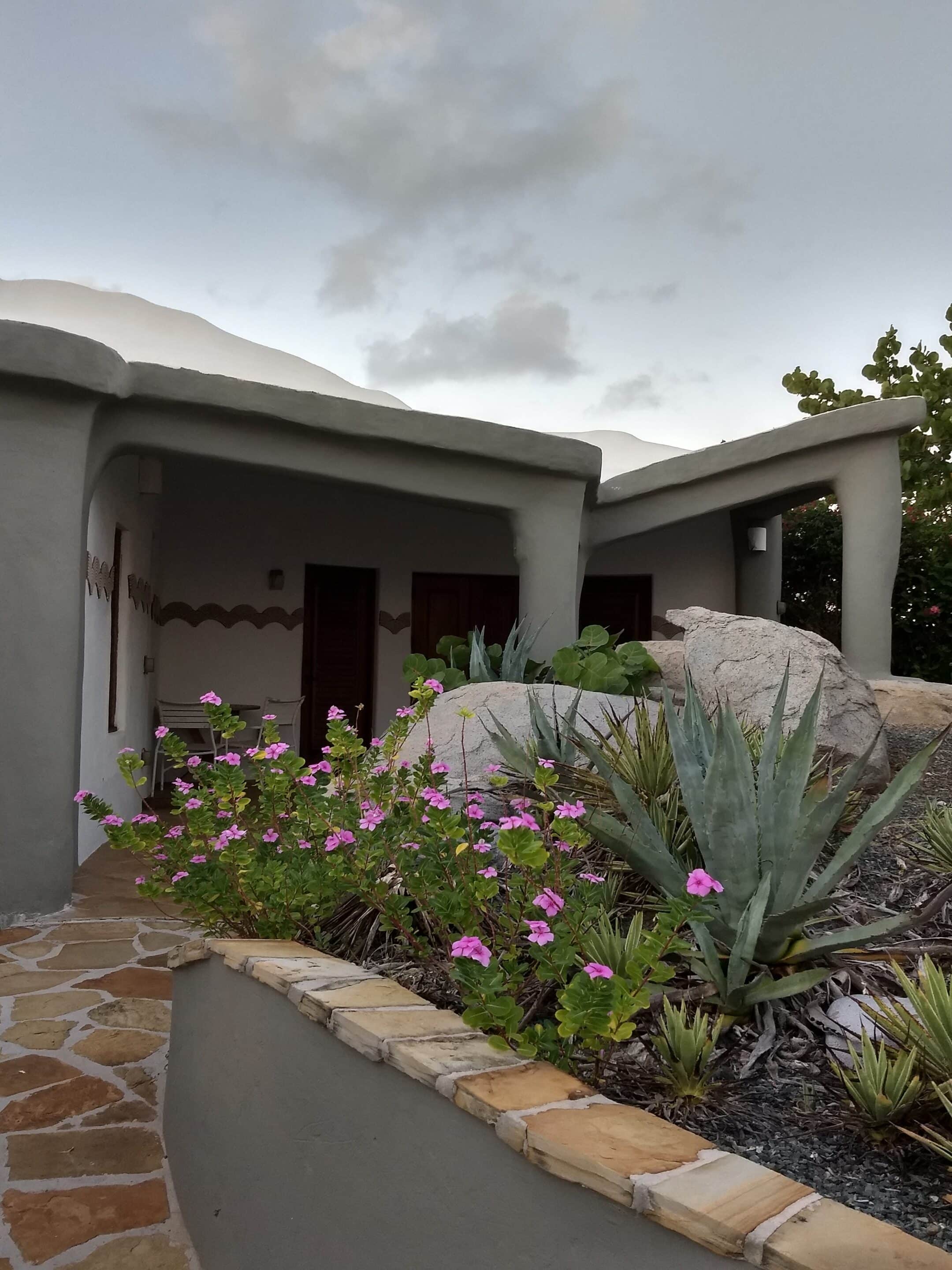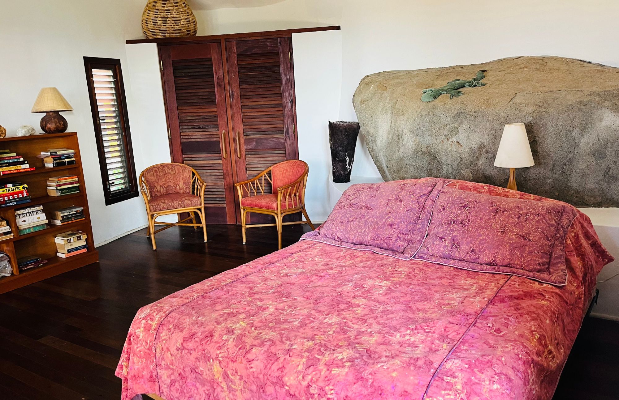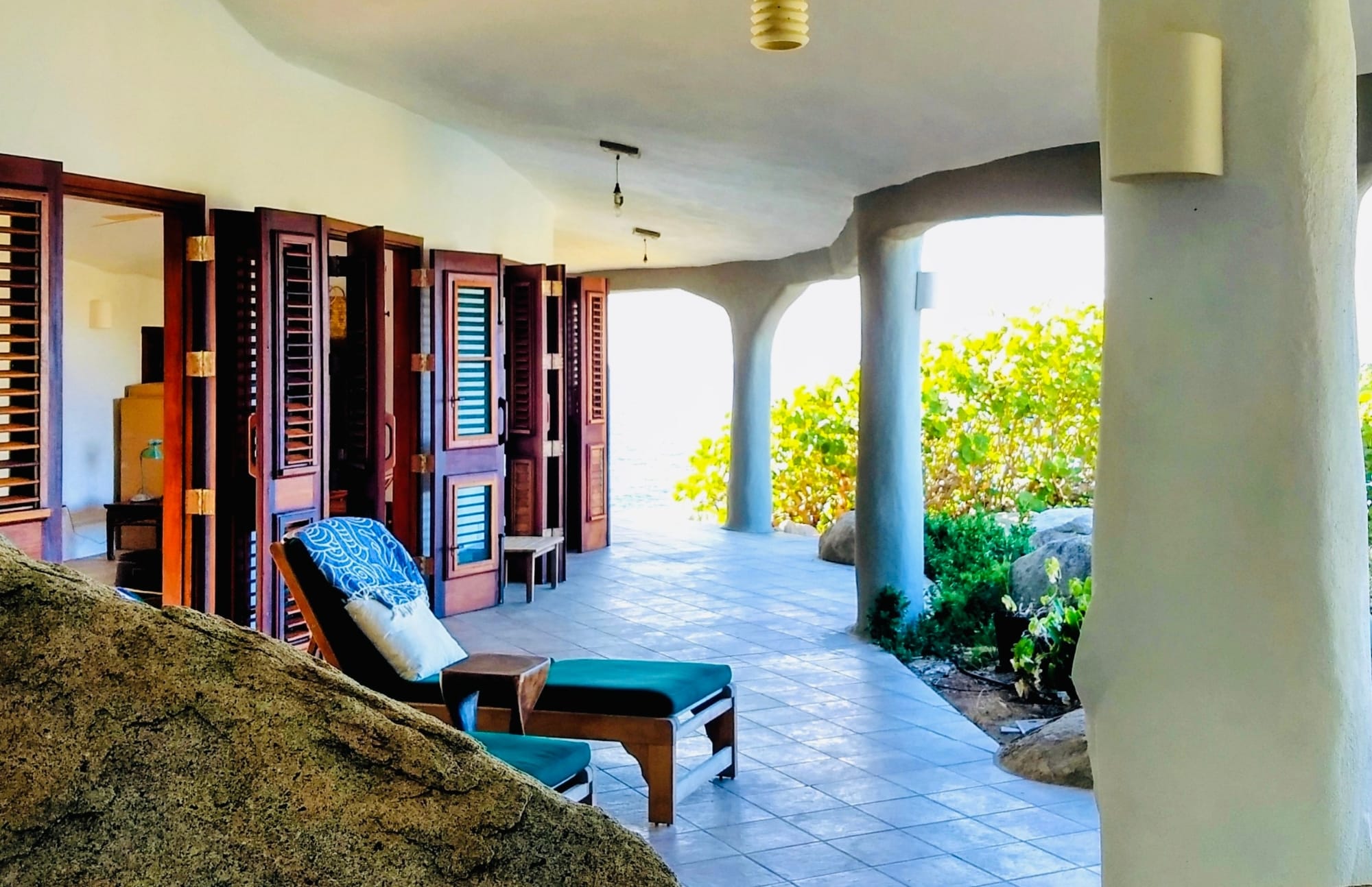 Crafted for longevity, the home is built entirely of heavily reinforced concrete—roof and walls—some of which incorporate natural boulders in place. The plastered concrete ceilings gently curve to follow the roofline, adding both strength and style. Solid mahogany doors and shutters with Rocky Mountain bronze hardware secure the openings. The master bedroom and study feature rich Ipe hardwood flooring, while the remaining rooms are finished in porcelain tile, custom-cut around natural stone formations. Areas where moisture is expected transition to imported flagstone for added safety and comfort.