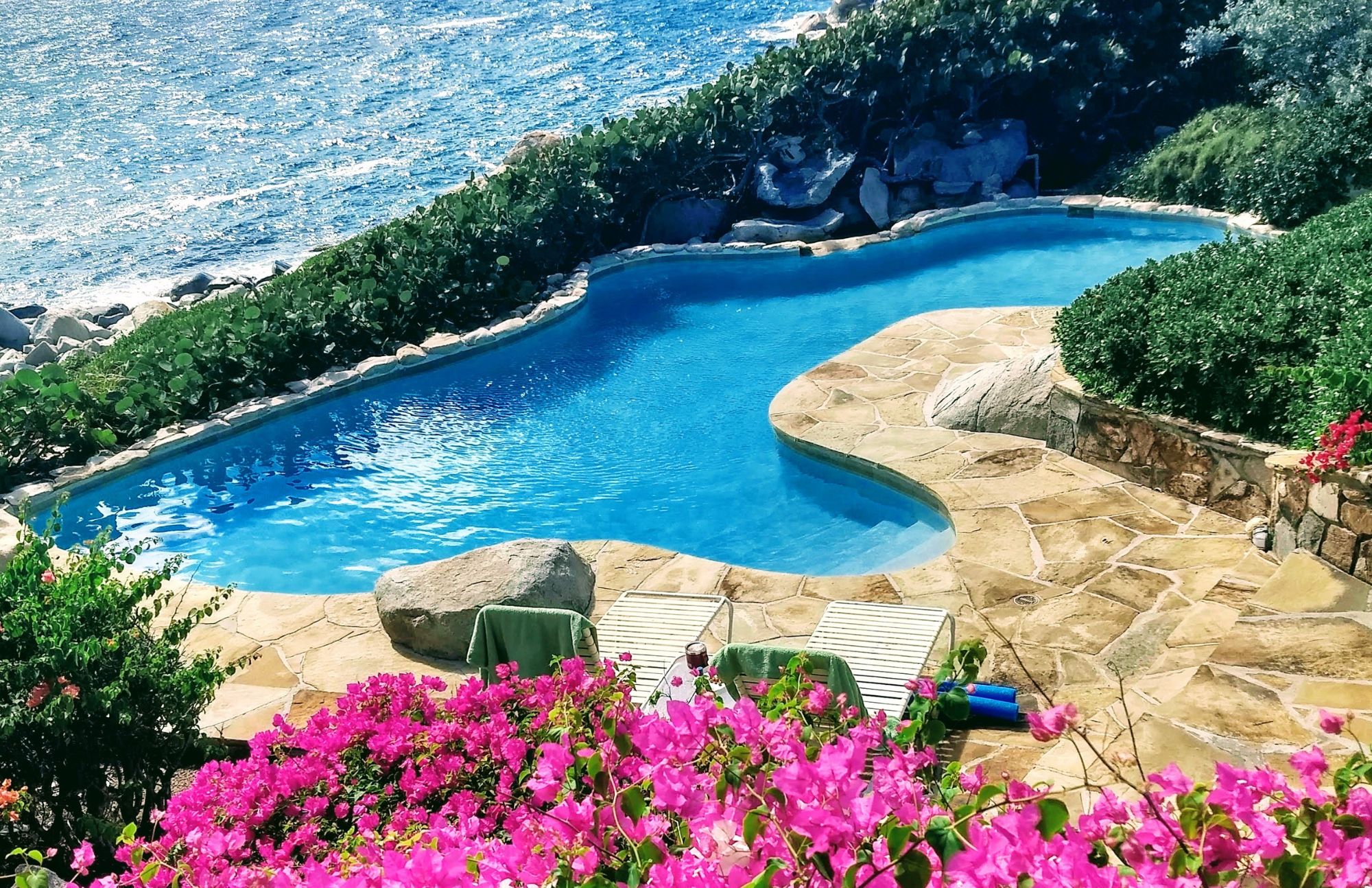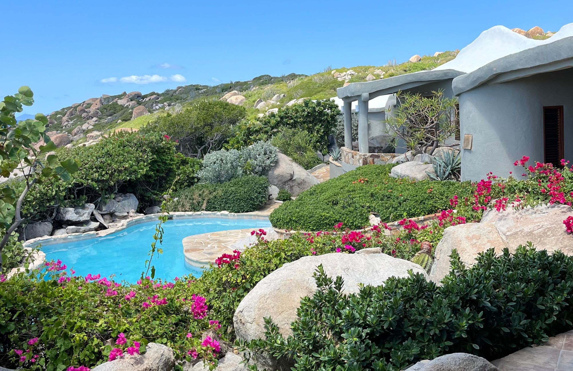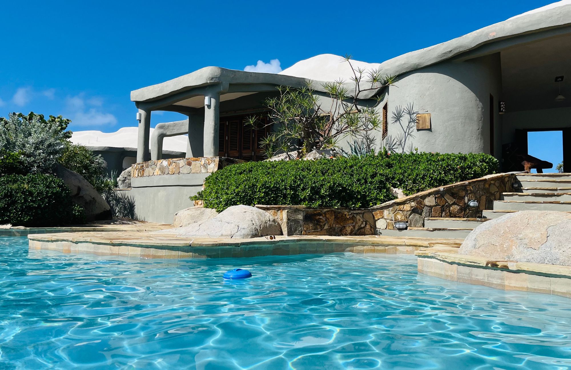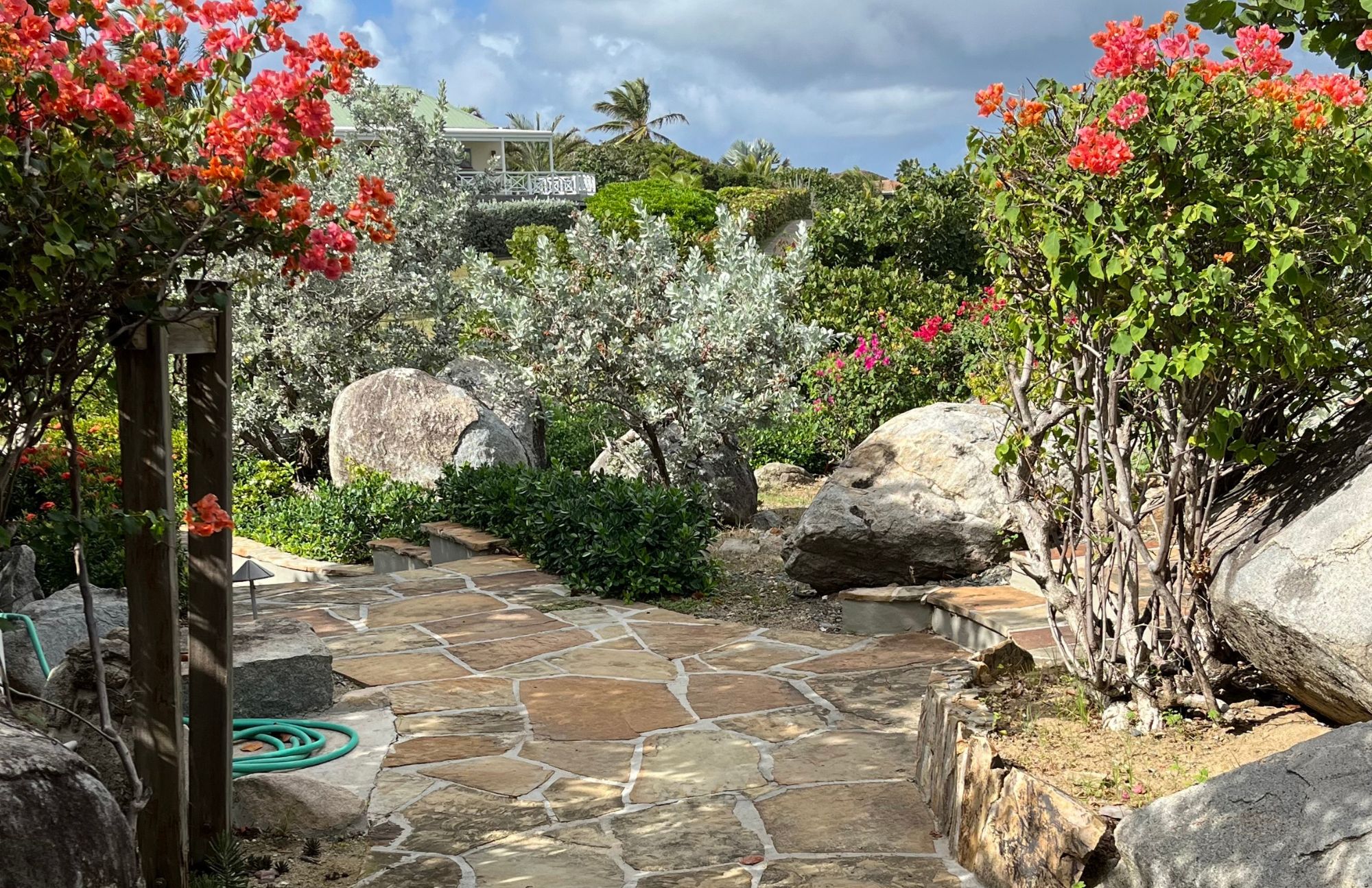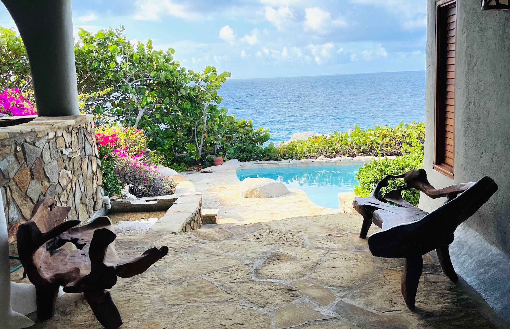 Though just a short walk from The Baths, the home is completely private and hidden from public view. A shaded carport and welcoming pathway lead to the front gate; beyond it, the house opens toward sweeping ocean vistas. Thoughtfully angled wings shelter the terrace, and frame panoramic views of the deep, shaded porch, the pool, and the dramatic boulder-strewn shoreline. No neighboring homes interrupt the landscape—or the quiet.