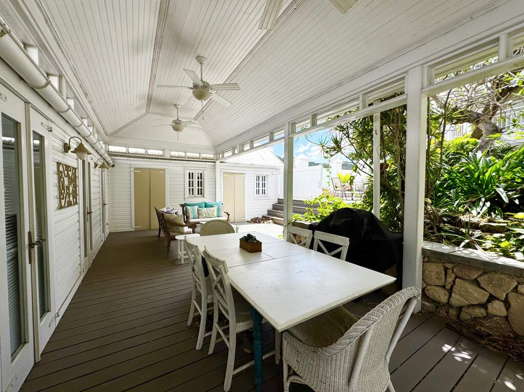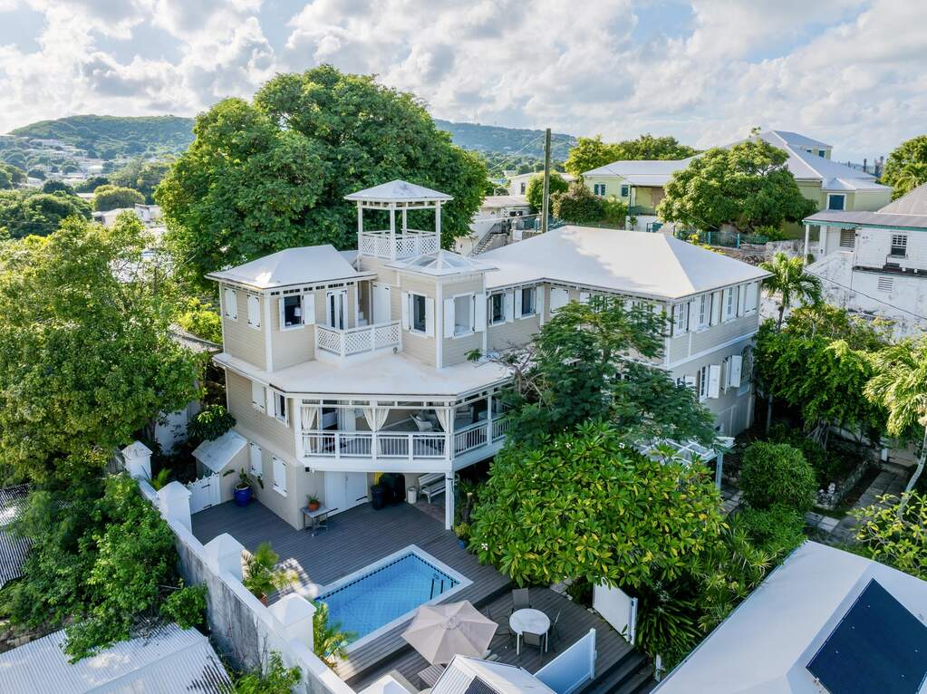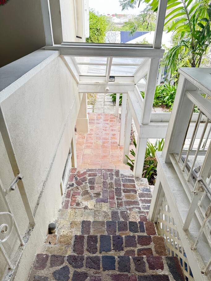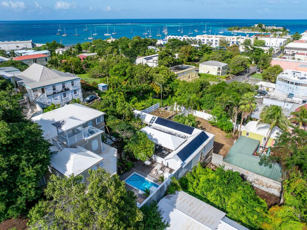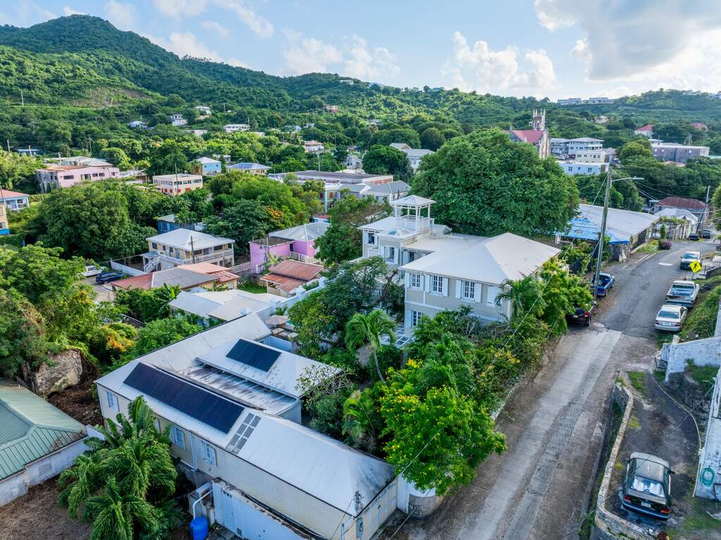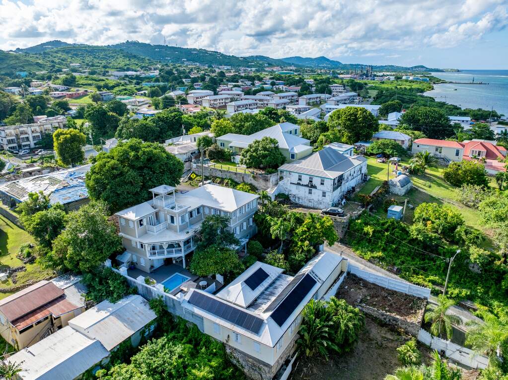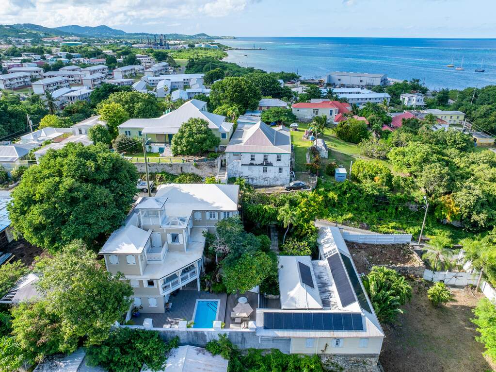 A rare walled historic estate with harbor views located in the heart of Christiansted. Anchored by a five bedroom 4 bathroom main residence showcasing classic Danish West Indian architecture, the estate also includes a separate 1 bedroom 1 bathroom 18th-century guest cottage and multiple parcels that offer exceptional flexibility and development potential. Enclosed by tall masonry walls and centered around a lush tropical courtyard and pool, the property provides an uncommon level of privacy and tranquility for an in town historic offering. This grand historic main residence reflects classic Caribbean craftsmanship dating to the early 1800s. Distinctive features include reclaimed ship timbers used as structural floor joists, ballast-brick staircases, five French doors encircling the living room, a signature Captain's Watch, a tiled front porch entry with classic rocking chairs, and an expansive veranda overlooking the harbor. Recently refinished living room floors and split-system air conditioning enhance everyday comfort while preserving the home's historic character. A poolside tool/workroom with plumbing offers the opportunity to create an additional guest suite. Rare for in-town Christiansted properties, the estate also includes two garages and valuable off-street parking. Set across multiple parcels, this rare in-town landholding includes a separate 18th-century guest cottage of approximately 1,000 square feet, along with an additional large walled and gated lot currently utilized for parking. The lot features historic ruins, an 18th-century foundation and cistern, and architectural plans available for further development, while currently providing additional off-street parking. In total, the property offers more than 6,000 square feet of flexible space, allowing for a wide range of residential, hospitality, or commercial configurations. Located within an Enterprise Development Zone, the property may qualify for meaningful tax incentives, positioning it as both a lifestyle investment and a strategic business opportunity. Zoned B-2, the property lends itself to numerous commercial or mixed-use options. Possibilities include a boutique hotel, bed-and-breakfast, spa, medical or professional offices, gallery, retail space, or restaurant. The guest cottage has operated successfully as an Airbnb for many years and offers excellent potential for hospitality or dining use while maintaining the main residence for private living, or vice versa. Its proven short-term rental history further underscores the income potential. Modern upgrades complement the historic character throughout the property. Substantial structural and cosmetic improvements have been completed, along with nearly all-new appliances and air-conditioning systems. The kitchen features a Smeg gas range with pot filler, ventilation hood, and adjoining walk-in pantry. The spacious primary suite includes double walk-in closets and a large open primary bath with skylight and a spa soaking tub with new pump. Outdoor spaces are equally compelling. Between the main residence and guest cottage lies an exceptional private tropical courtyard centered around the pool, with the two residences gracefully framing the space while maintaining privacy from one another. Extensive Trex decking surrounds the pool and extends along the walkway to the cottage, enhancing the courtyard setting and creating a seamless indoor-outdoor living experience. The courtyard also features a separate street entrance, providing convenient access and additional flexibility for guests or boutique hospitality use. The entire compound is enclosed by tall masonry walls, reinforcing the privacy and seclusion rarely found in an in-town property. Energy and infrastructure upgrades add further value and resilience. Solar panels with dual Power walls supply a substantial portion of the main home's power, supported by separate generators for each residence. Independent cisterns, UV filtration systems, tankless water heaters with electric backup, separate meters, and a wireless cistern monitoring system provide efficiency and reliability.