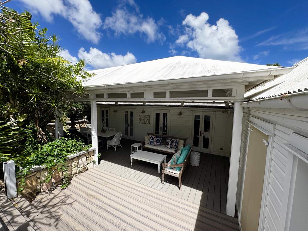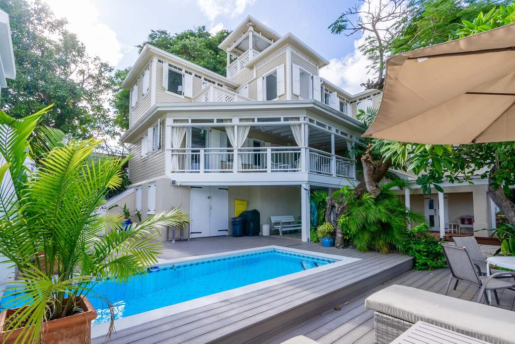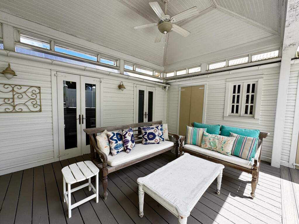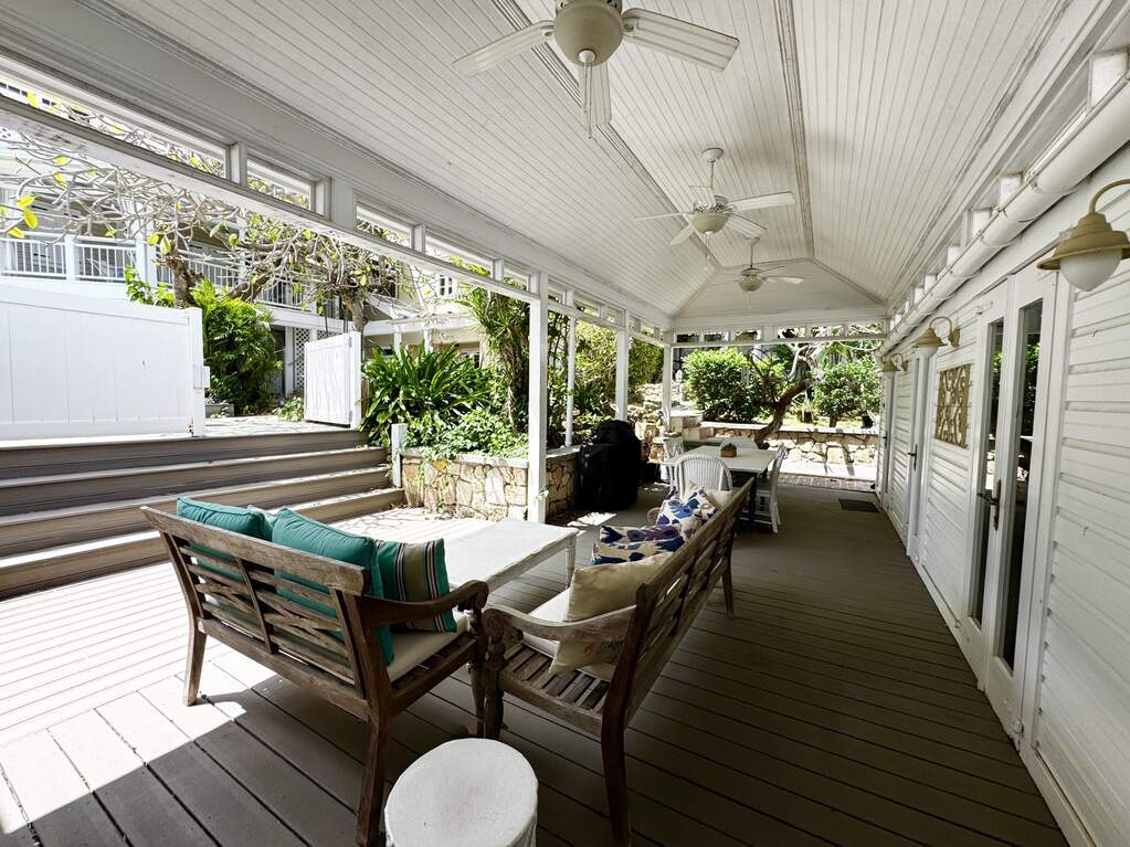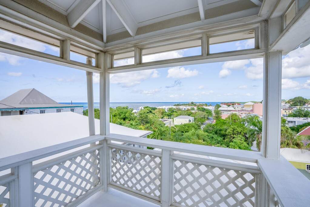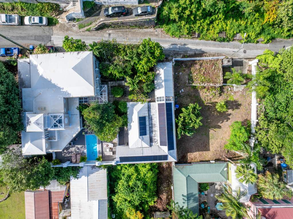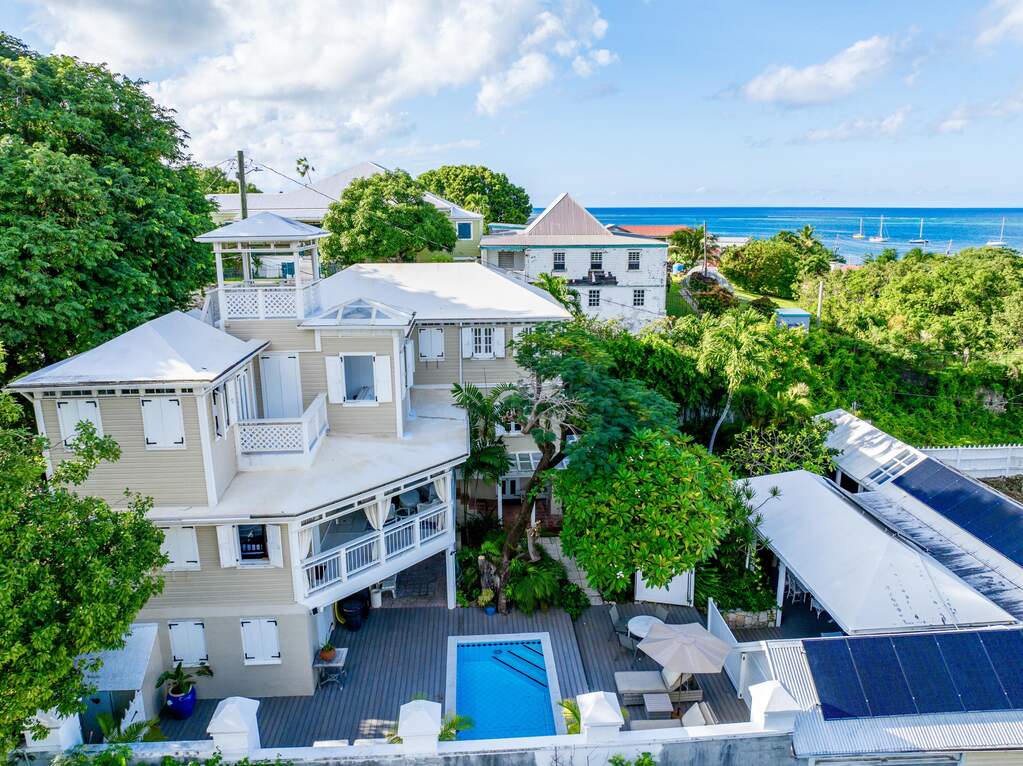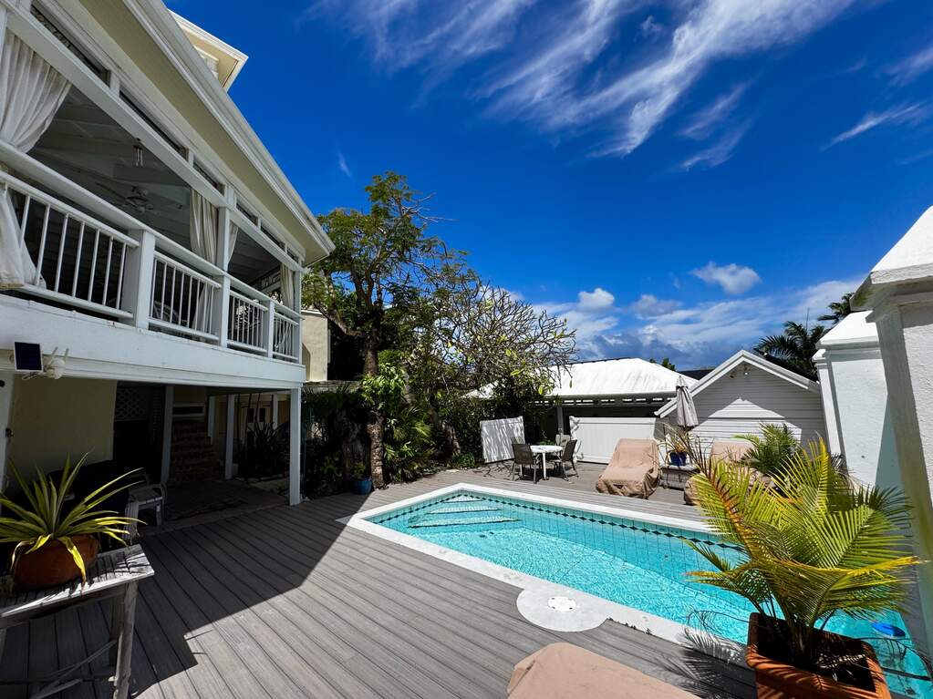 A rare walled historic estate with harbor views located in the heart of Christiansted. Anchored by a five bedroom 4 bathroom main residence showcasing classic Danish West Indian architecture, the estate also includes a separate 1 bedroom 1 bathroom 18th-century guest cottage and multiple parcels that offer exceptional flexibility and development potential. Enclosed by tall masonry walls and centered around a lush tropical courtyard and pool, the property provides an uncommon level of privacy and tranquility for an in town historic offering. This grand historic main residence reflects classic Caribbean craftsmanship dating to the early 1800s. Distinctive features include reclaimed ship timbers used as structural floor joists, ballast-brick staircases, five French doors encircling the living room, a signature Captain's Watch, a tiled front porch entry with classic rocking chairs, and an expansive veranda overlooking the harbor. Recently refinished living room floors and split-system air conditioning enhance everyday comfort while preserving the home's historic character. A poolside tool/workroom with plumbing offers the opportunity to create an additional guest suite. Rare for in-town Christiansted properties, the estate also includes two garages and valuable off-street parking. Set across multiple parcels, this rare in-town landholding includes a separate 18th-century guest cottage of approximately 1,000 square feet, along with an additional large walled and gated lot currently utilized for parking. The lot features historic ruins, an 18th-century foundation and cistern, and architectural plans available for further development, while currently providing additional off-street parking. In total, the property offers more than 6,000 square feet of flexible space, allowing for a wide range of residential, hospitality, or commercial configurations. Located within an Enterprise Development Zone, the property may qualify for meaningful tax incentives, positioning it as both a lifestyle investment and a strategic business opportunity. Zoned B-2, the property lends itself to numerous commercial or mixed-use options. Possibilities include a boutique hotel, bed-and-breakfast, spa, medical or professional offices, gallery, retail space, or restaurant. The guest cottage has operated successfully as an Airbnb for many years and offers excellent potential for hospitality or dining use while maintaining the main residence for private living, or vice versa. Its proven short-term rental history further underscores the income potential. Modern upgrades complement the historic character throughout the property. Substantial structural and cosmetic improvements have been completed, along with nearly all-new appliances and air-conditioning systems. The kitchen features a Smeg gas range with pot filler, ventilation hood, and adjoining walk-in pantry. The spacious primary suite includes double walk-in closets and a large open primary bath with skylight and a spa soaking tub with new pump. Outdoor spaces are equally compelling. Between the main residence and guest cottage lies an exceptional private tropical courtyard centered around the pool, with the two residences gracefully framing the space while maintaining privacy from one another. Extensive Trex decking surrounds the pool and extends along the walkway to the cottage, enhancing the courtyard setting and creating a seamless indoor-outdoor living experience. The courtyard also features a separate street entrance, providing convenient access and additional flexibility for guests or boutique hospitality use. The entire compound is enclosed by tall masonry walls, reinforcing the privacy and seclusion rarely found in an in-town property. Energy and infrastructure upgrades add further value and resilience. Solar panels with dual Power walls supply a substantial portion of the main home's power, supported by separate generators for each residence. Independent cisterns, UV filtration systems, tankless water heaters with electric backup, separate meters, and a wireless cistern monitoring system provide efficiency and reliability.